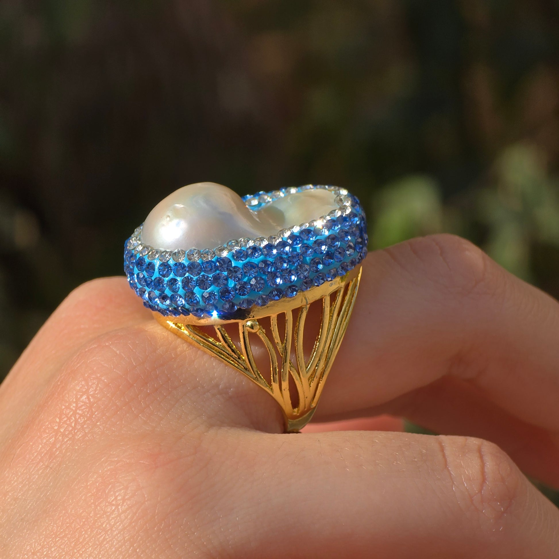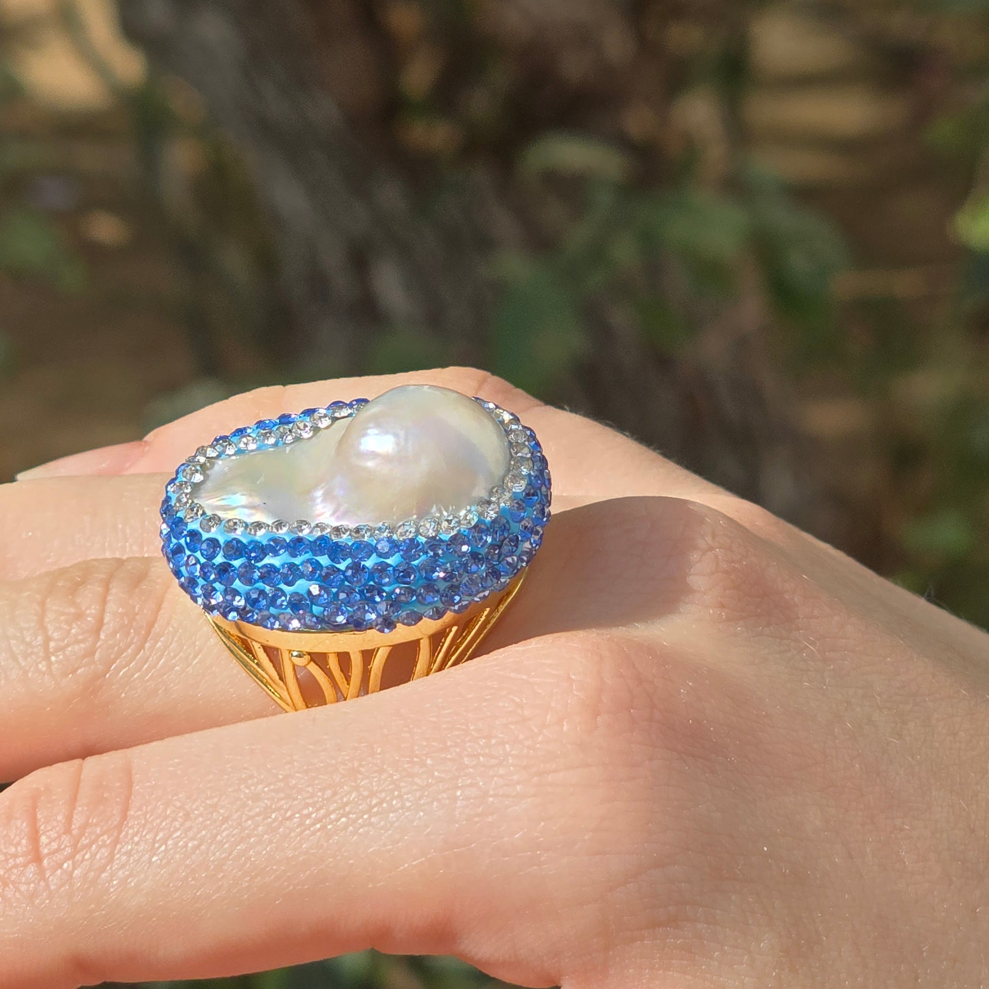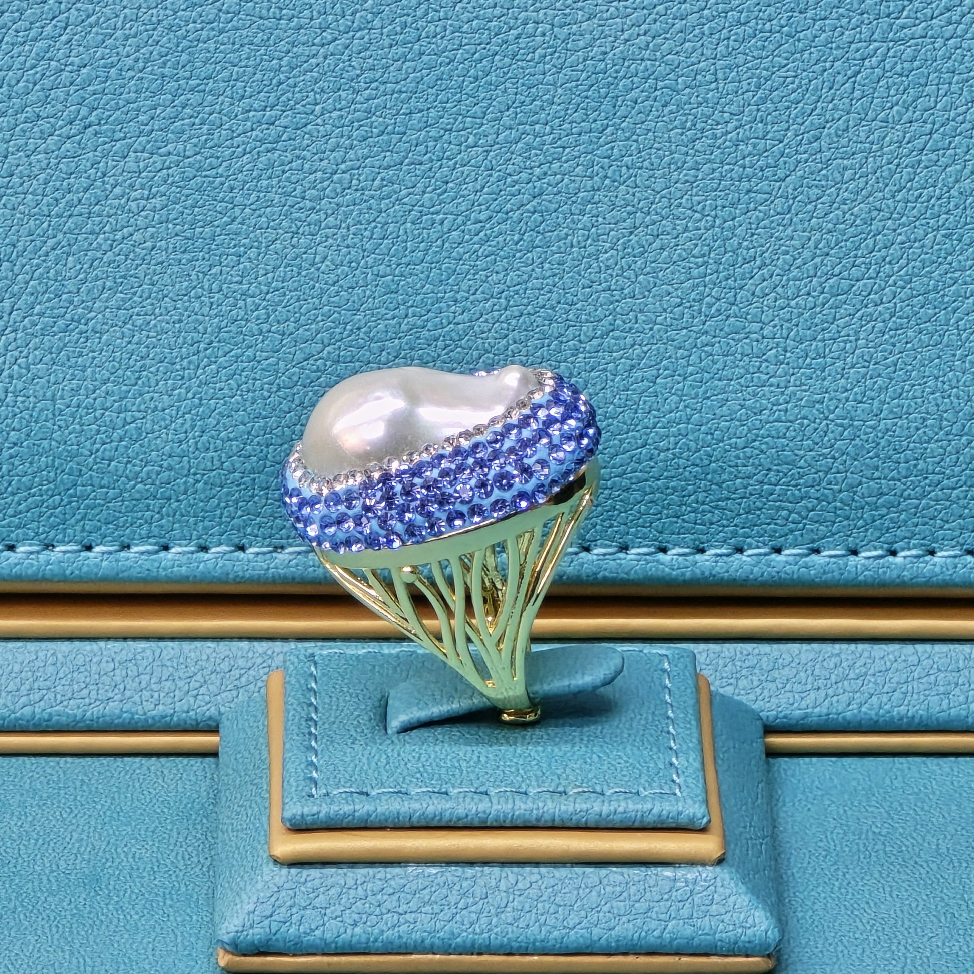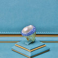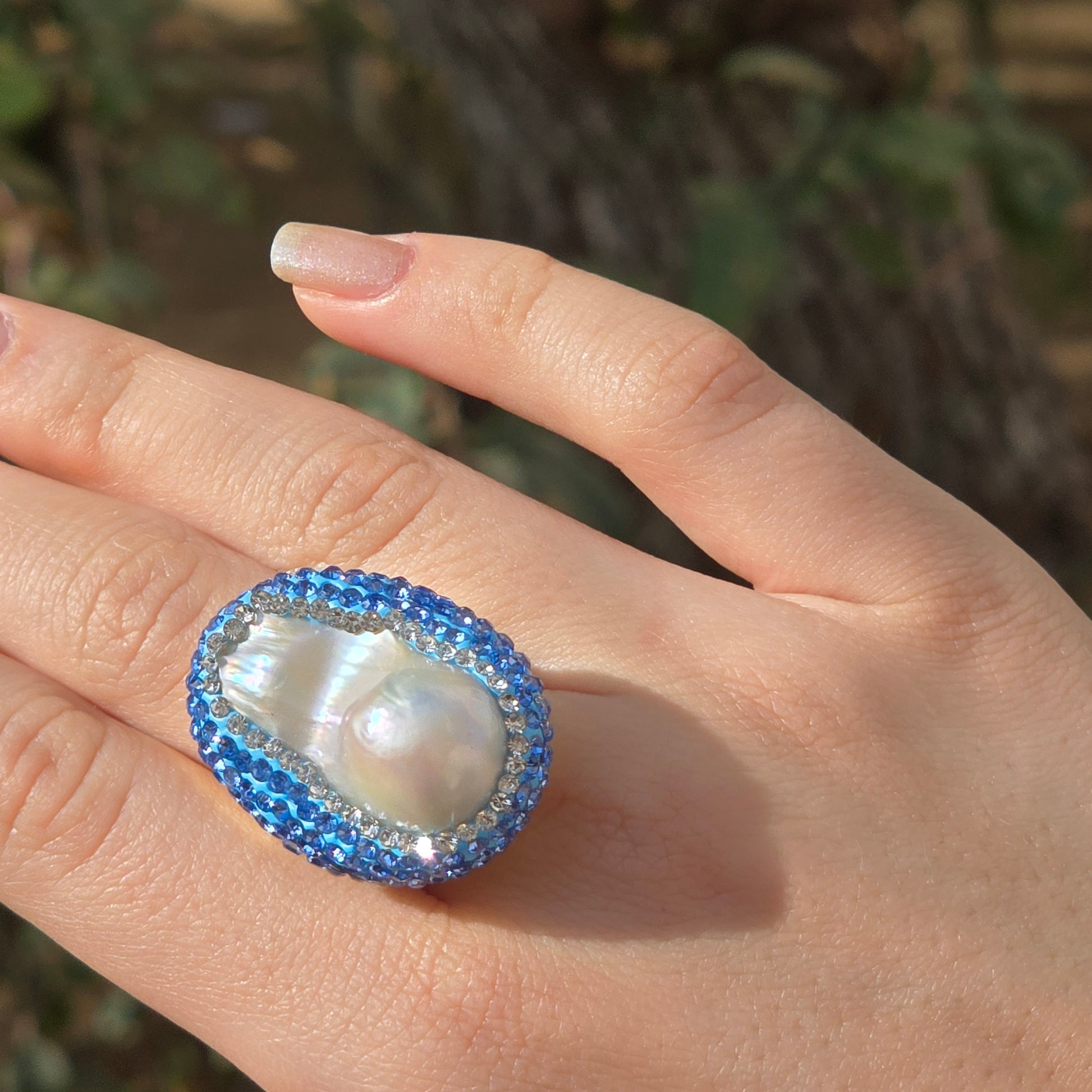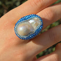 خاتم لؤلؤ باروكي مرصع بكريستالات نمساوية زرقاء فاتحة
