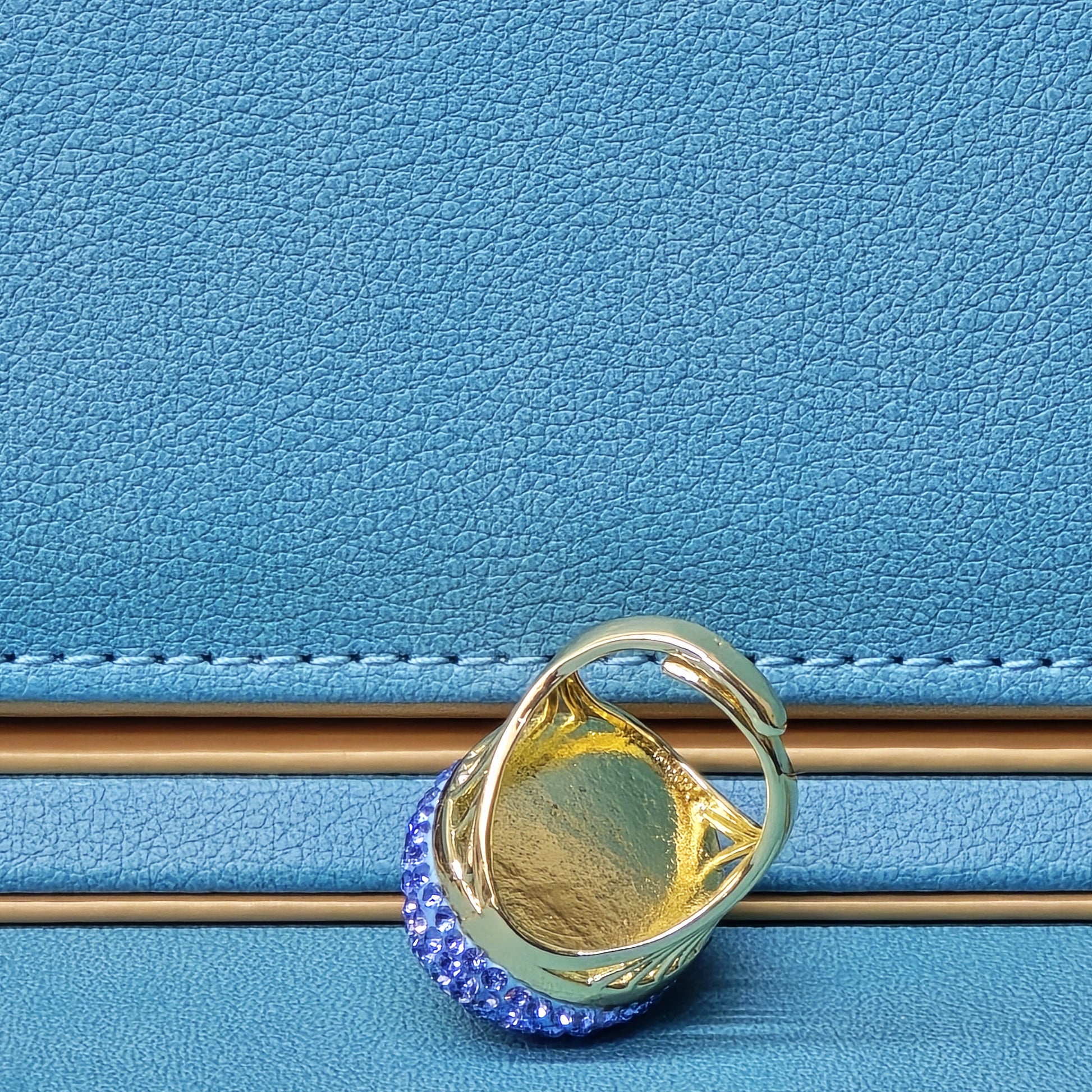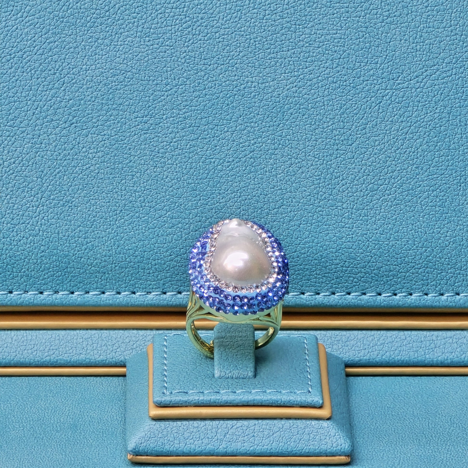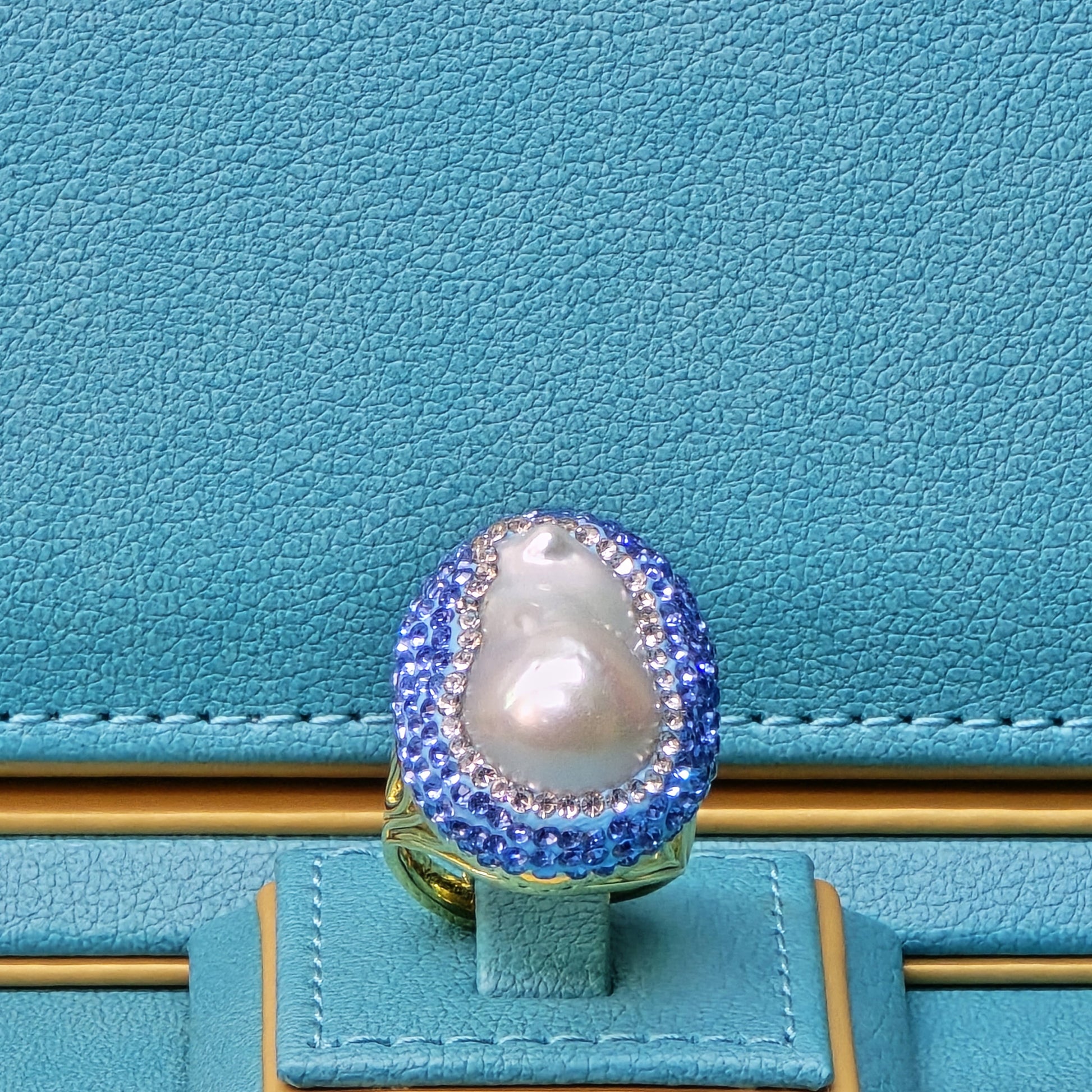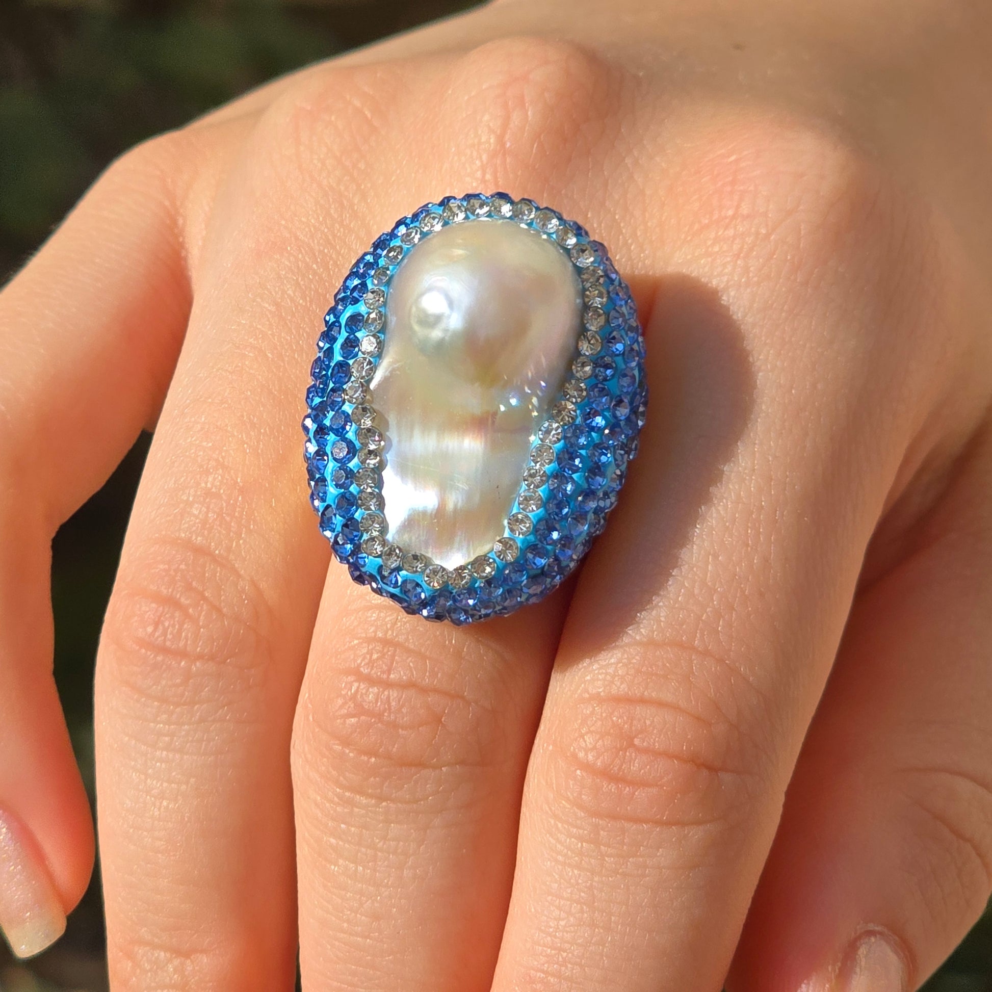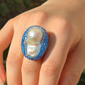 خاتم لؤلؤ باروكي مرصع بكريستالات نمساوية زرقاء فاتحة