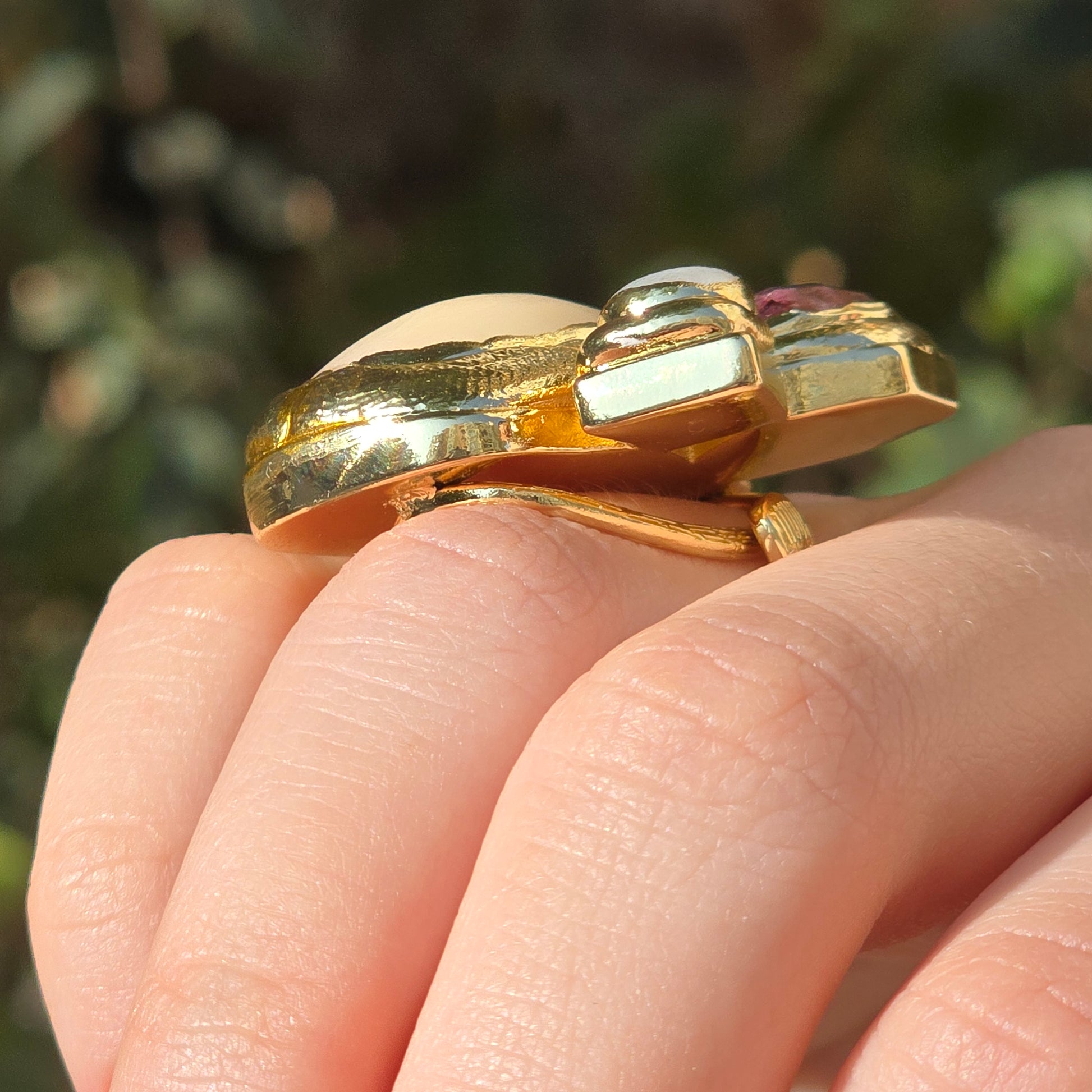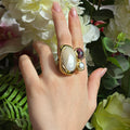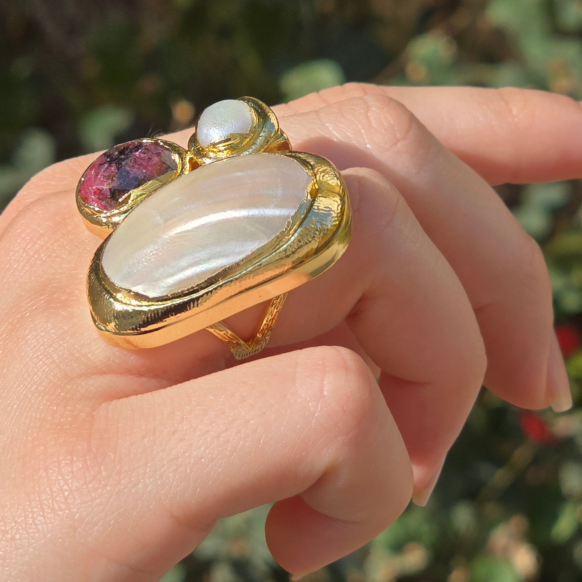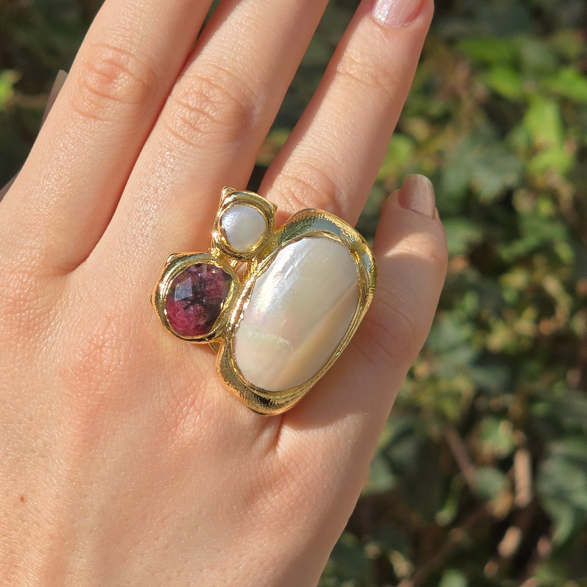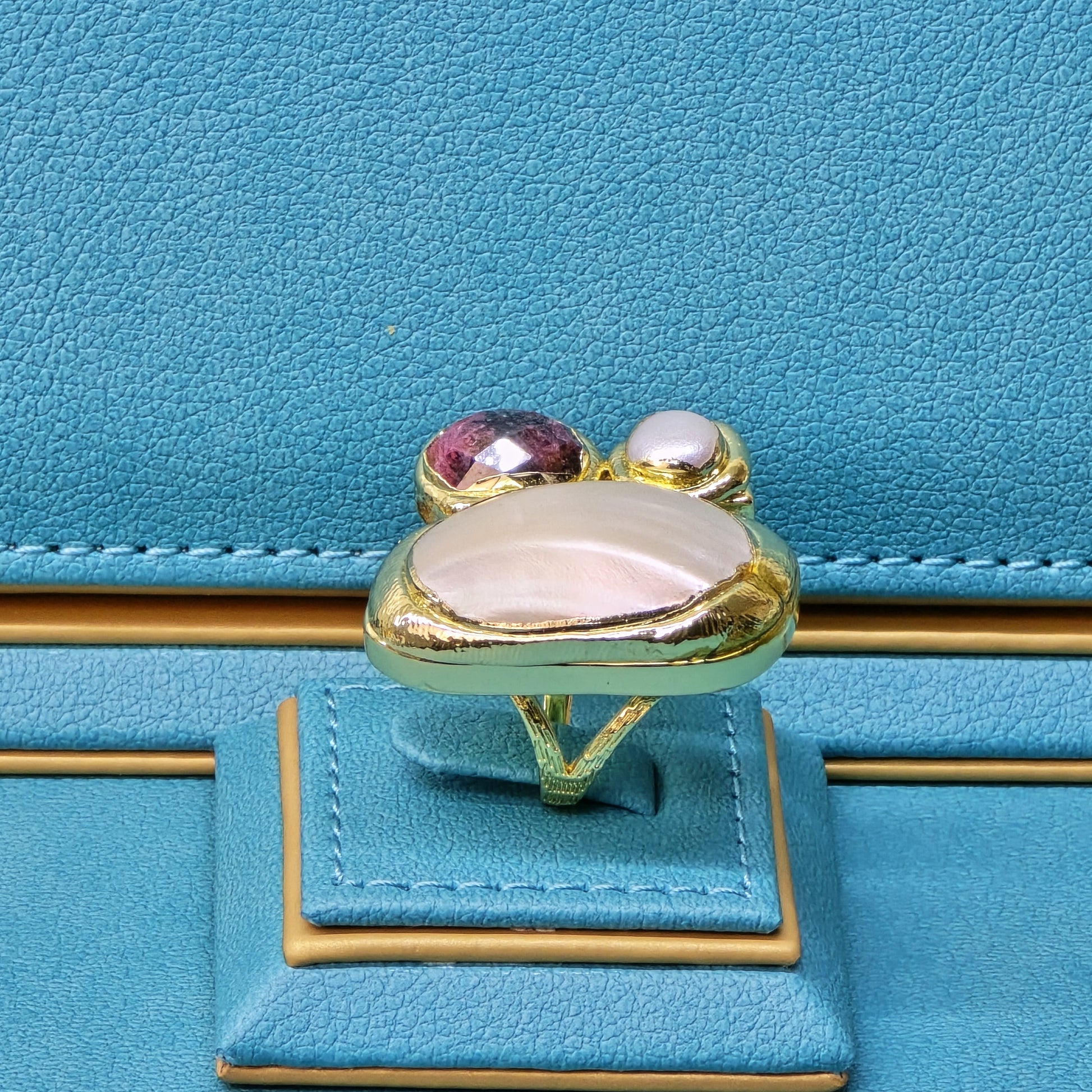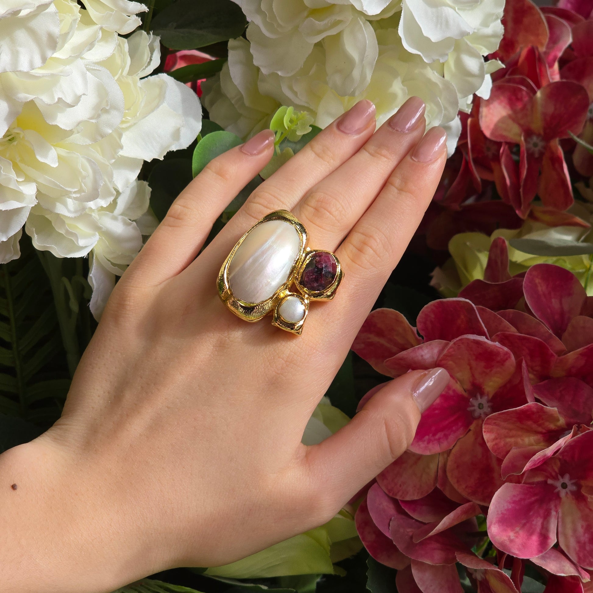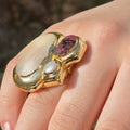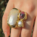 خاتم من عرق اللؤلؤ مع ياقوت خام متعدد الأوجه ولؤلؤ المياه العذبة