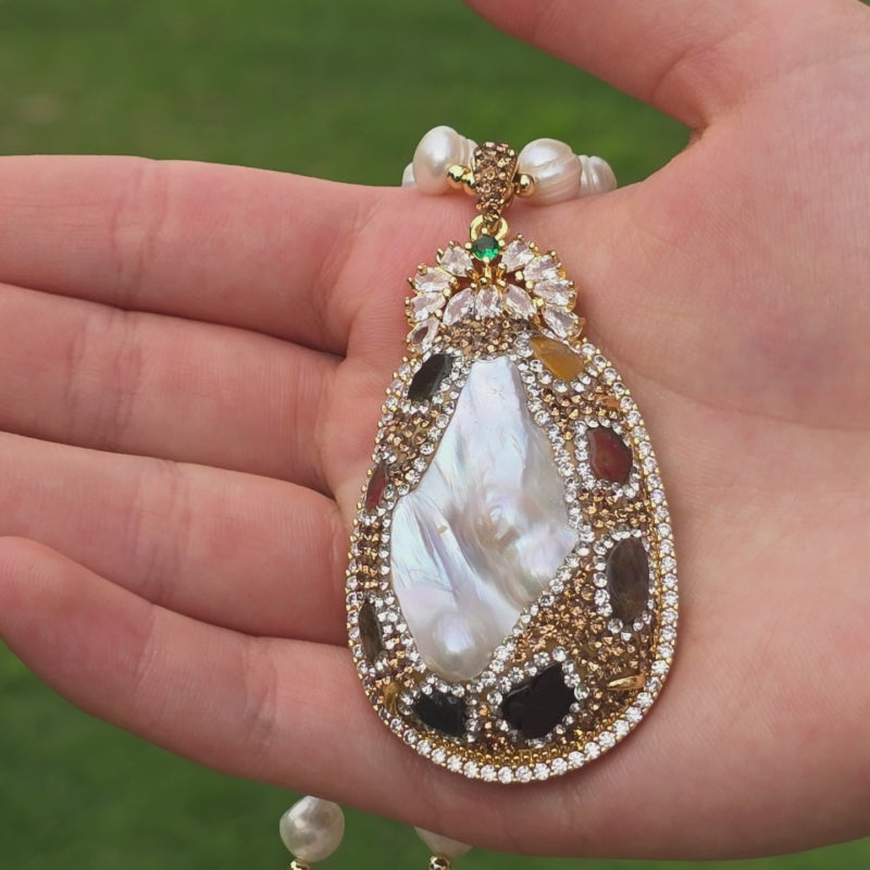 Elegant Necklace with Baroque Pearl, Austrian Crystals, Tourmaline, and Zirconia