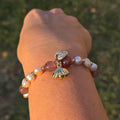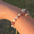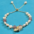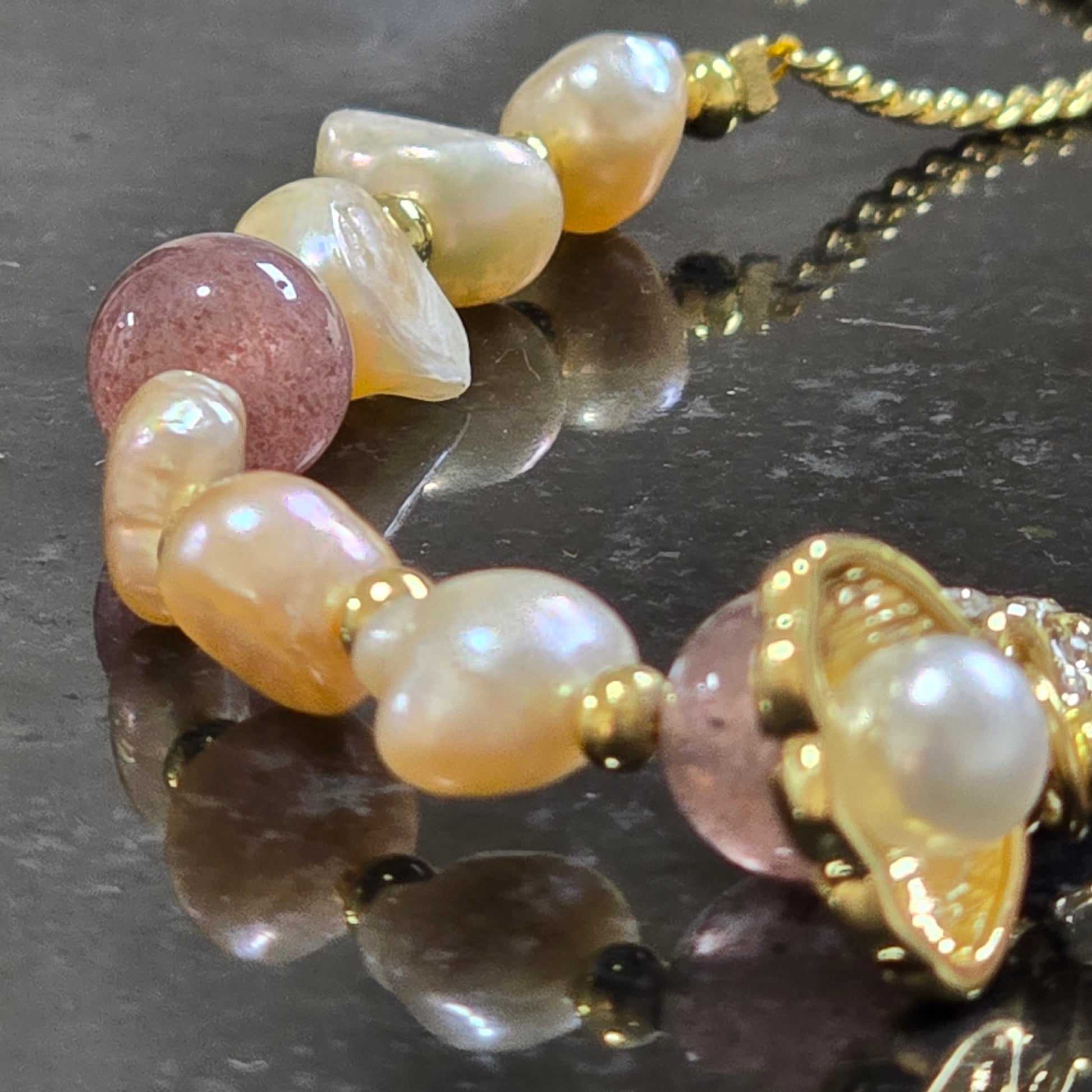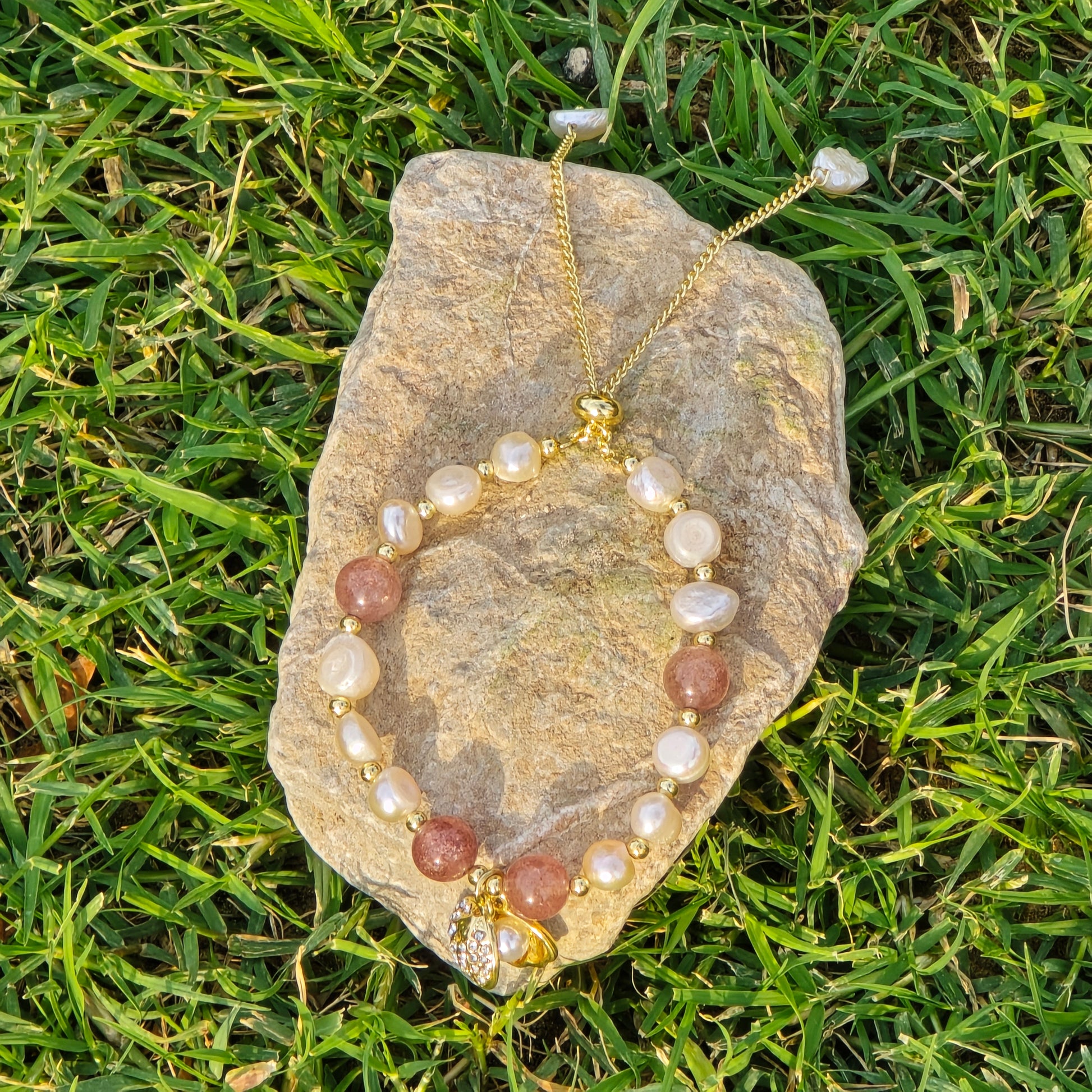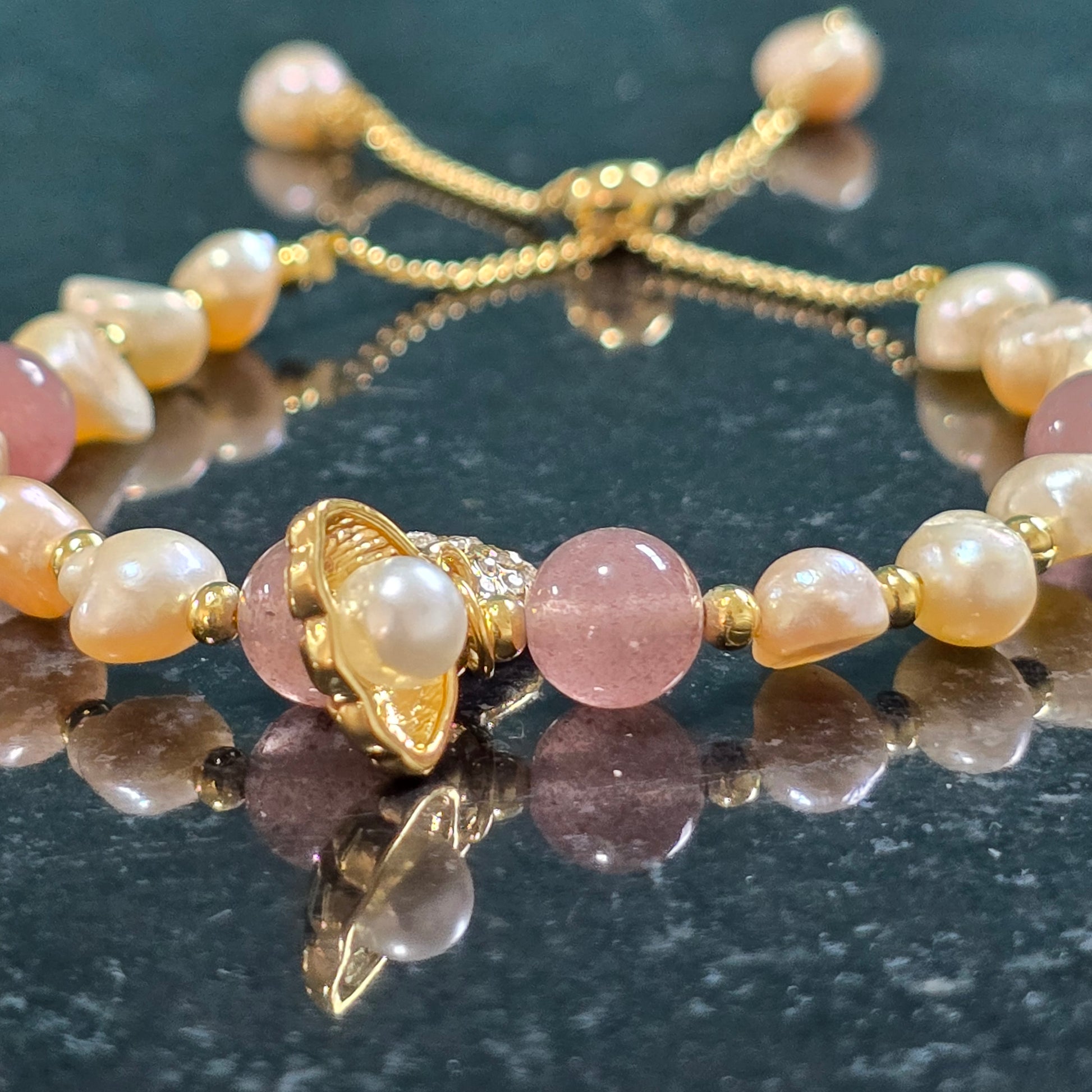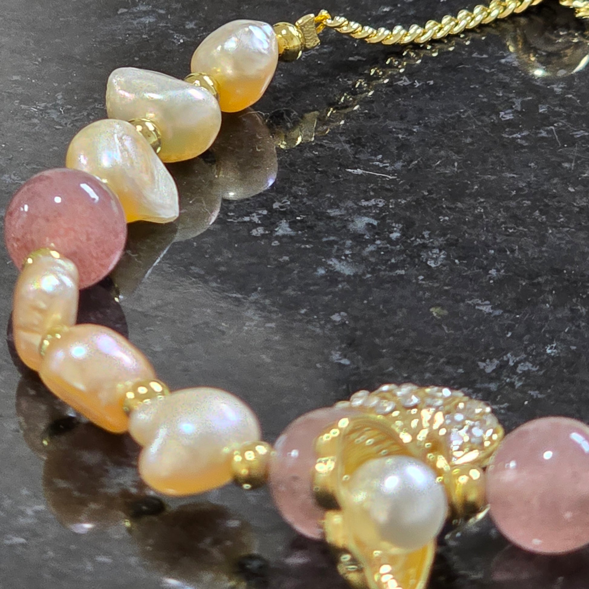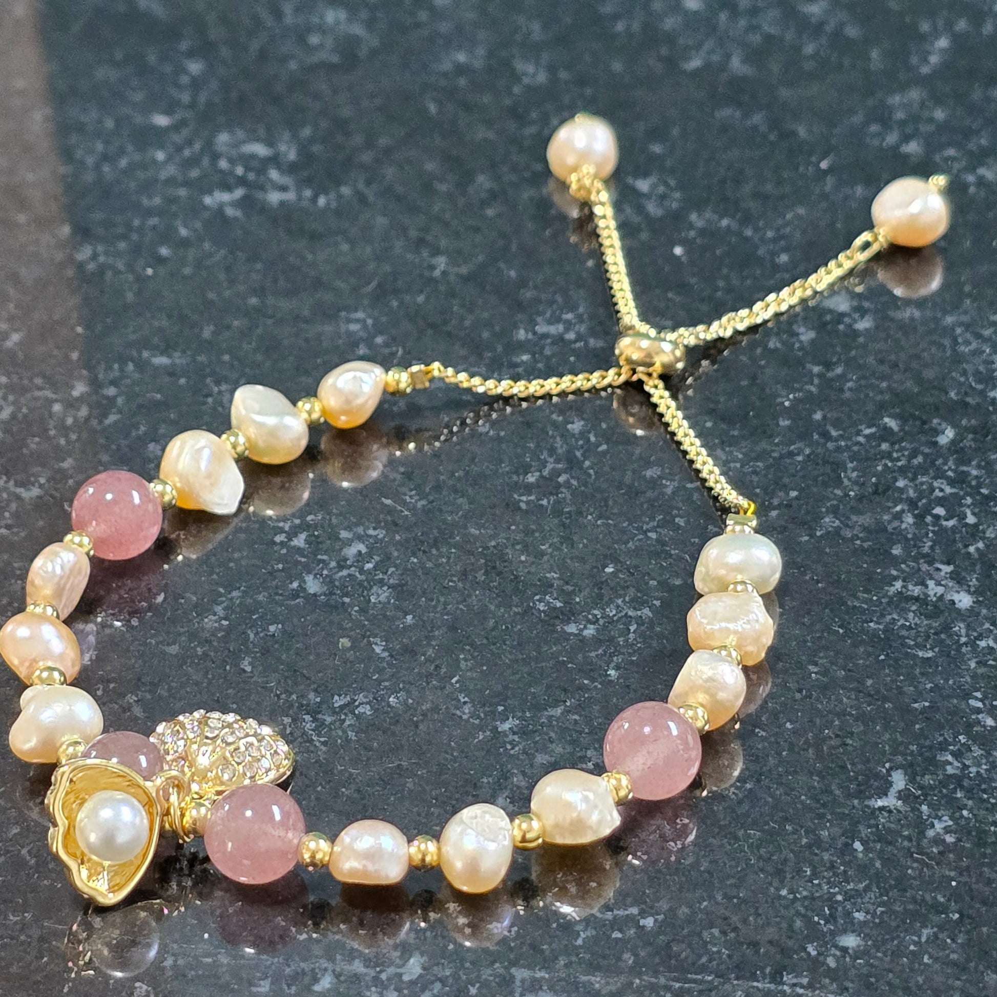 Soft peach freshwater pearls and pink agate beads come together in this elegant gold-plated stainless steel bracelet. A delicate open shell charm, sparkling with white CZ crystals, adds a hint of ocean magic. Designed with a slider opening for the perfect fit, this bracelet is both stylish and effortless to wear. A must-have for any jewelry lover! 💖