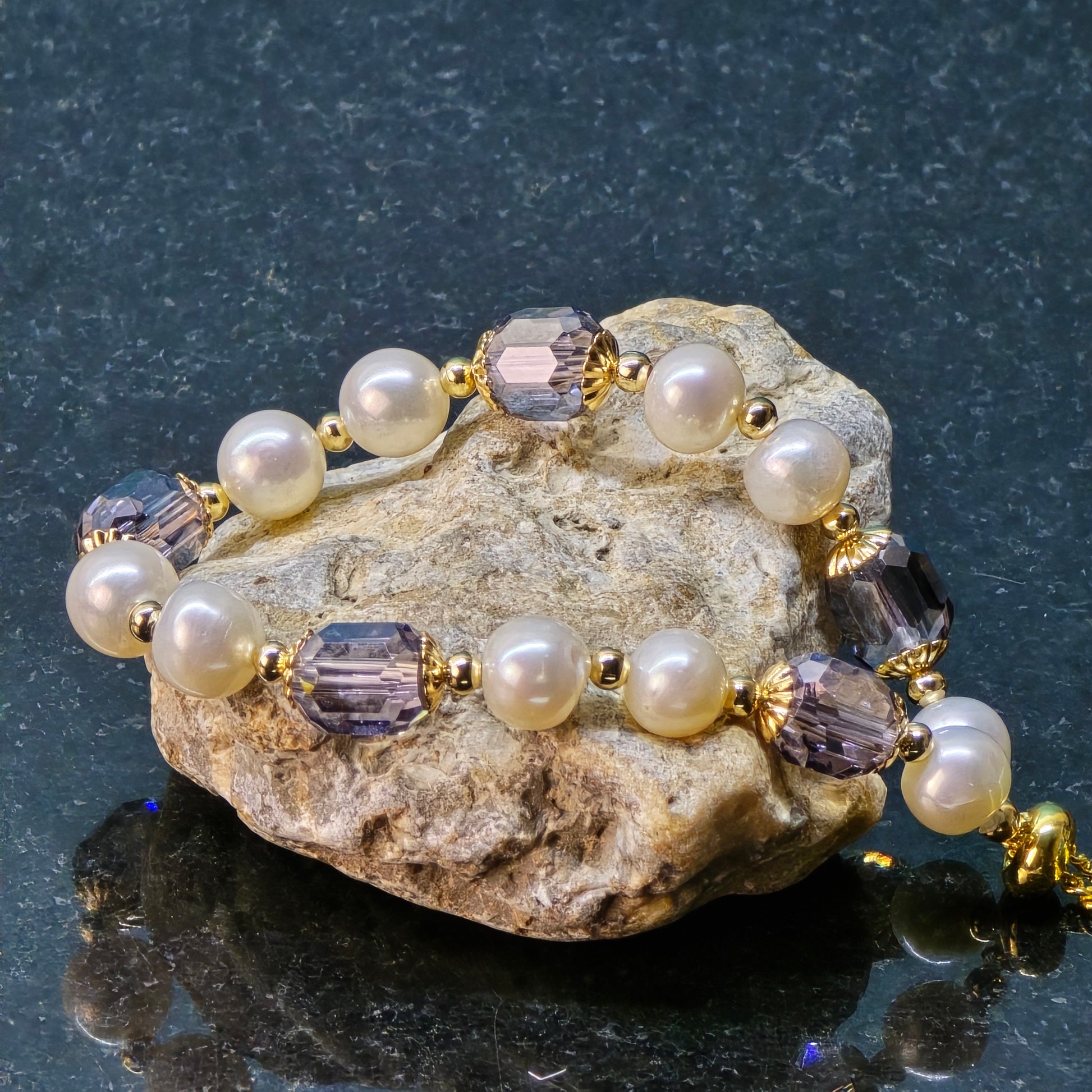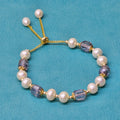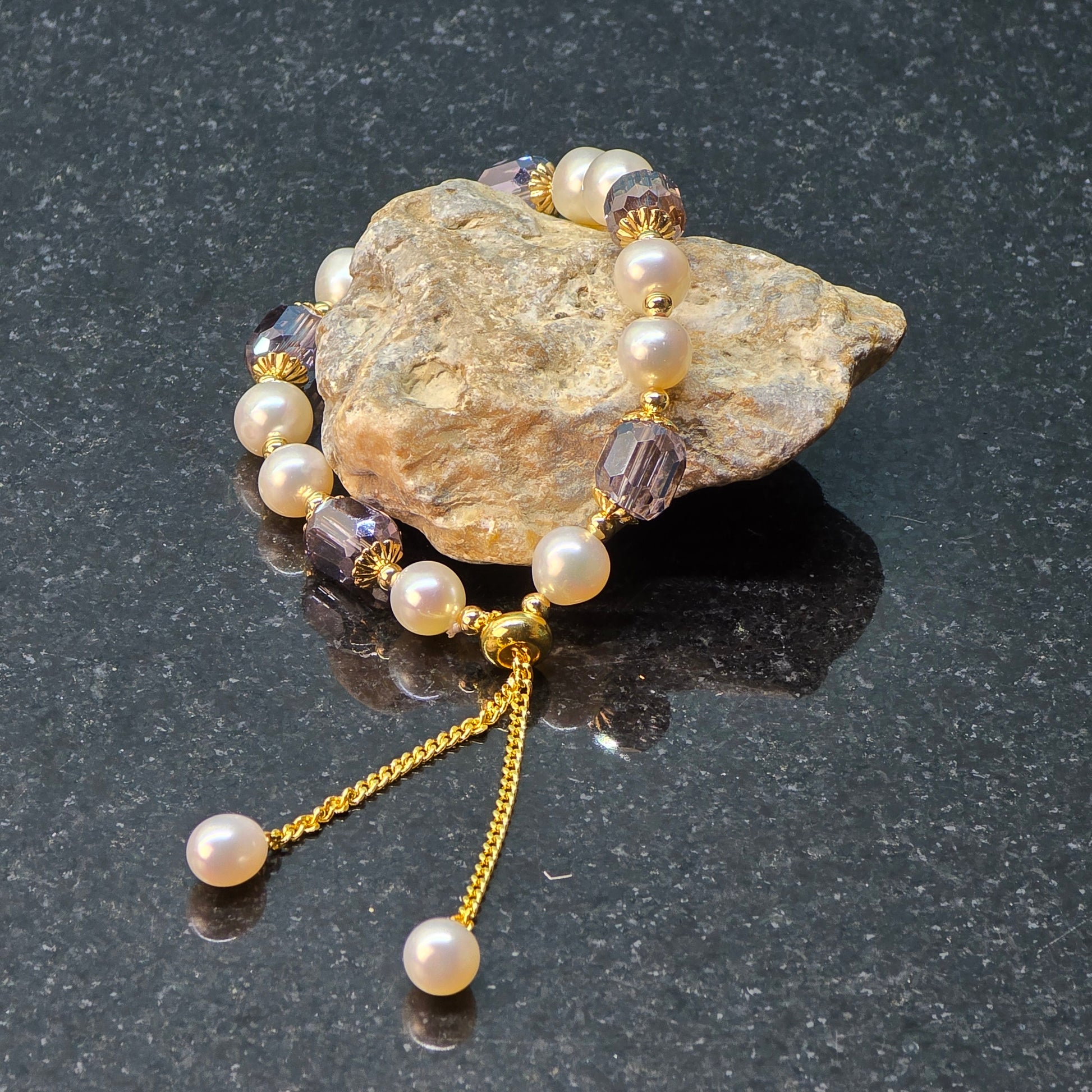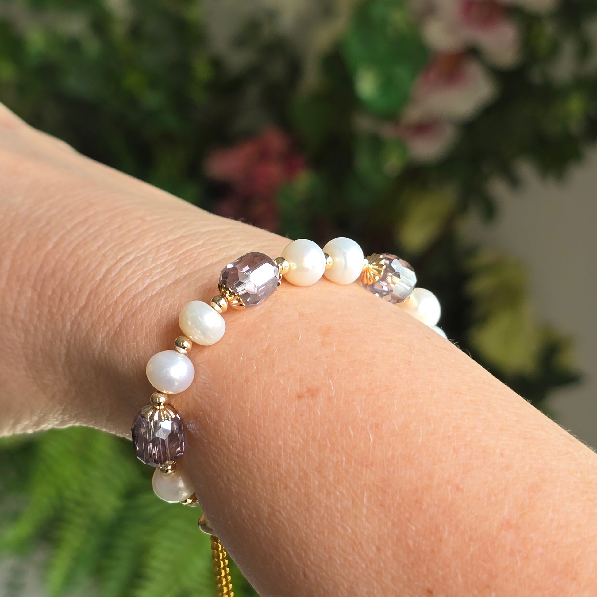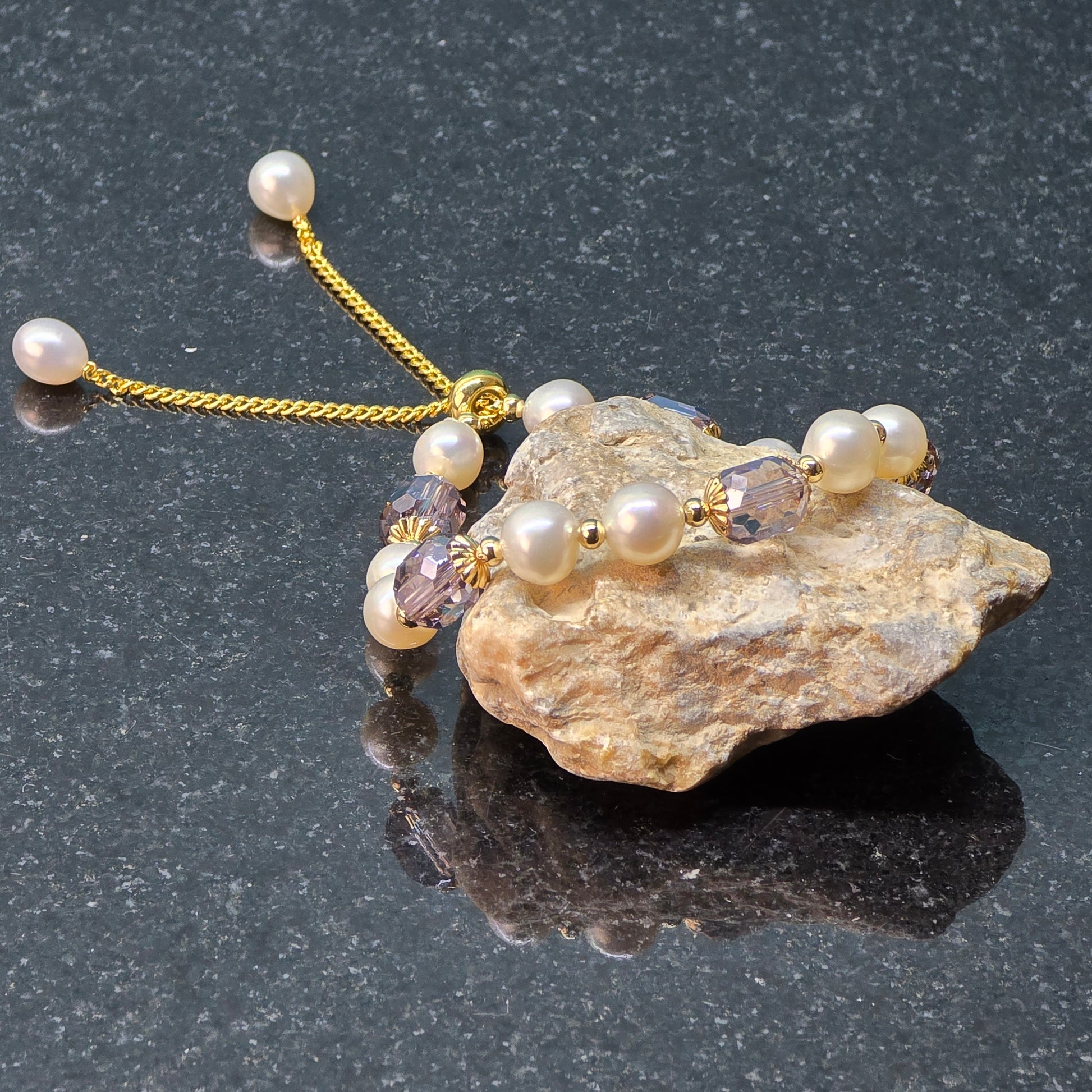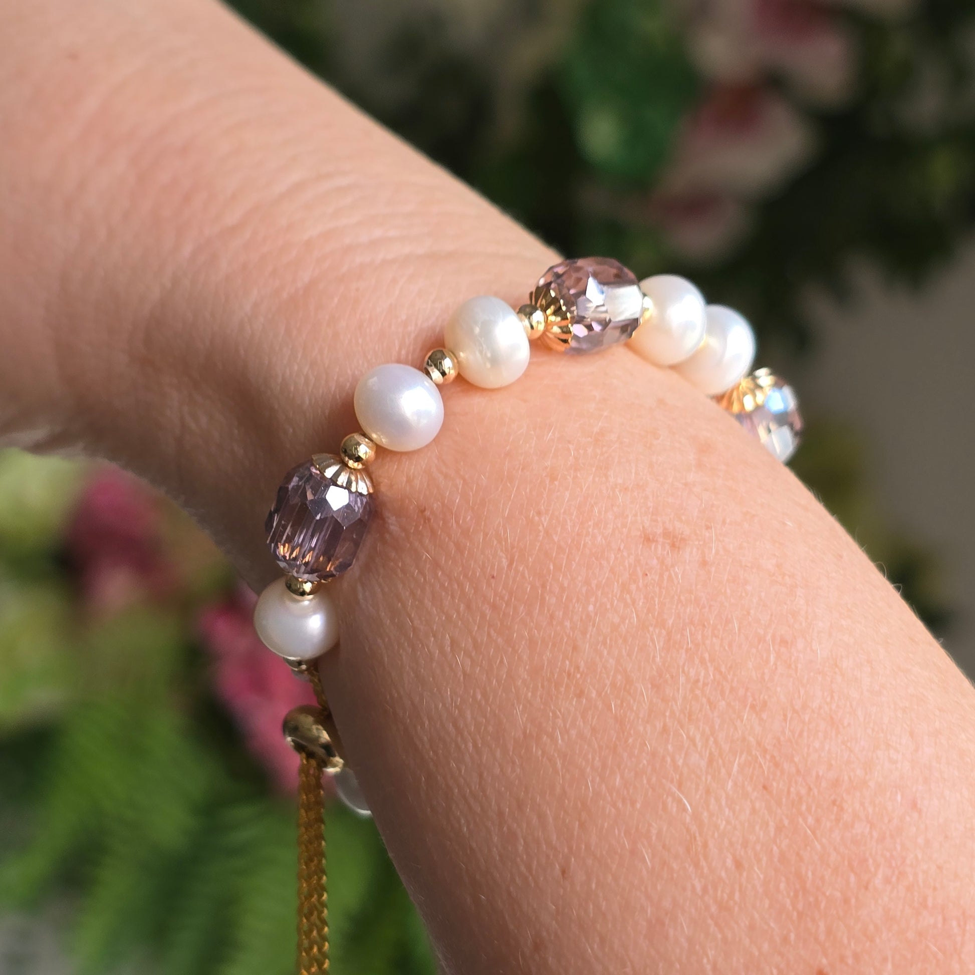 Graceful and radiant, this exquisite adjustable bracelet is the perfect blend of sophistication and charm. Featuring lustrous white freshwater pearls accented by light purple Austrian crystal beads, it shimmers beautifully with every move. Set on gold-plated stainless steel, this timeless piece is finished with two delicate white pearls dangling from the extension chain, adding a graceful, flowing touch. Designed with an easy-to-adjust slider, it’s as effortless as it is elegant—perfect for any occasion! 💜🤍✨