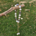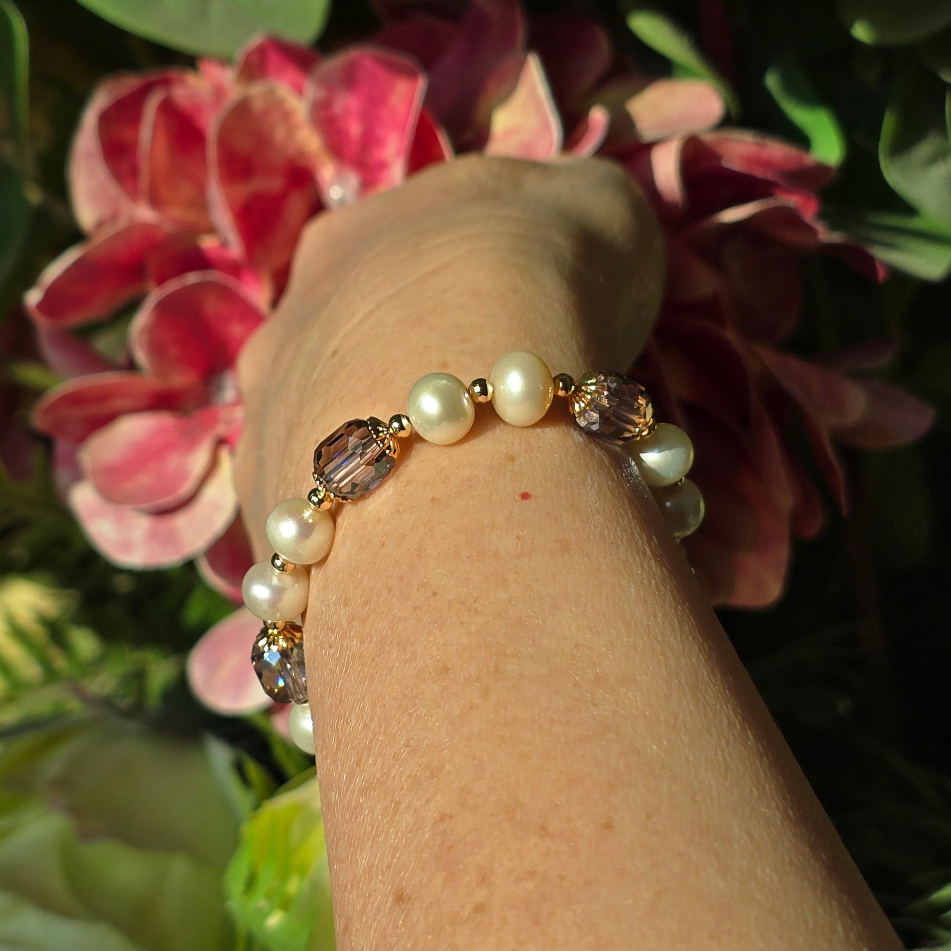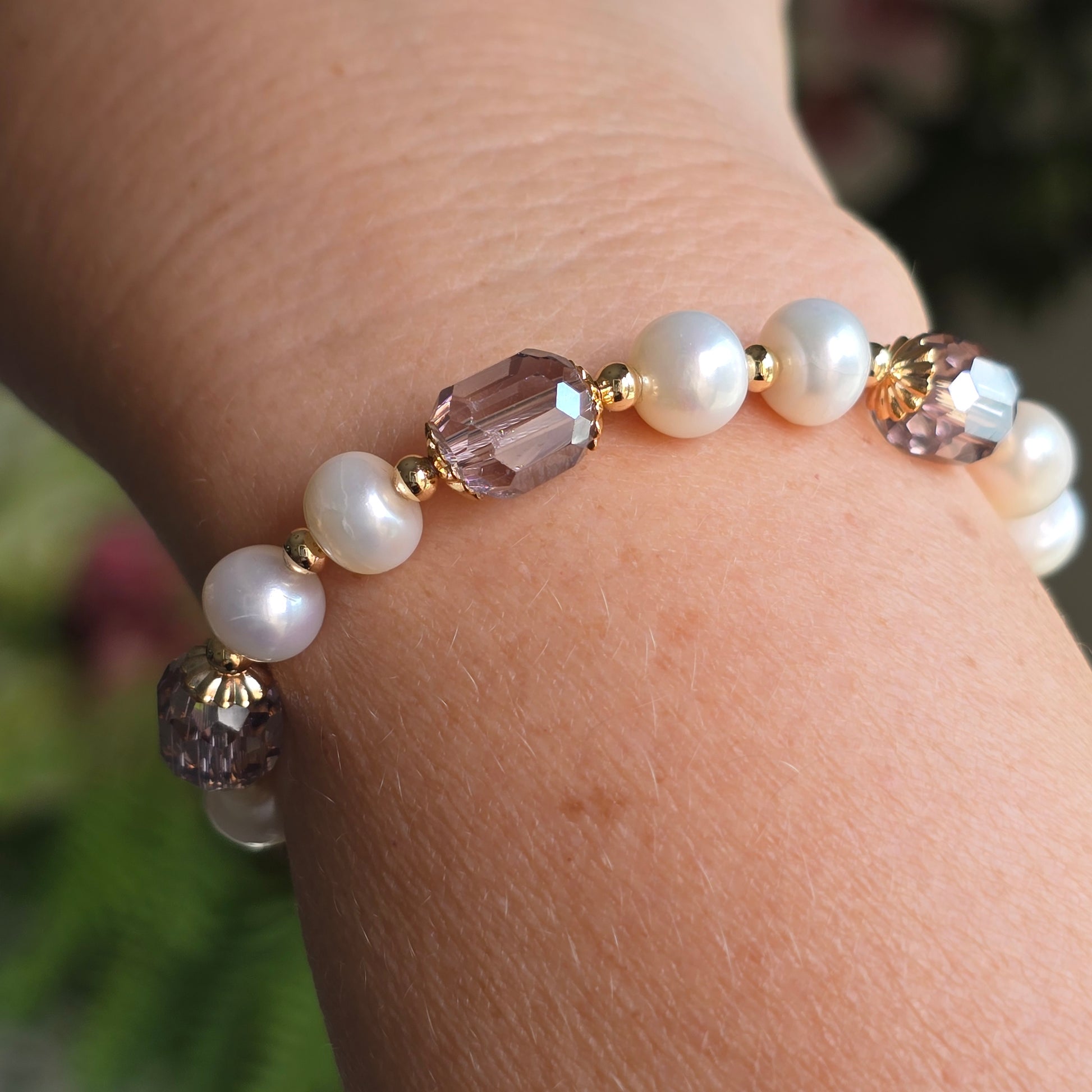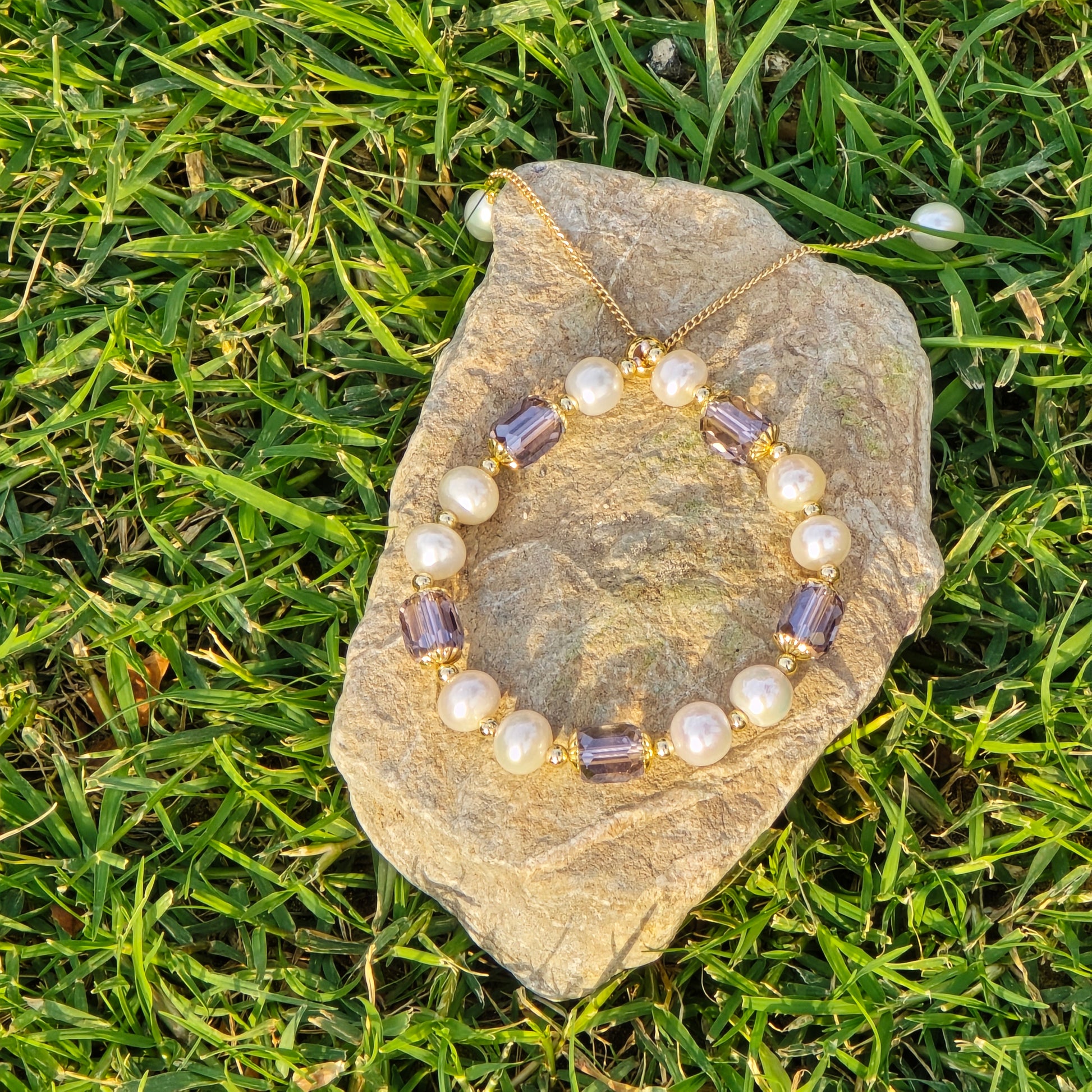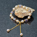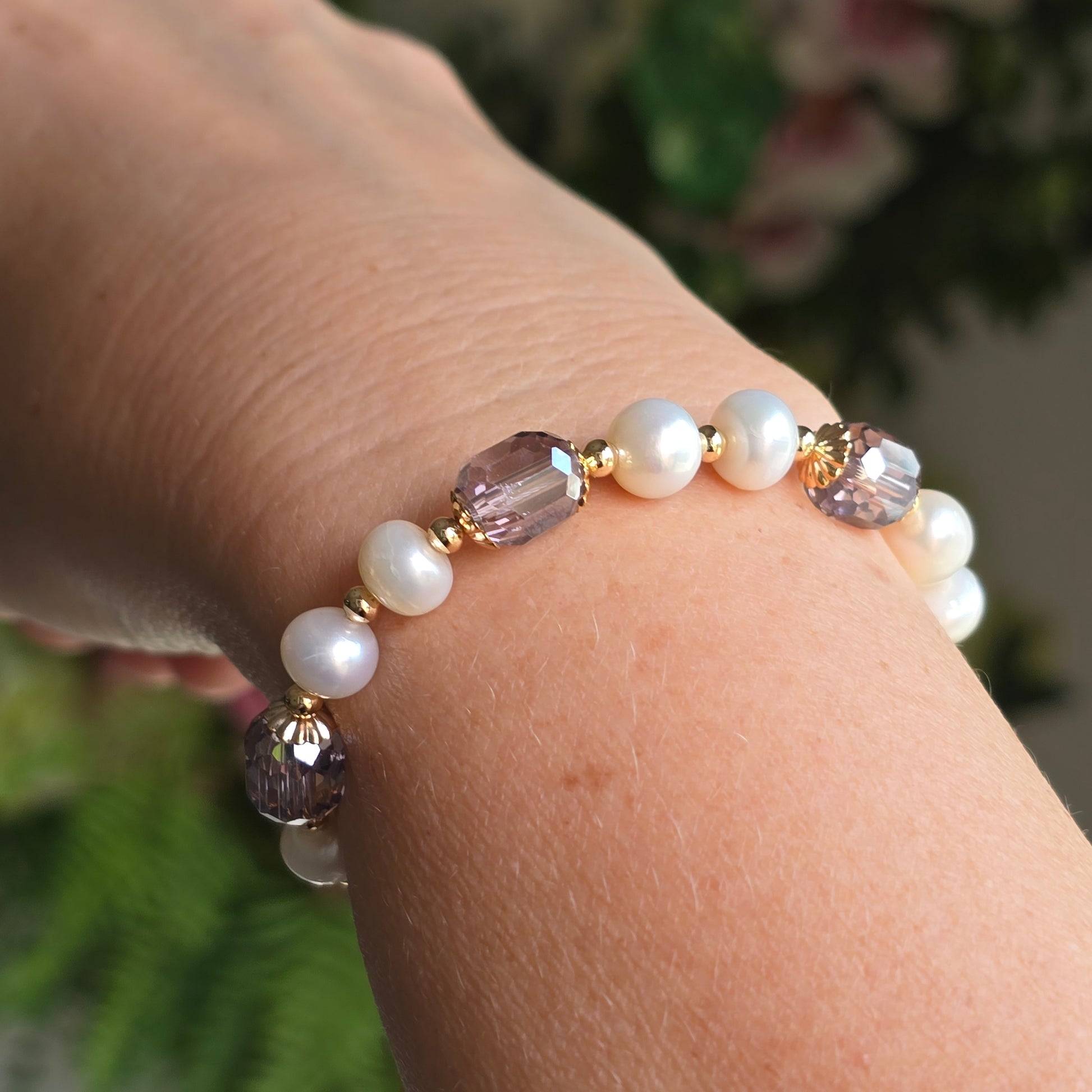 Graceful and radiant, this exquisite adjustable bracelet is the perfect blend of sophistication and charm. Featuring lustrous white freshwater pearls accented by light purple Austrian crystal beads, it shimmers beautifully with every move. Set on gold-plated stainless steel, this timeless piece is finished with two delicate white pearls dangling from the extension chain, adding a graceful, flowing touch. Designed with an easy-to-adjust slider, it’s as effortless as it is elegant—perfect for any occasion! 💜🤍✨
