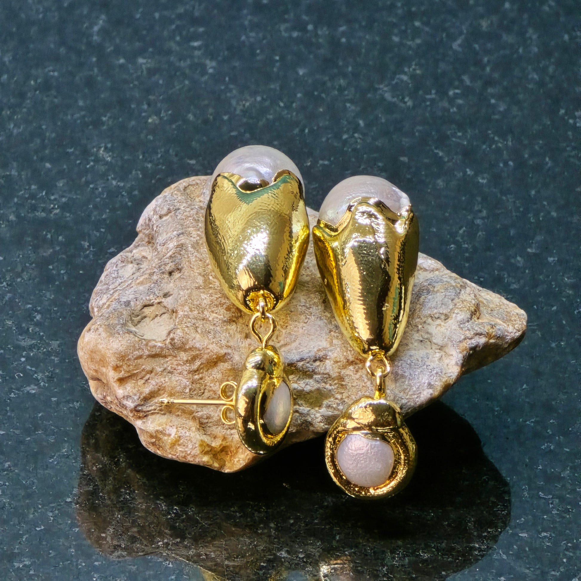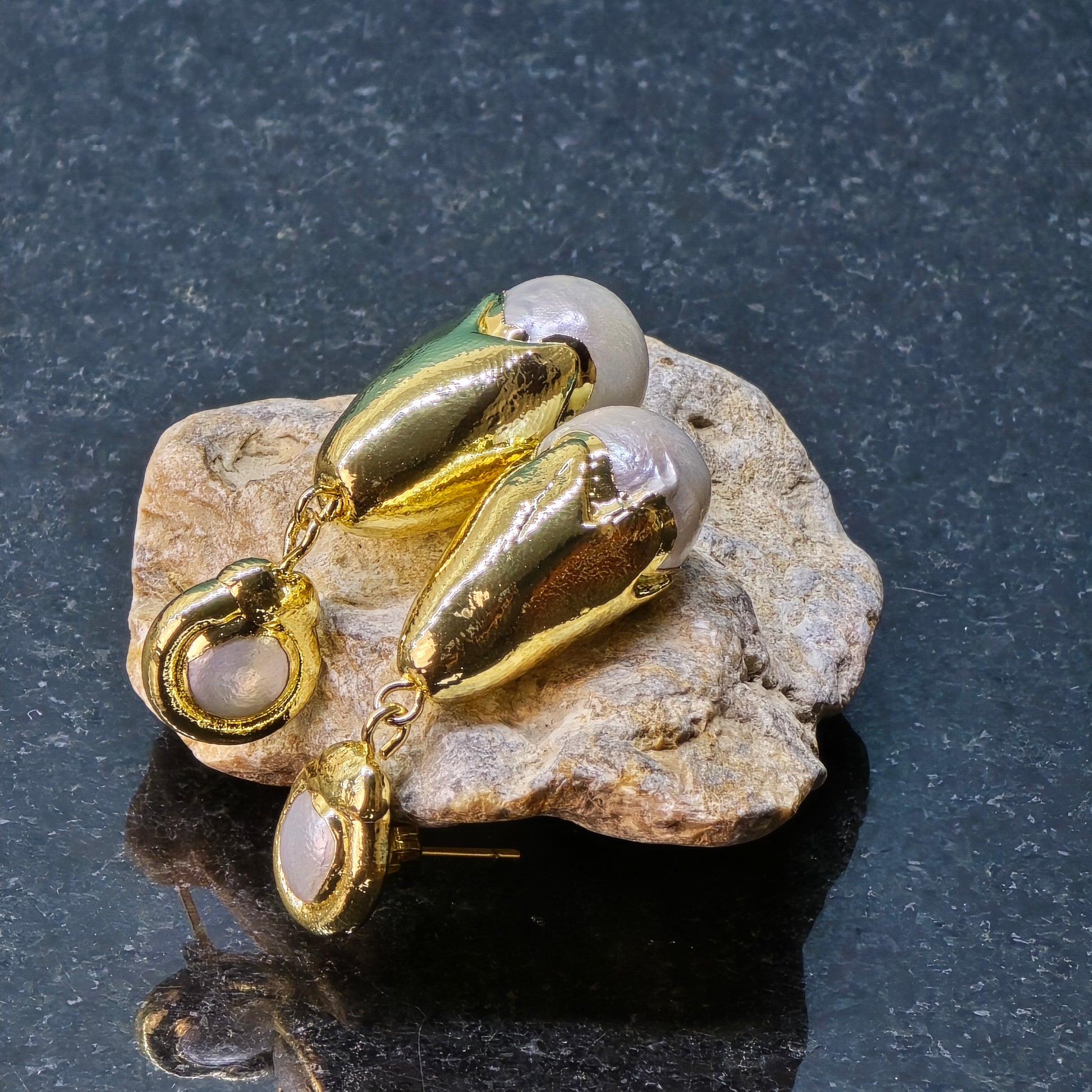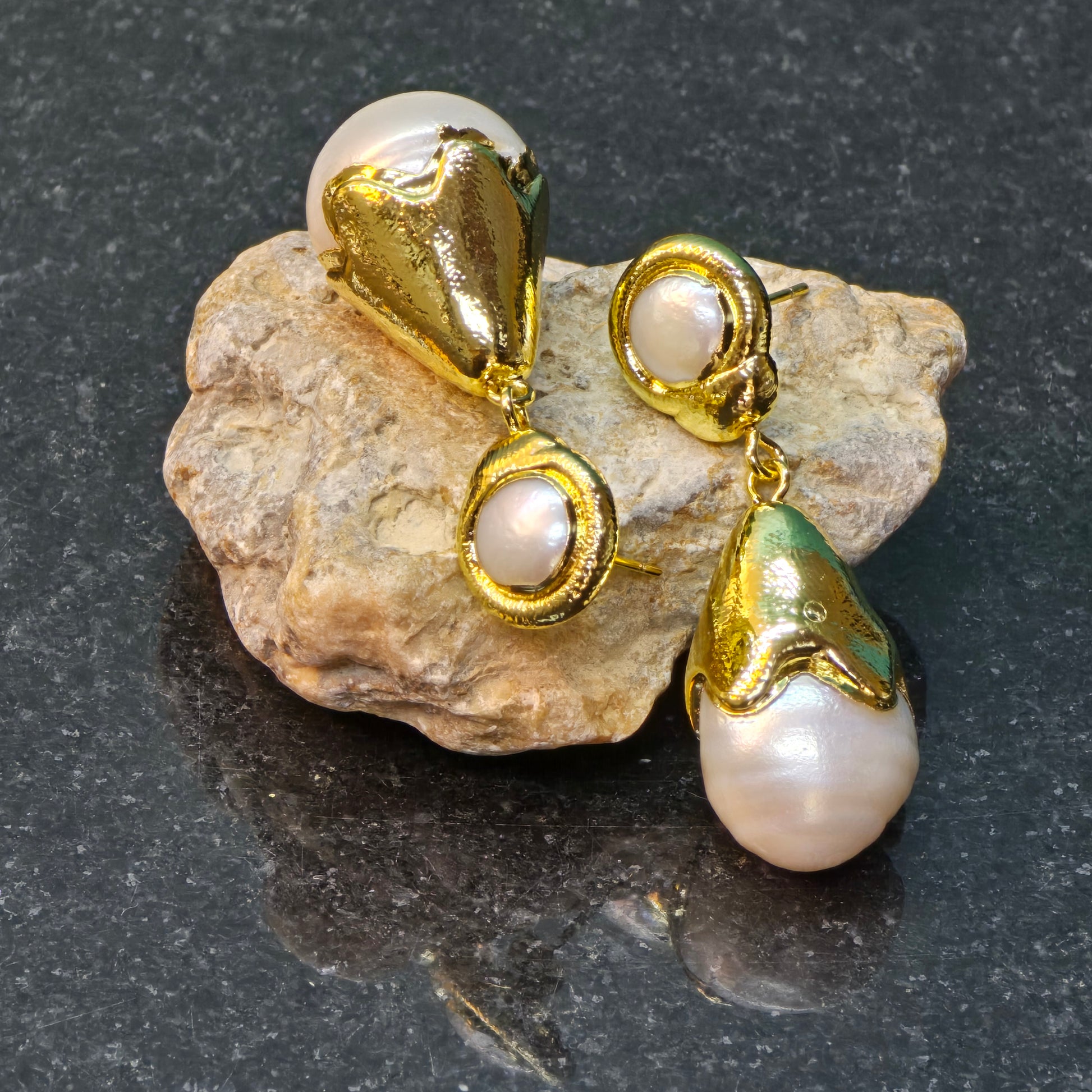 Elevate your style with these stunning dangle earrings, featuring a luminous coin pearl framed in gold-plated stainless steel, paired with a large, elegantly polished baroque pearl delicately wrapped in gold plating. The combination of organic shapes and radiant luster creates a look that is both sophisticated and effortlessly chic.