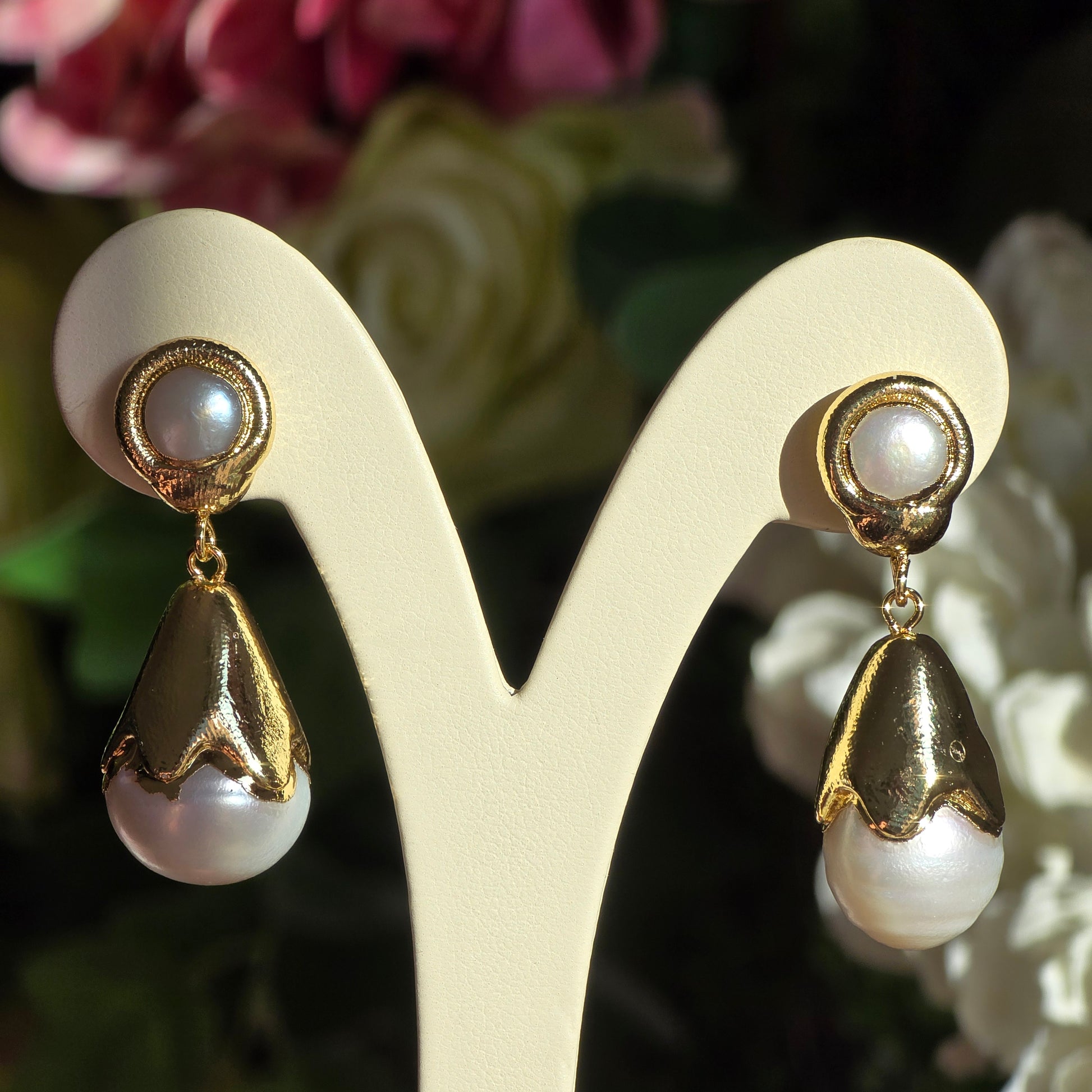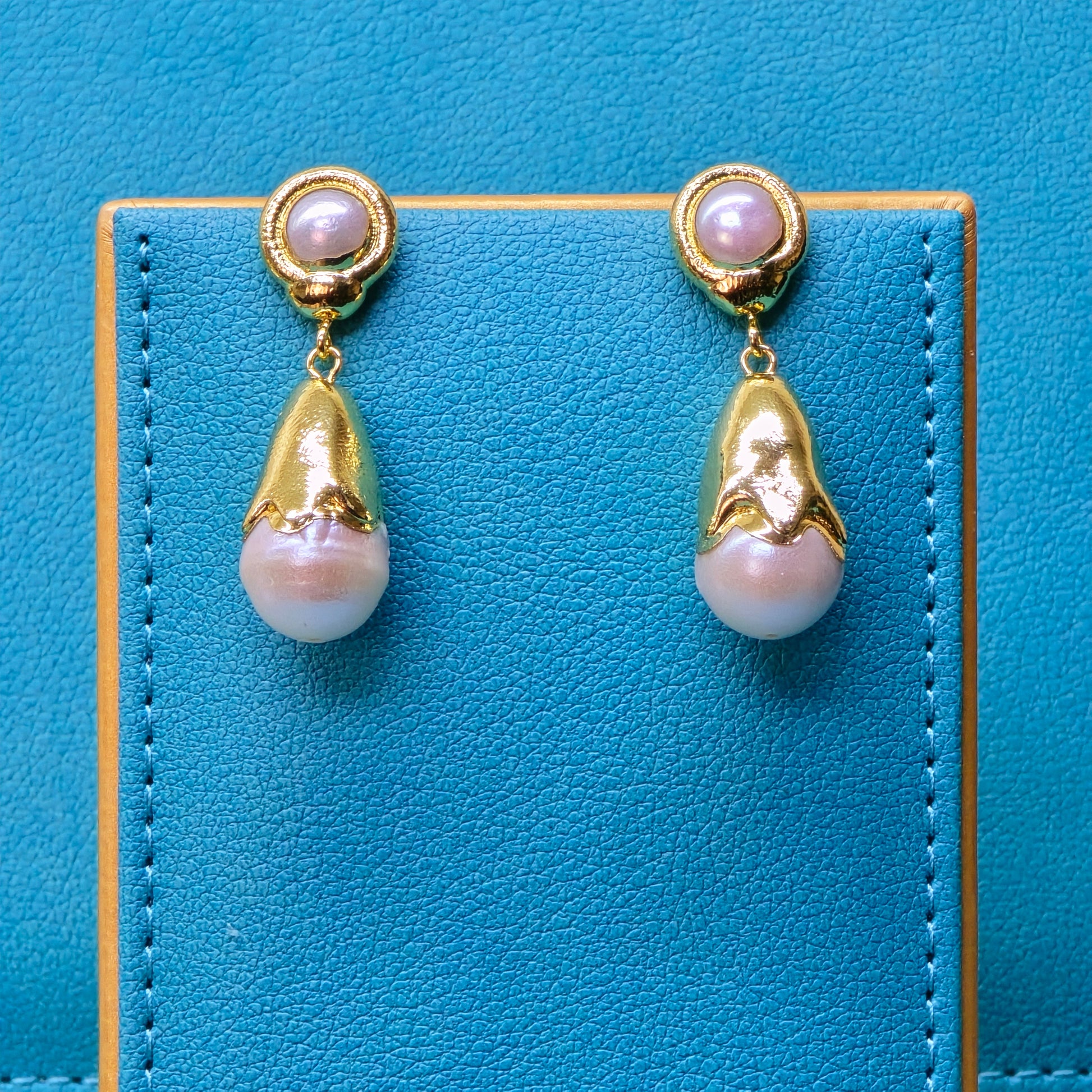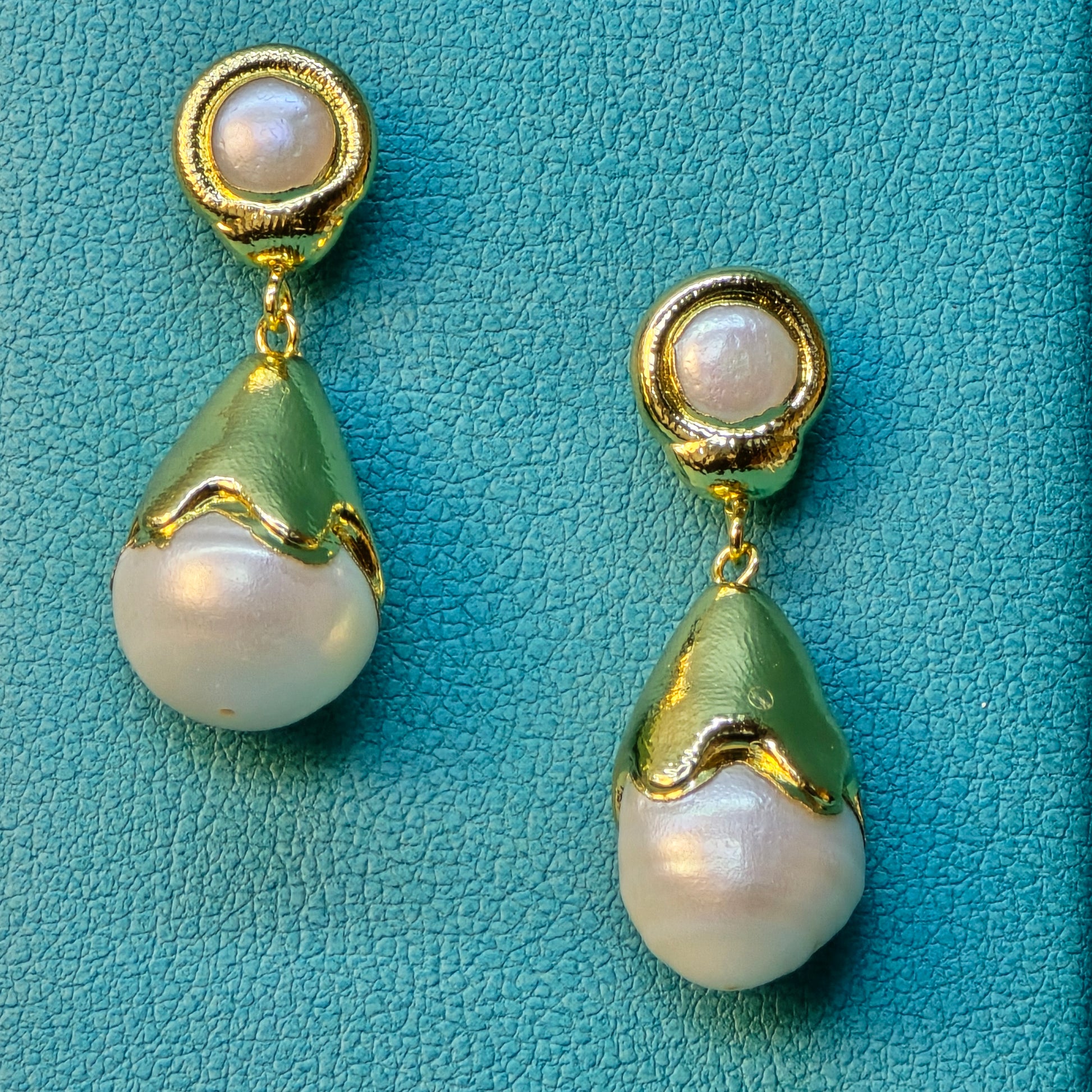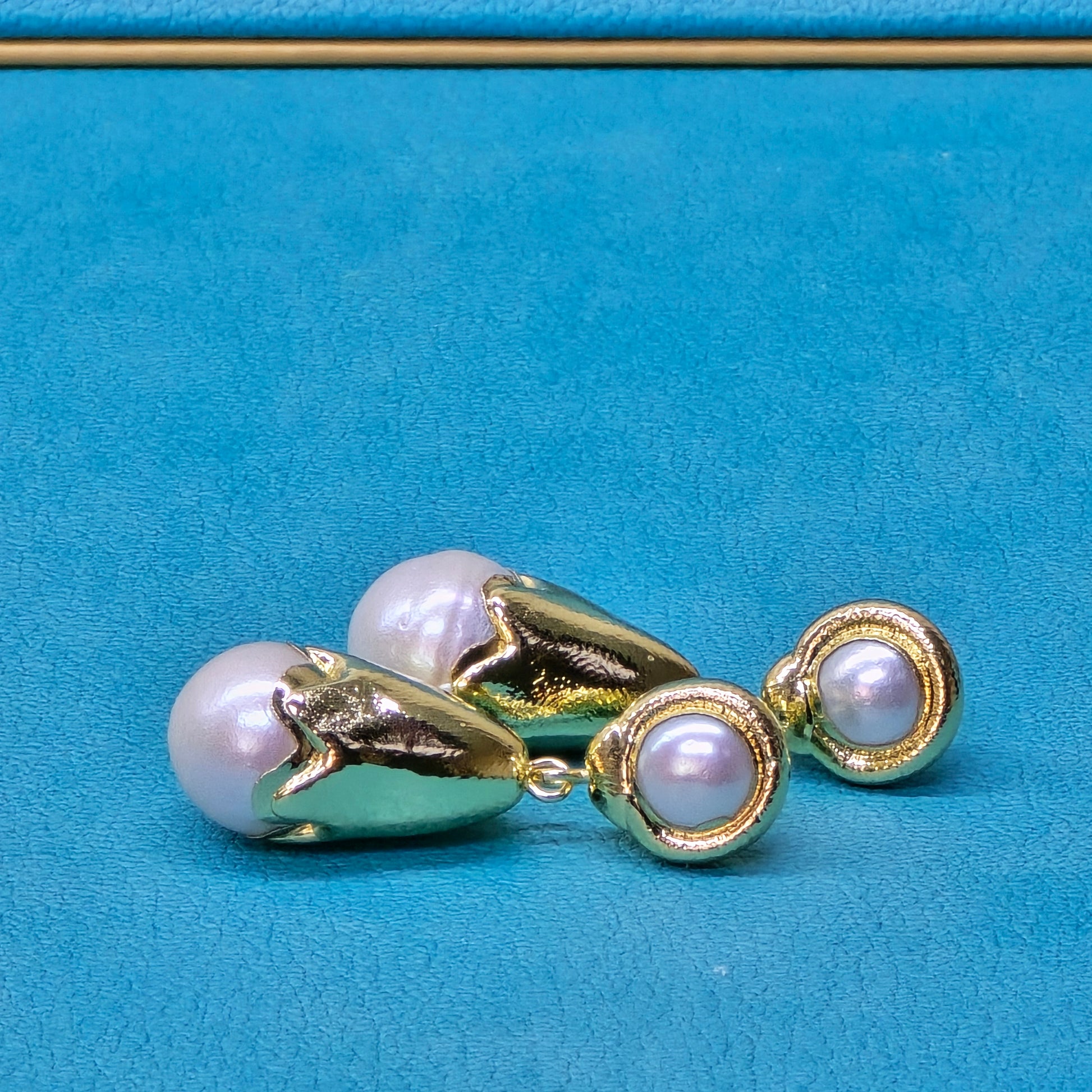 Elevate your style with these stunning dangle earrings, featuring a luminous coin pearl framed in gold-plated stainless steel, paired with a large, elegantly polished baroque pearl delicately wrapped in gold plating. The combination of organic shapes and radiant luster creates a look that is both sophisticated and effortlessly chic.