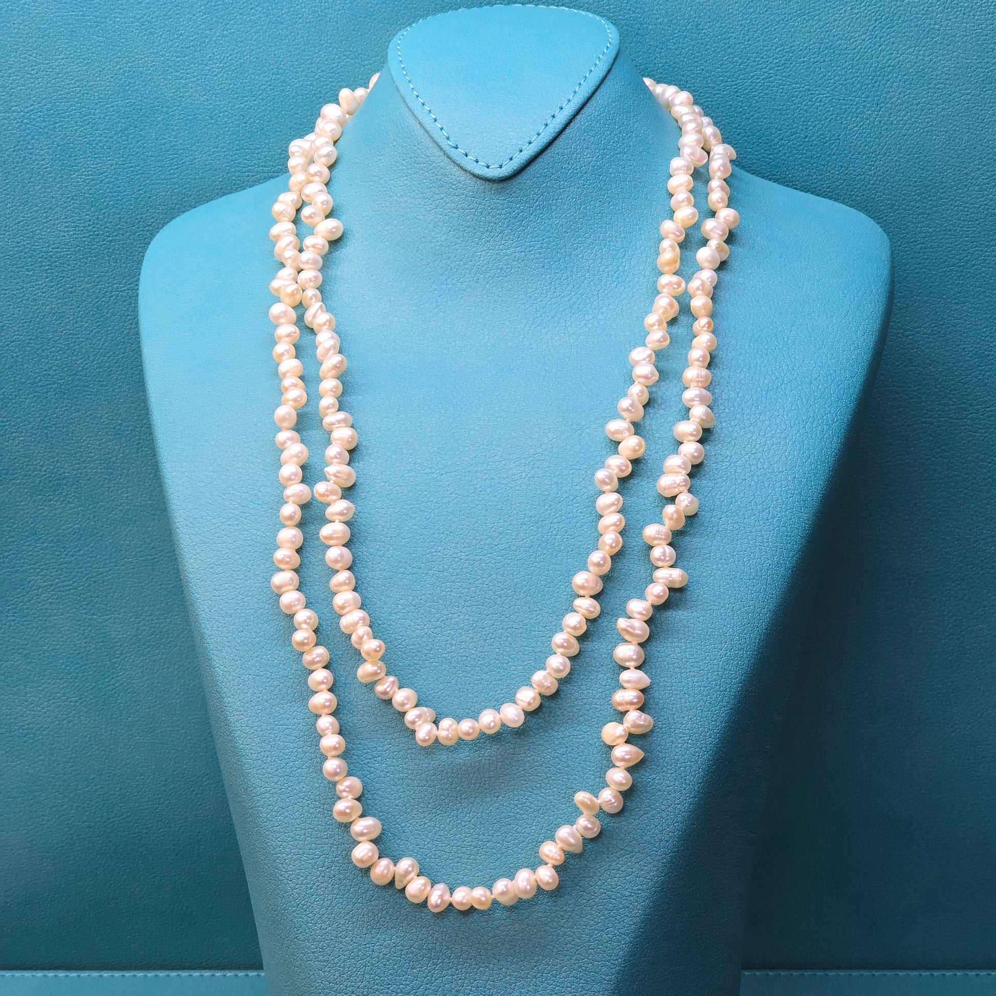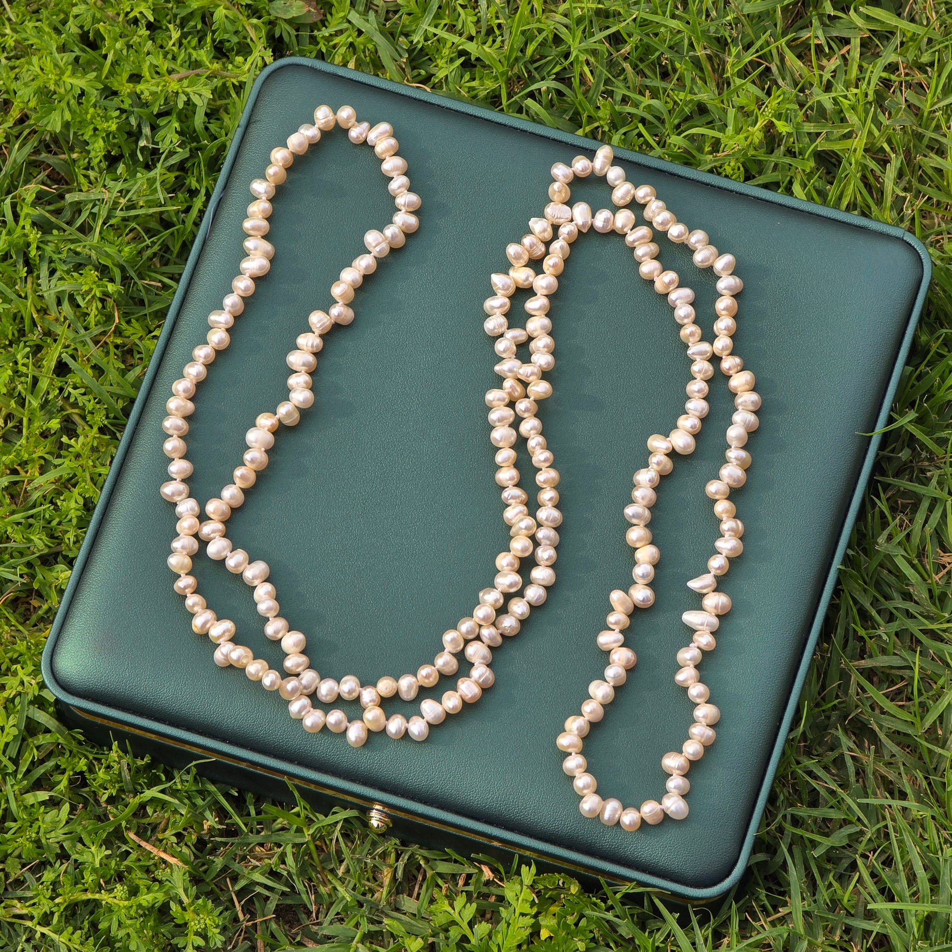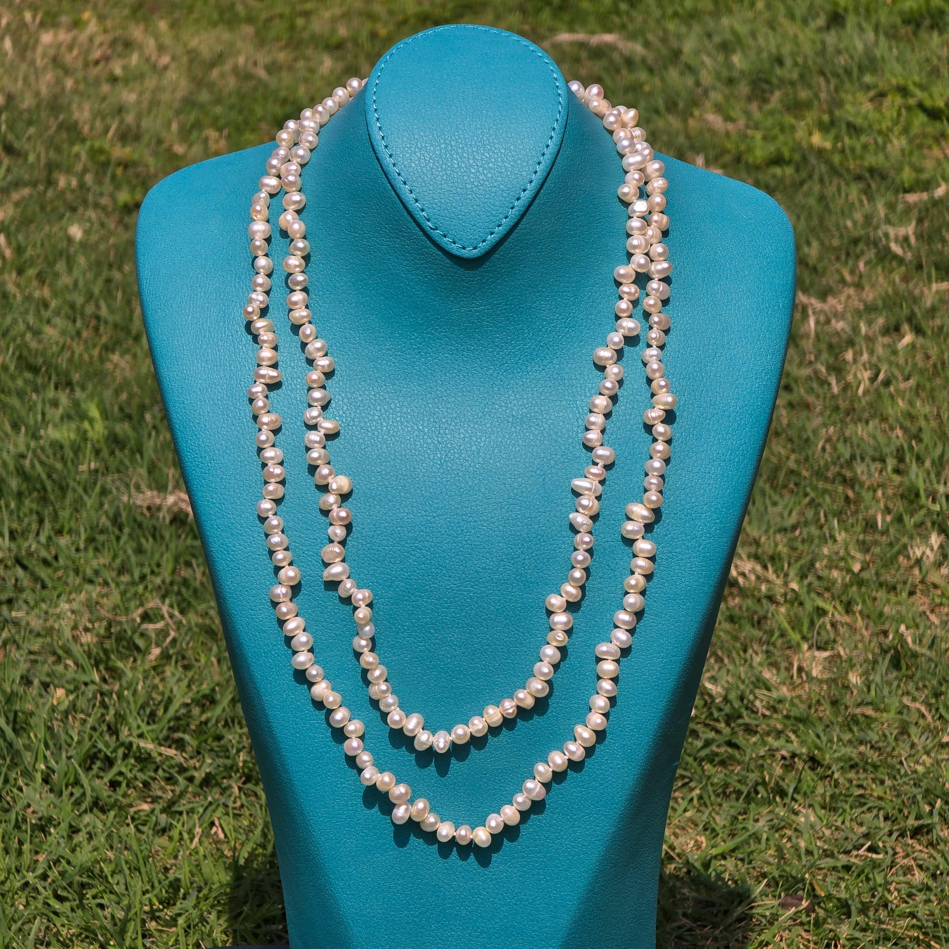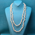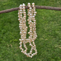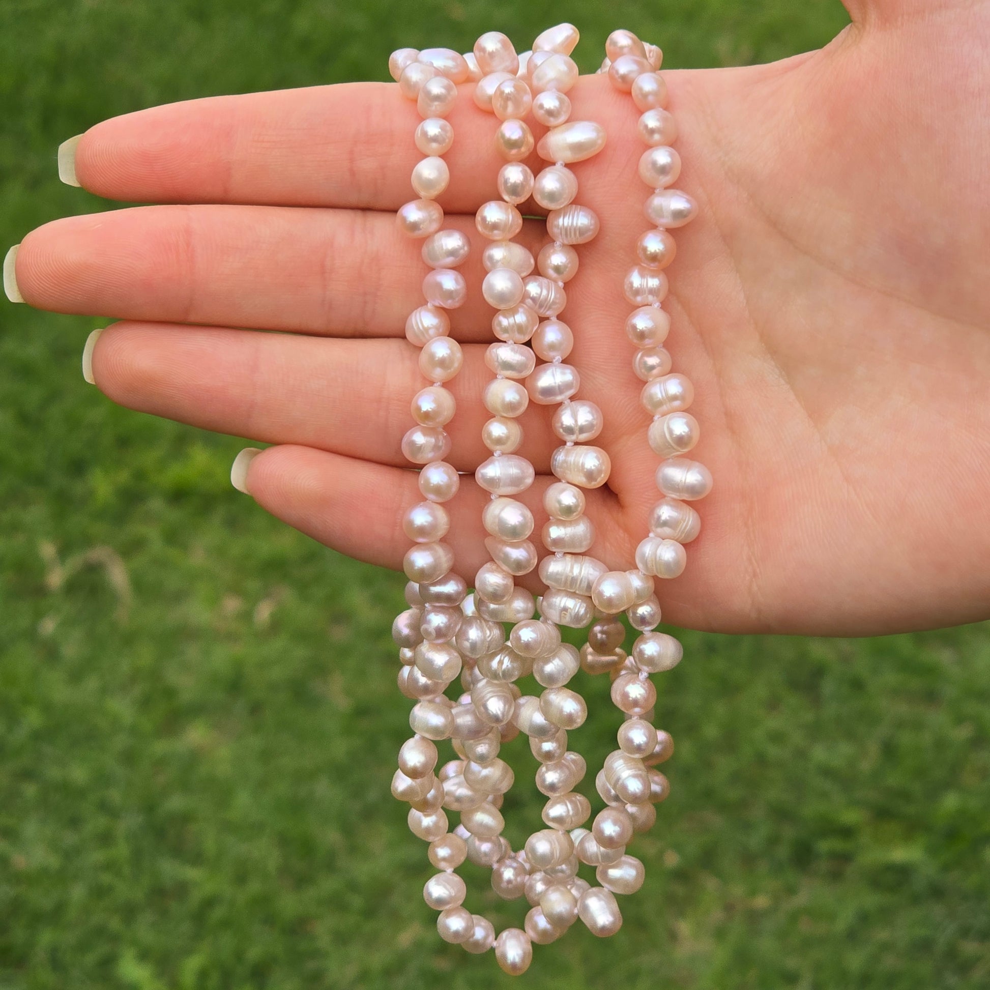 Unlike traditional pearl strands, these pearls are not drilled in the middle, creating a chunky, opulent look that adds depth and richness to any ensemble. Designed as an infinite strand, this necklace offers endless styling possibilities: