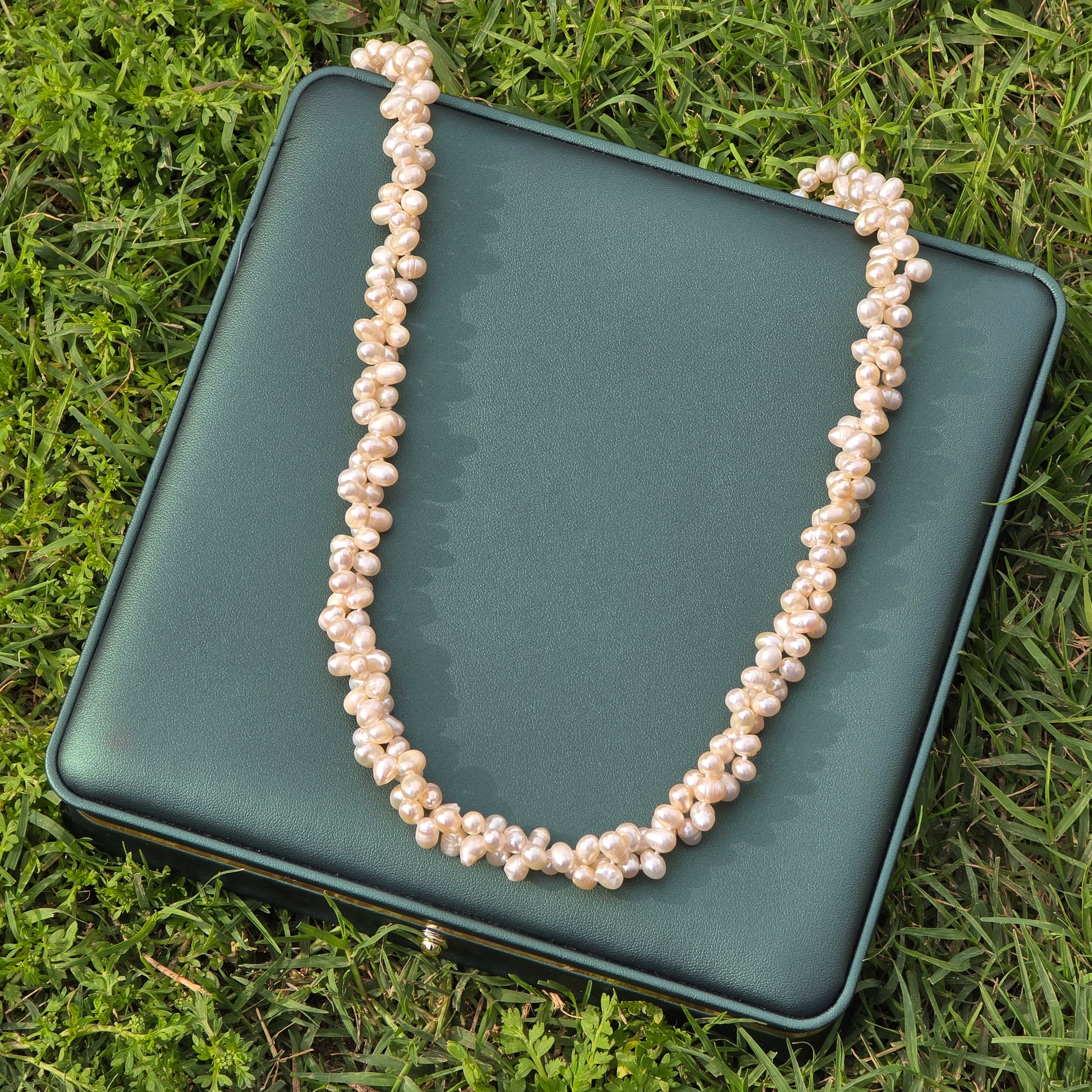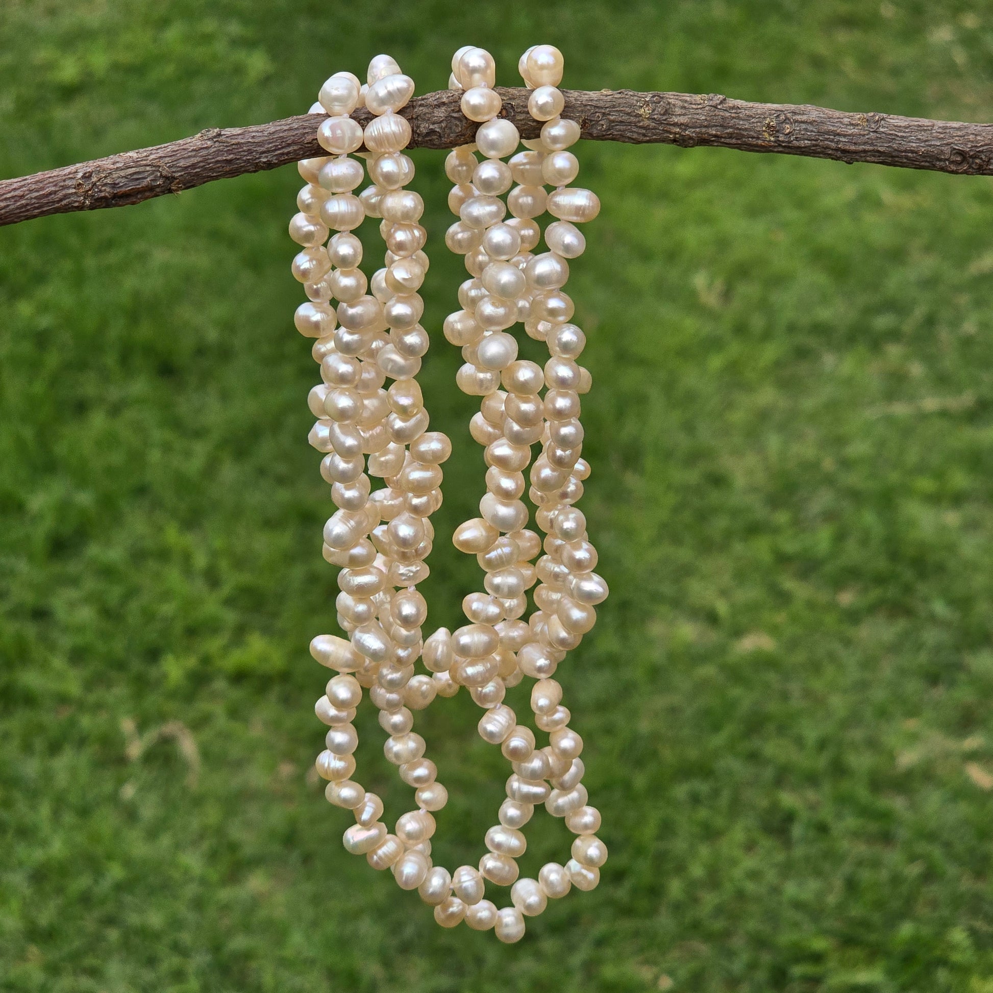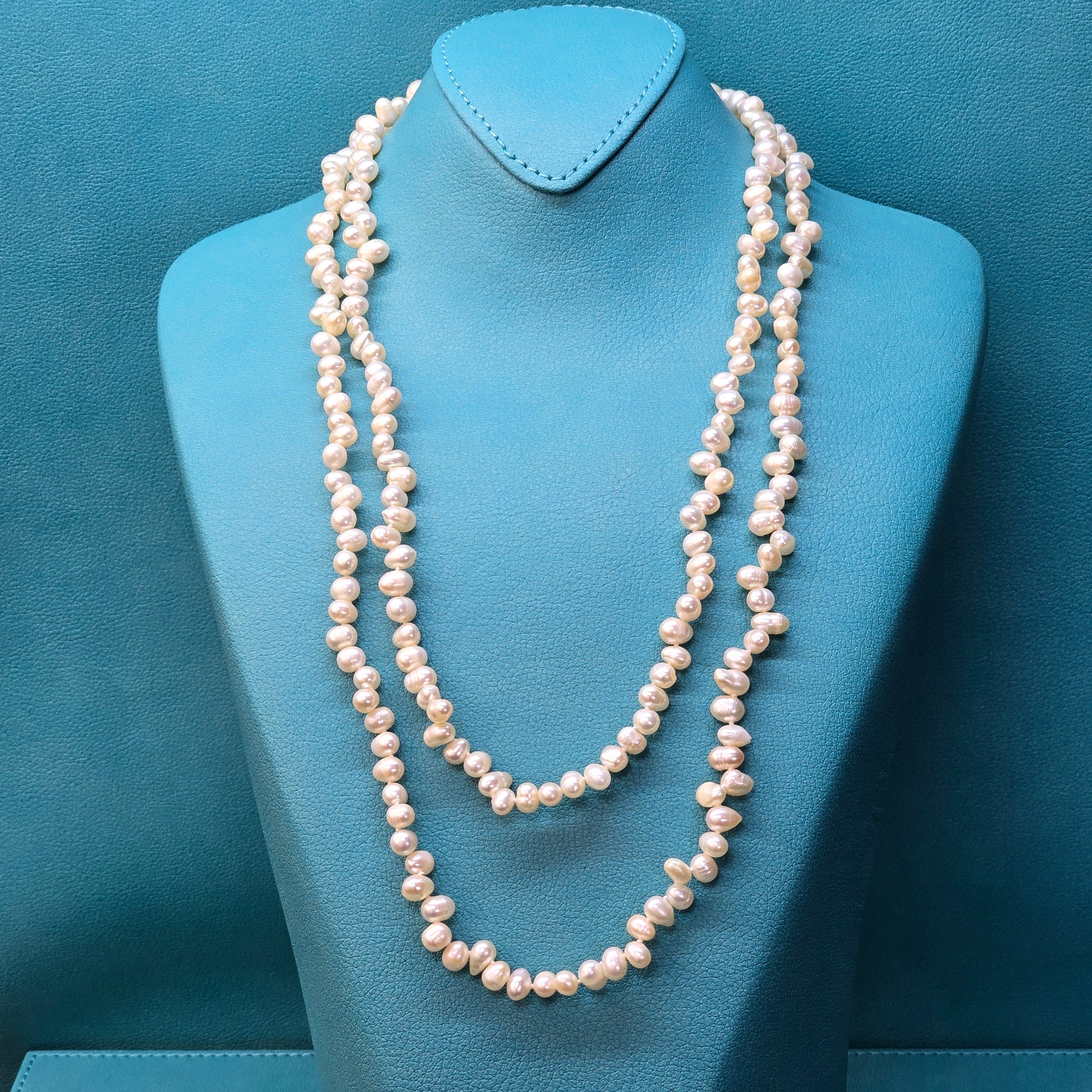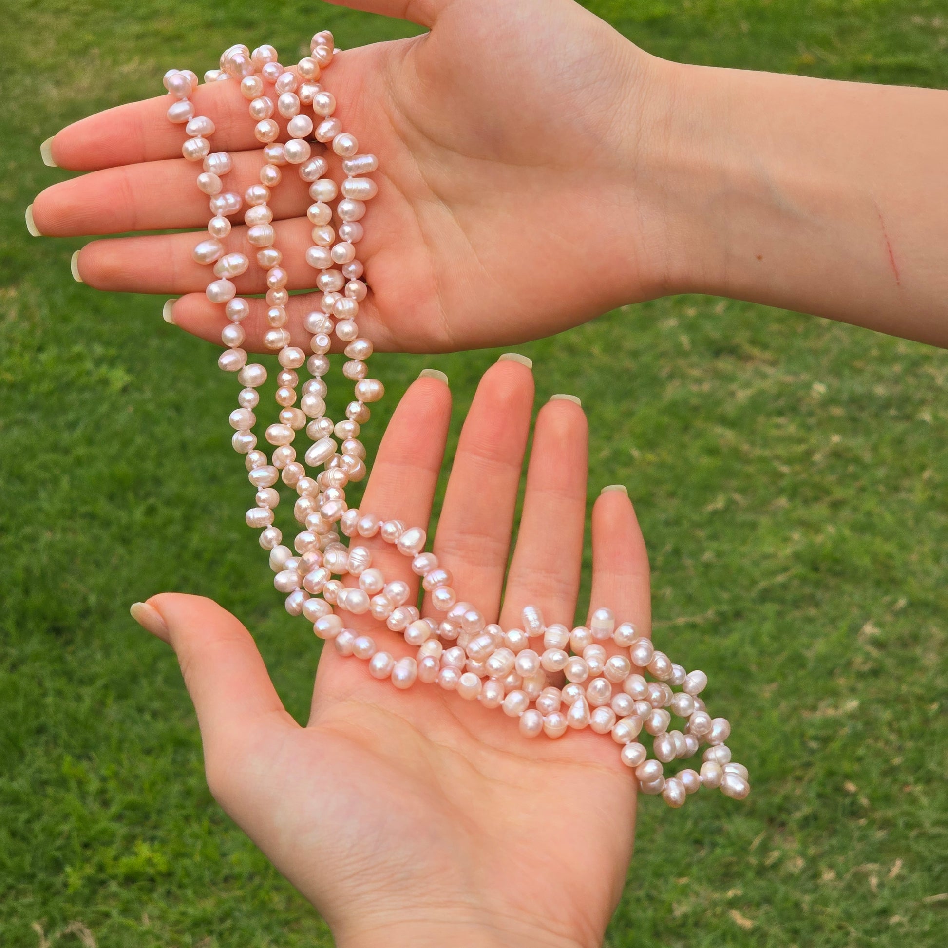 Unlike traditional pearl strands, these pearls are not drilled in the middle, creating a chunky, opulent look that adds depth and richness to any ensemble. Designed as an infinite strand, this necklace offers endless styling possibilities: