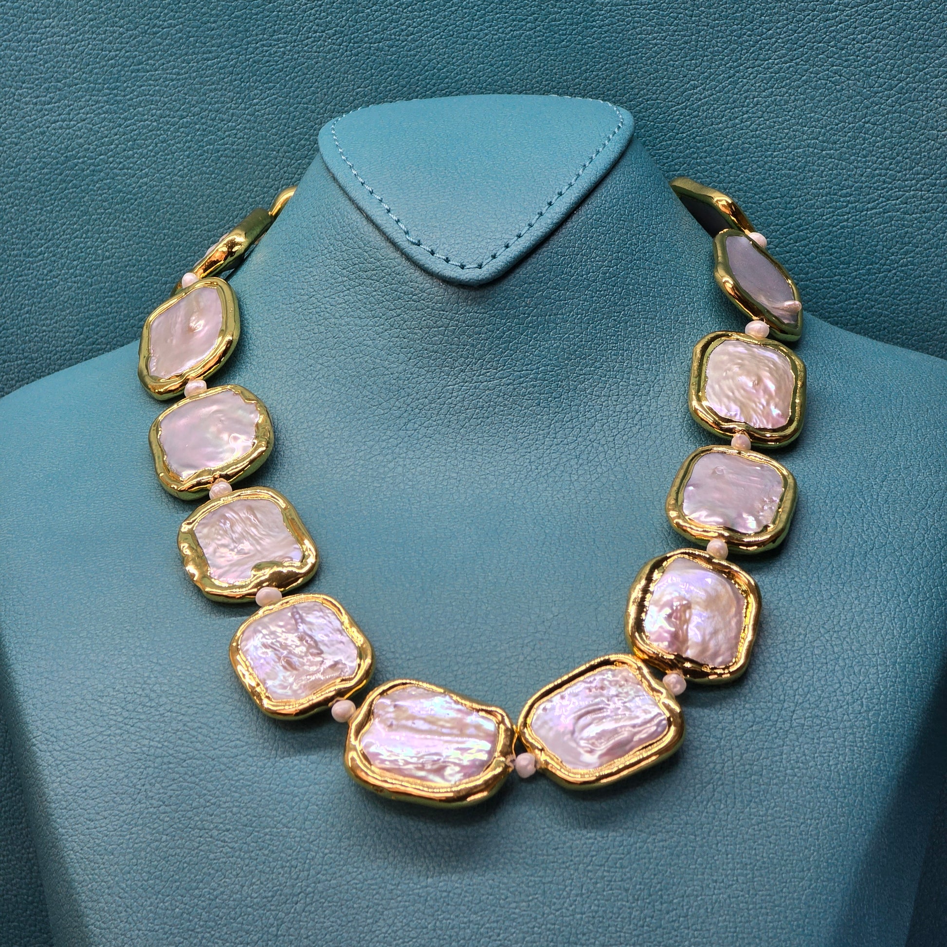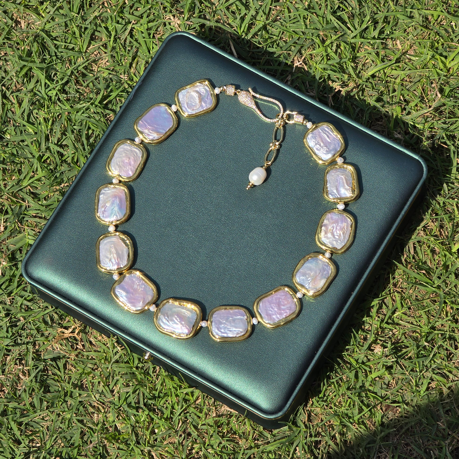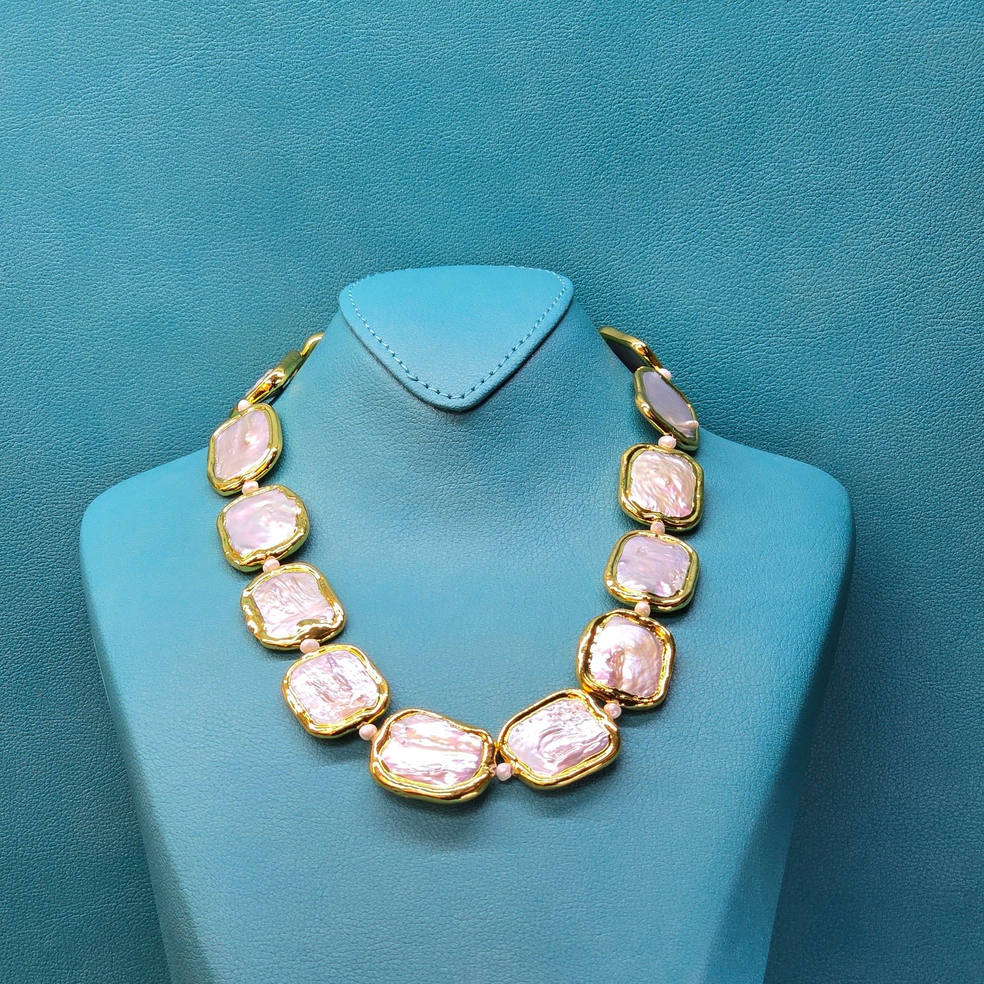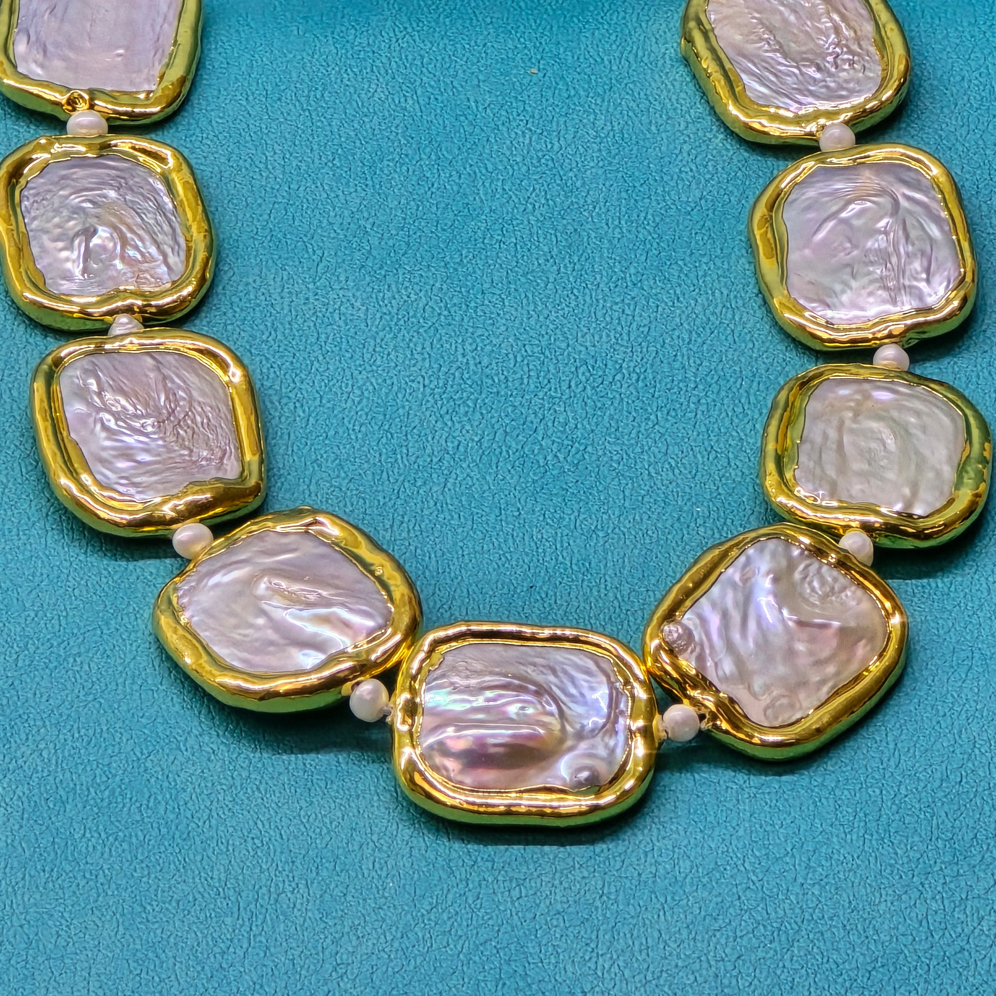 Elegant Square Pearl Necklace, a stunning fusion of modern design and classic elegance. Featuring meticulously crafted square-shaped flattened freshwater pearls, this piece showcases their natural luster and unique organic beauty. Complemented by luxurious gold-plated accents, this necklace exudes a refined charm that effortlessly enhances any outfit.