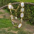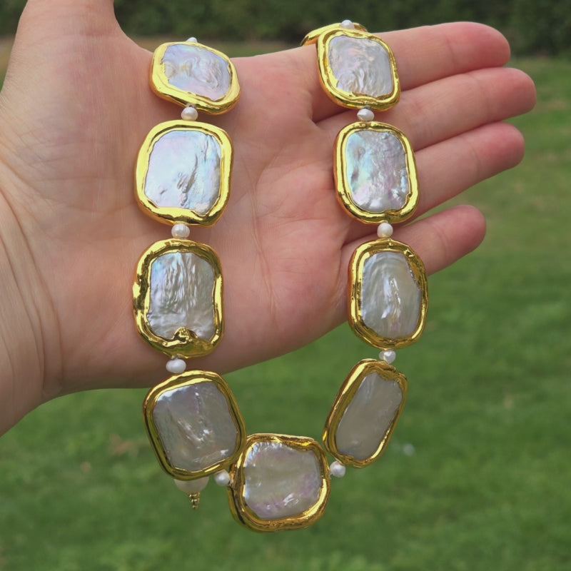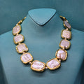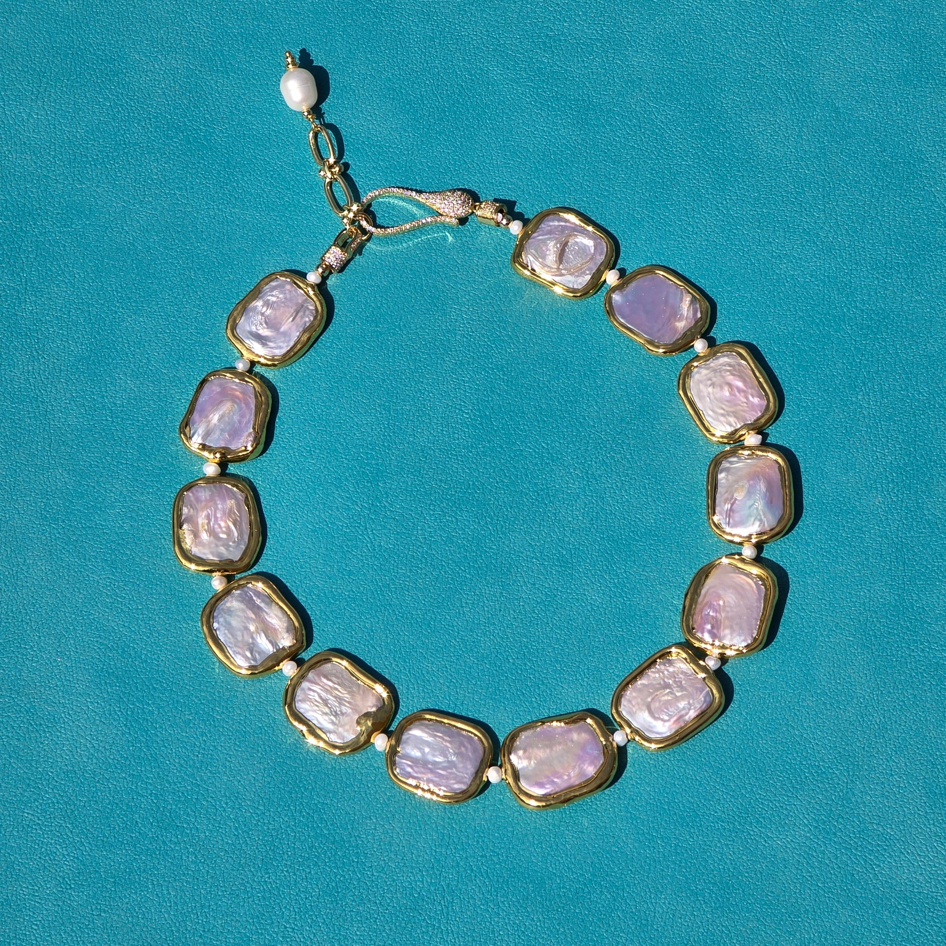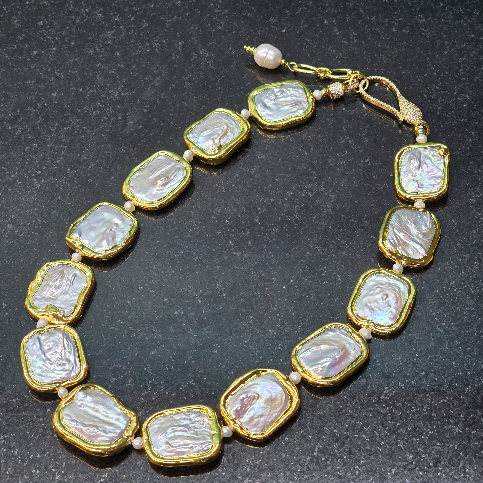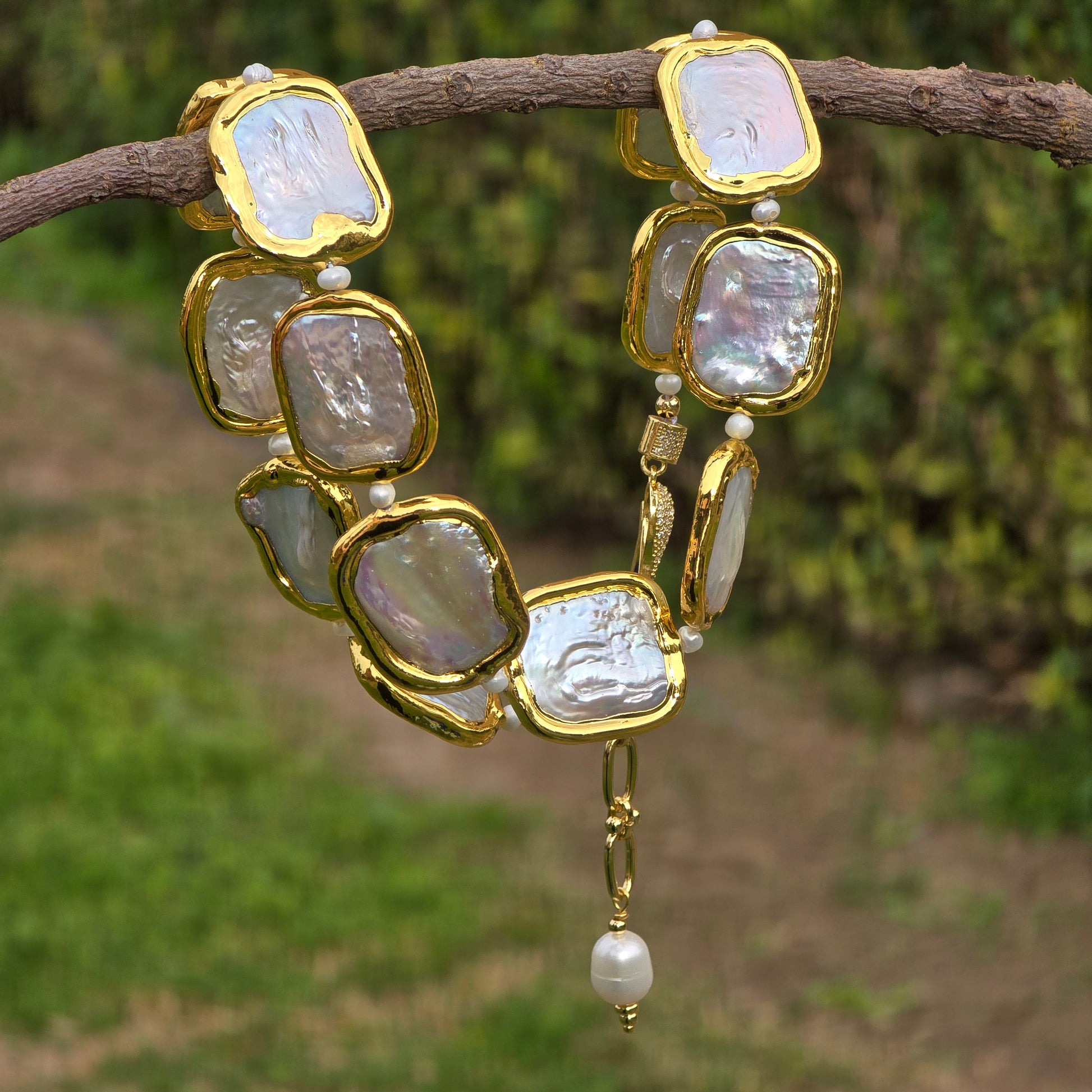 Elegant Square Pearl Necklace, a stunning fusion of modern design and classic elegance. Featuring meticulously crafted square-shaped flattened freshwater pearls, this piece showcases their natural luster and unique organic beauty. Complemented by luxurious gold-plated accents, this necklace exudes a refined charm that effortlessly enhances any outfit.