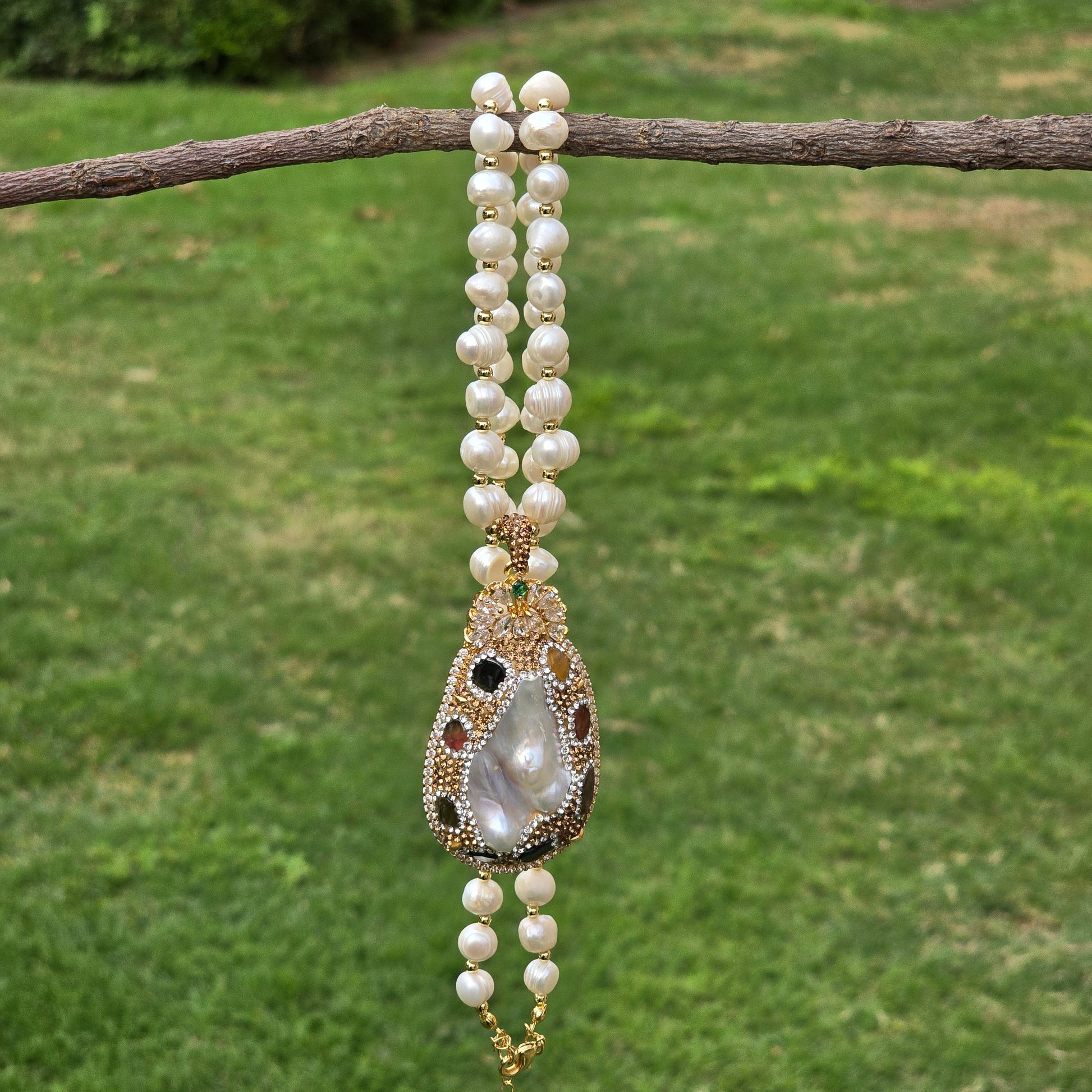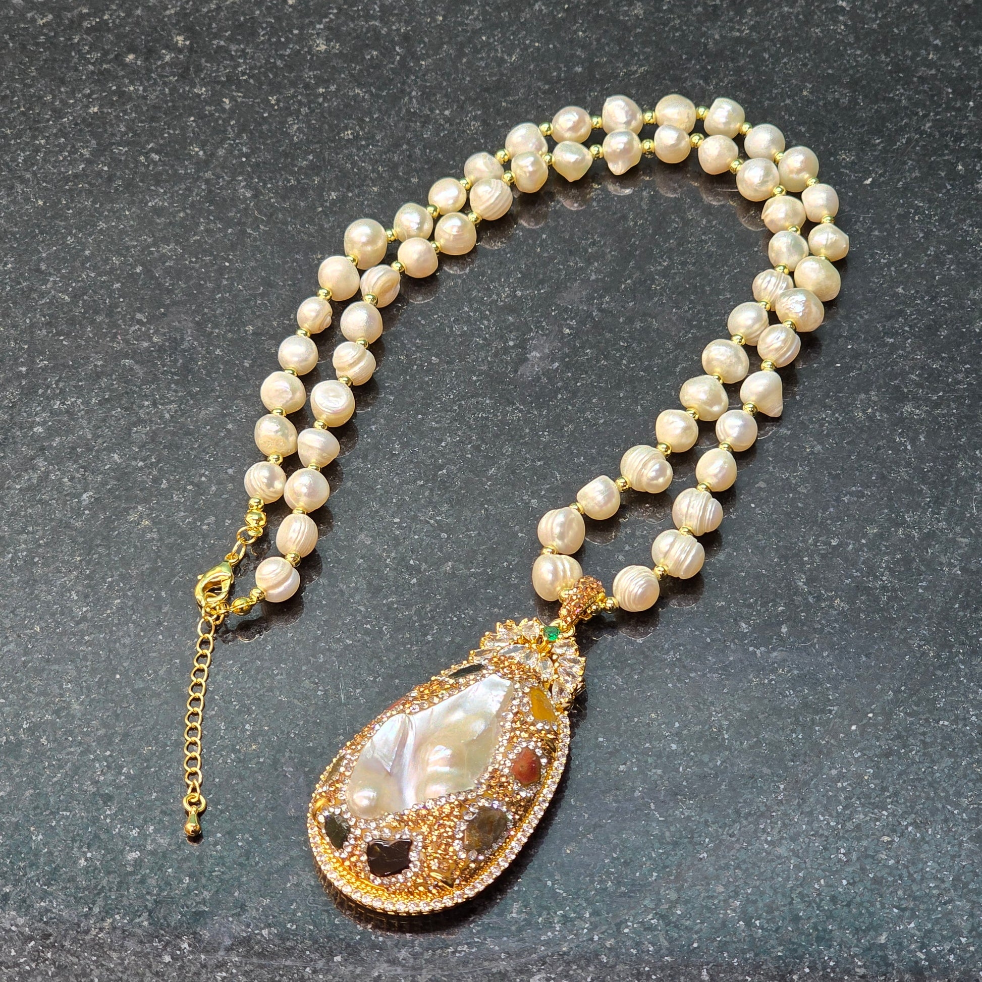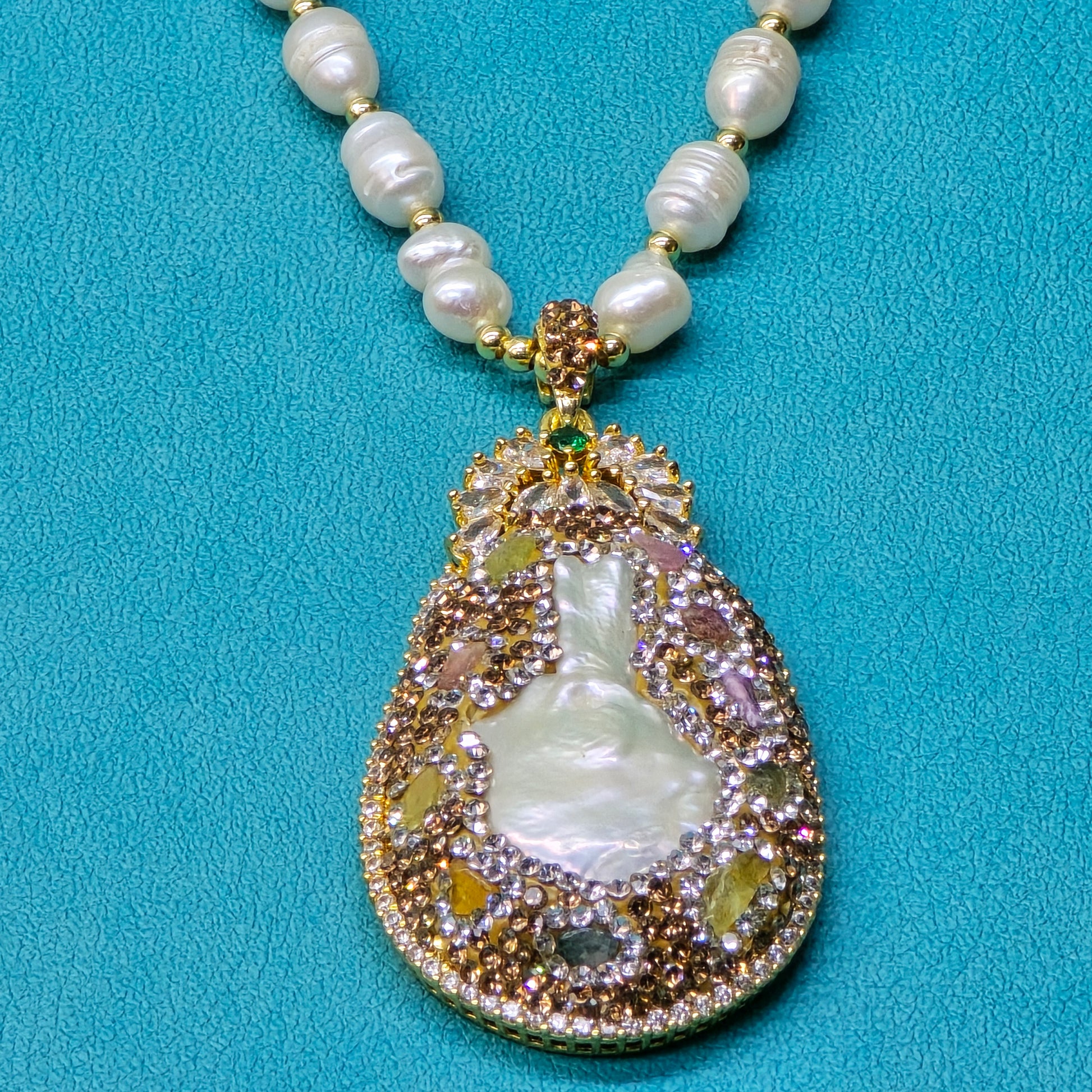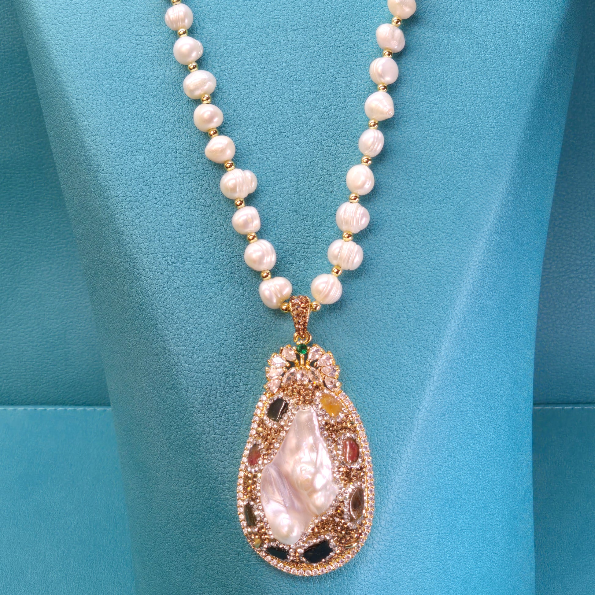 Unveil the sophisticated charm of our exquisite necklace, featuring a stunning large pendant with a central genuine natural baroque pearl, surrounded by white and gold-colored Austrian crystals and small natural rock-shaped tourmaline beads. At the top of the pendant, you'll find diamond-cut white zirconia crystals and a tiny round green zirconia crystal. This beautiful pendant hangs gracefully from a genuine freshwater pearl necklace, all set on luxurious gold-plated stainless steel. This piece offers not only style but also profound healing and spiritual benefits.