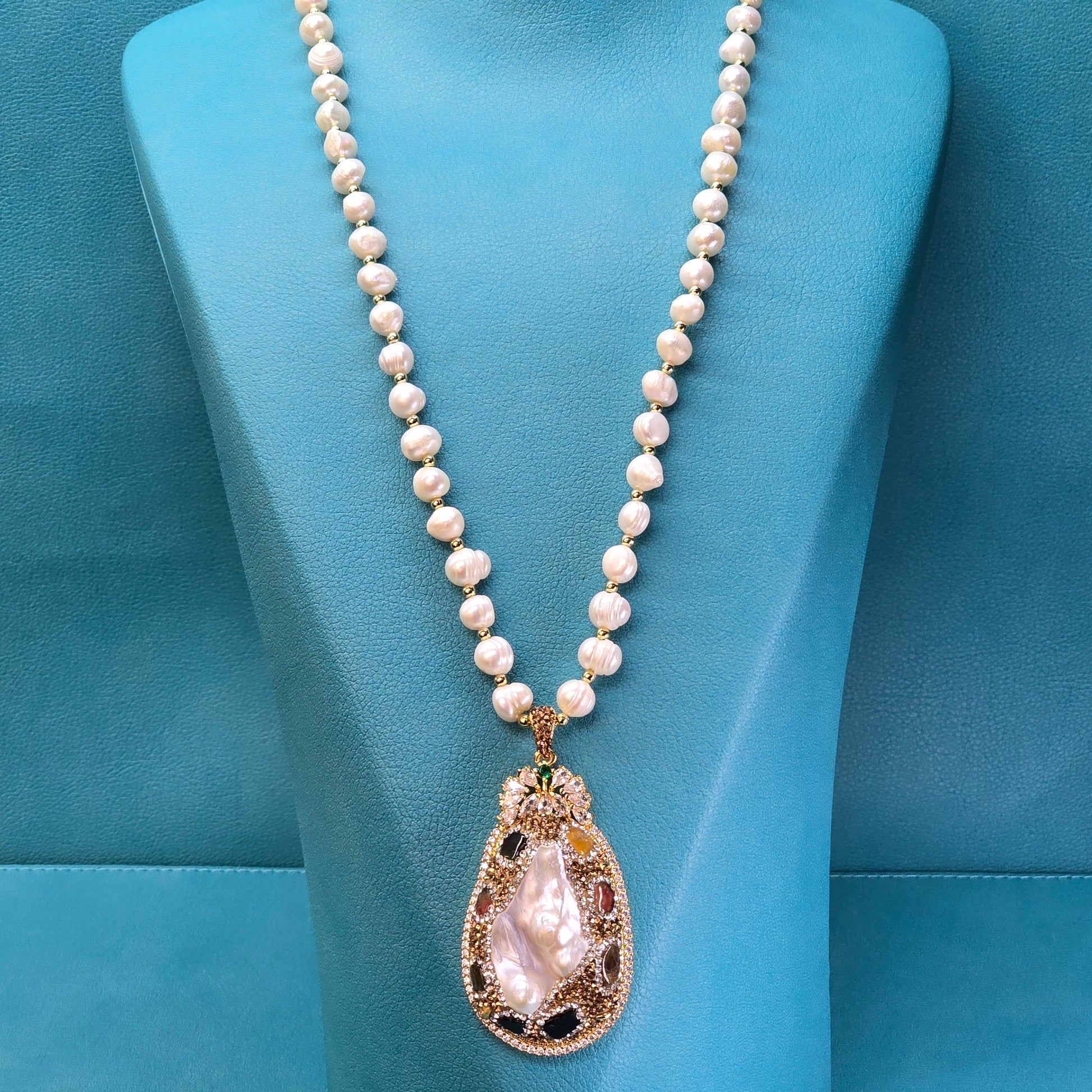 Elegant Necklace with Baroque Pearl, Austrian Crystals, Tourmaline, and Zirconia