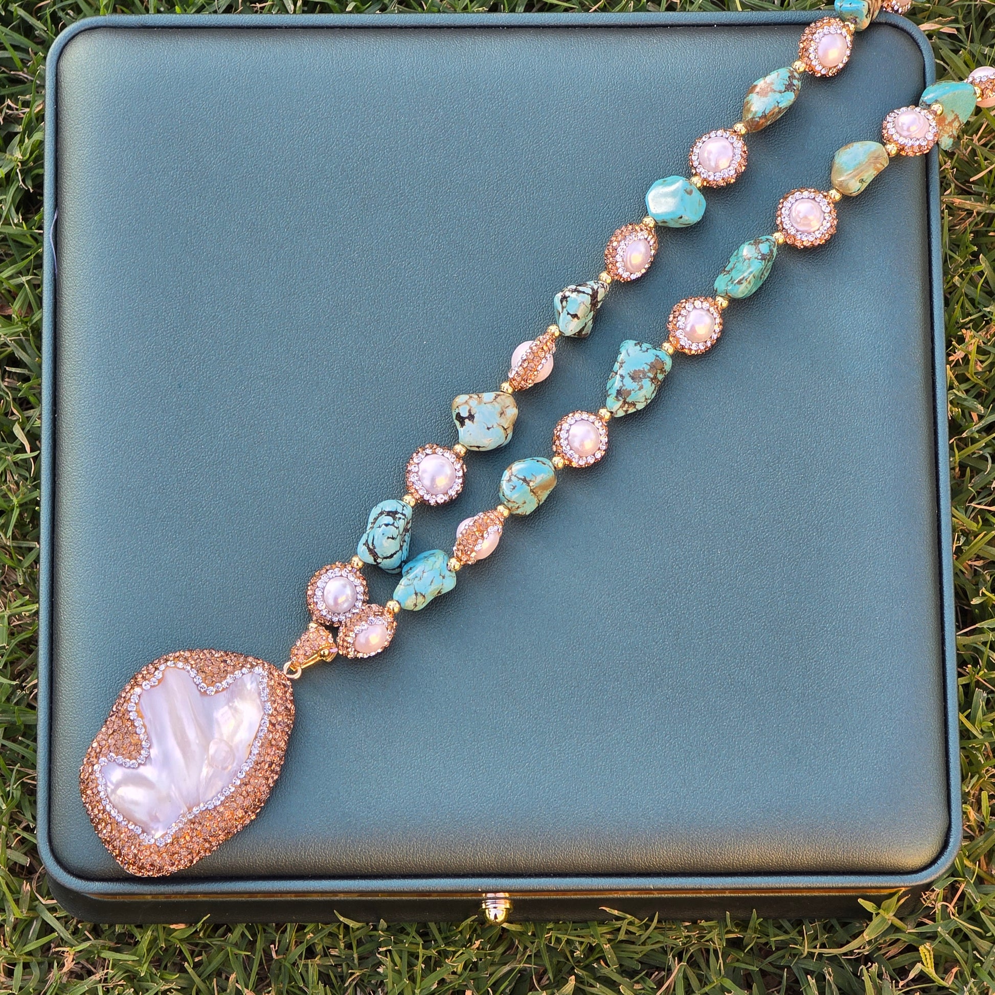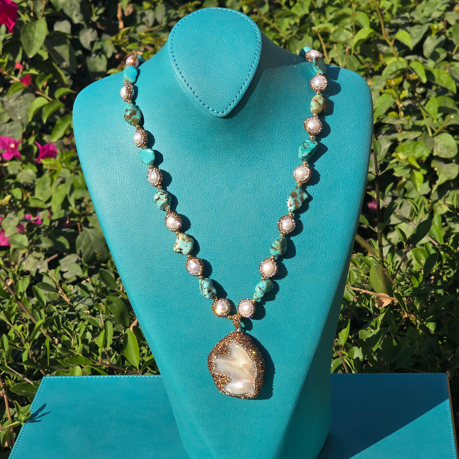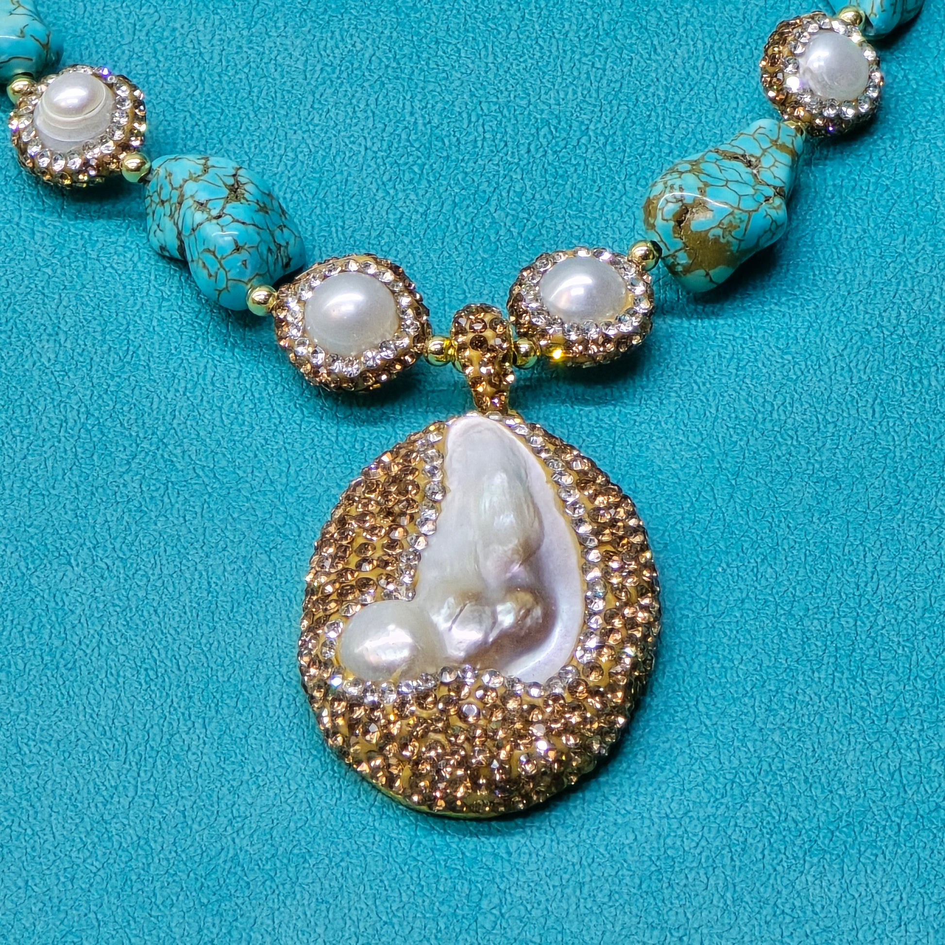 Discover the timeless elegance of our stunning necklace, featuring a large, natural-shaped baroque pearl pendant, surrounded by gold and white colored Austrian micro crystals. This exquisite pendant gracefully hangs from a beautiful necklace crafted from natural rock shaped turquoise beads and white freshwater pearls, adorned with gold and white Austrian crystals, all set on luxurious gold-plated stainless steel. This piece not only enhances your style but also offers a wealth of healing and spiritual benefits.
