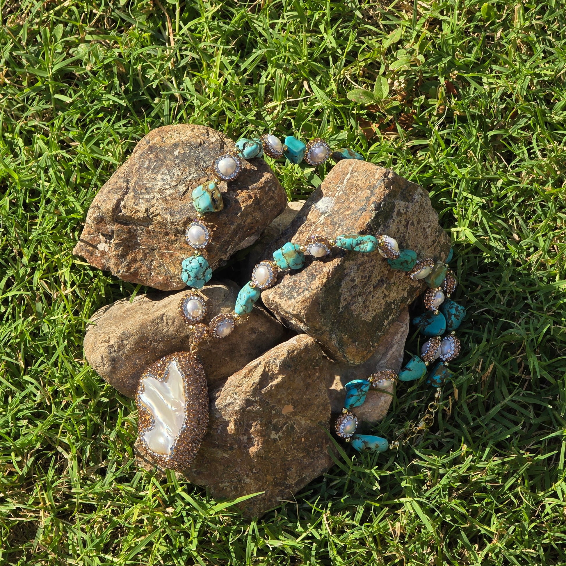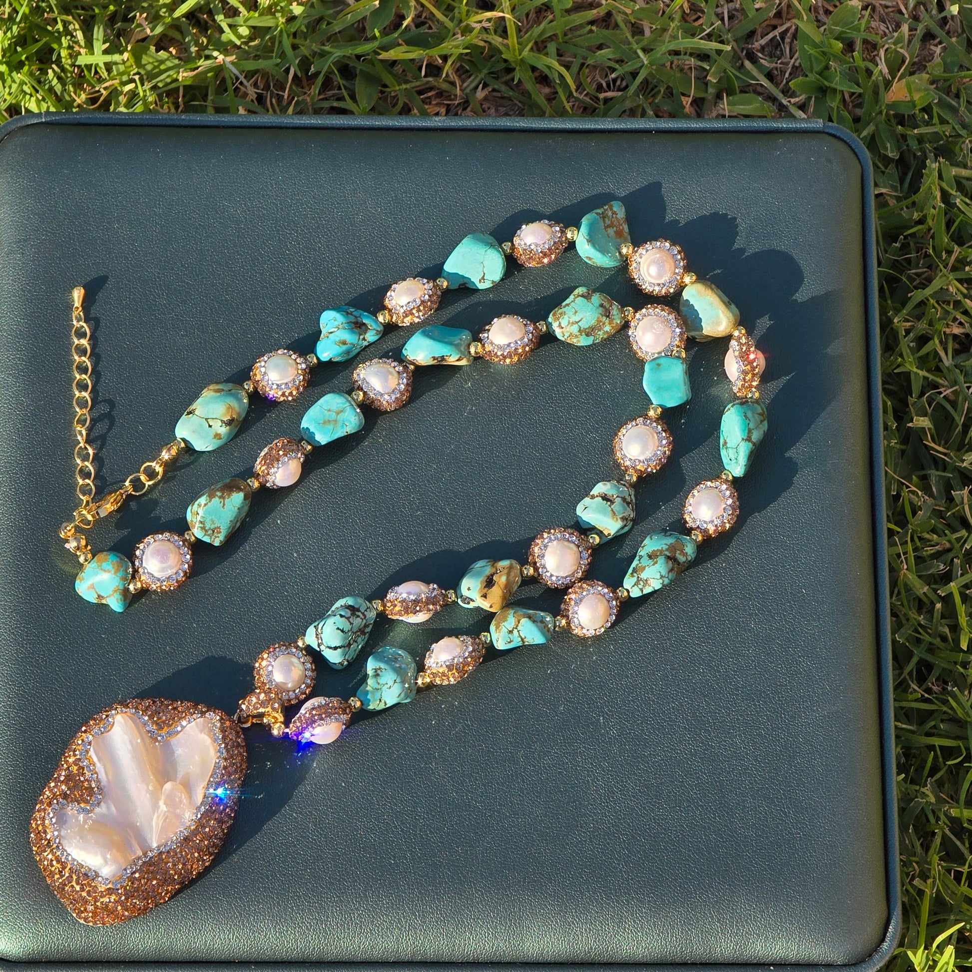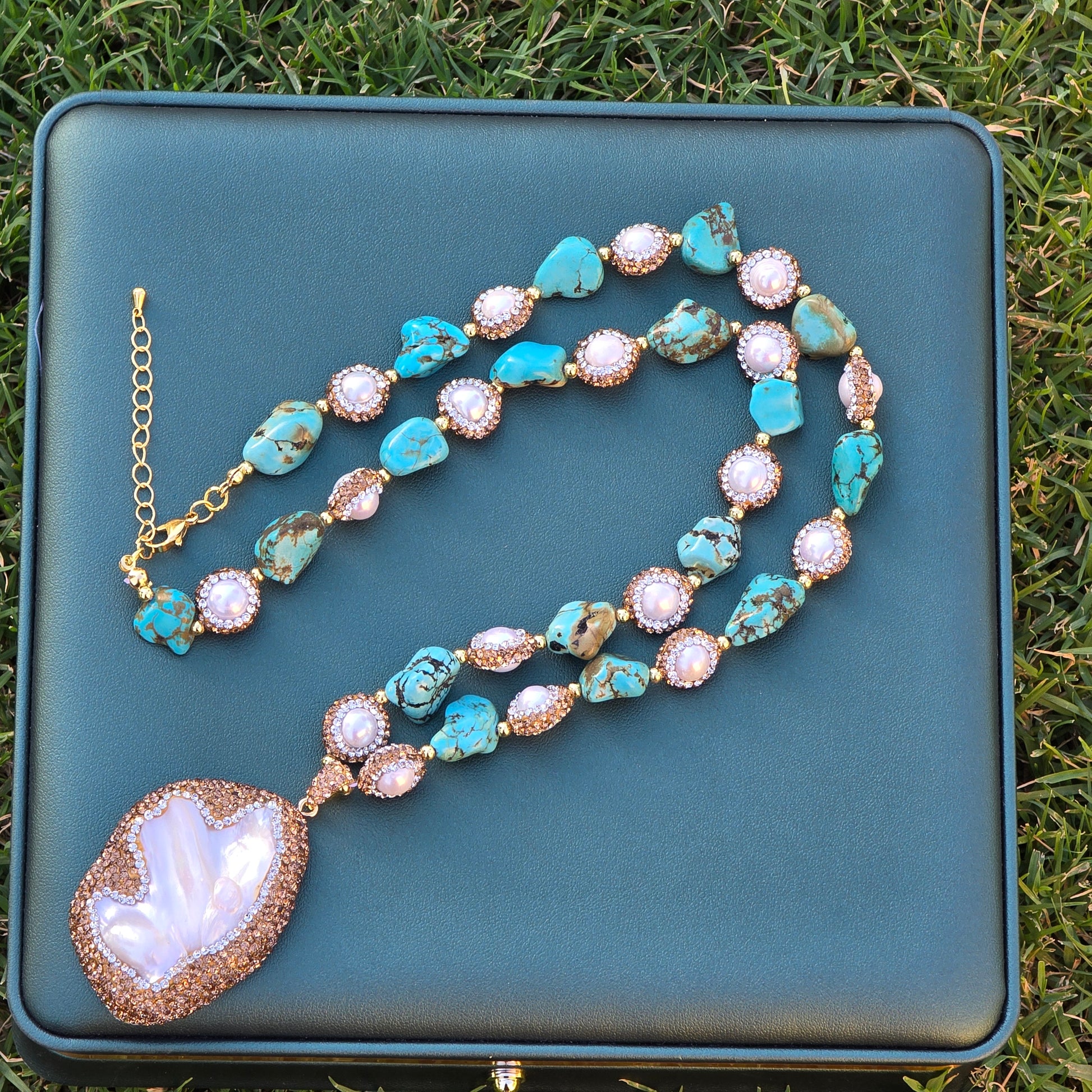 Discover the timeless elegance of our stunning necklace, featuring a large, natural-shaped baroque pearl pendant, surrounded by gold and white colored Austrian micro crystals. This exquisite pendant gracefully hangs from a beautiful necklace crafted from natural rock shaped turquoise beads and white freshwater pearls, adorned with gold and white Austrian crystals, all set on luxurious gold-plated stainless steel. This piece not only enhances your style but also offers a wealth of healing and spiritual benefits.