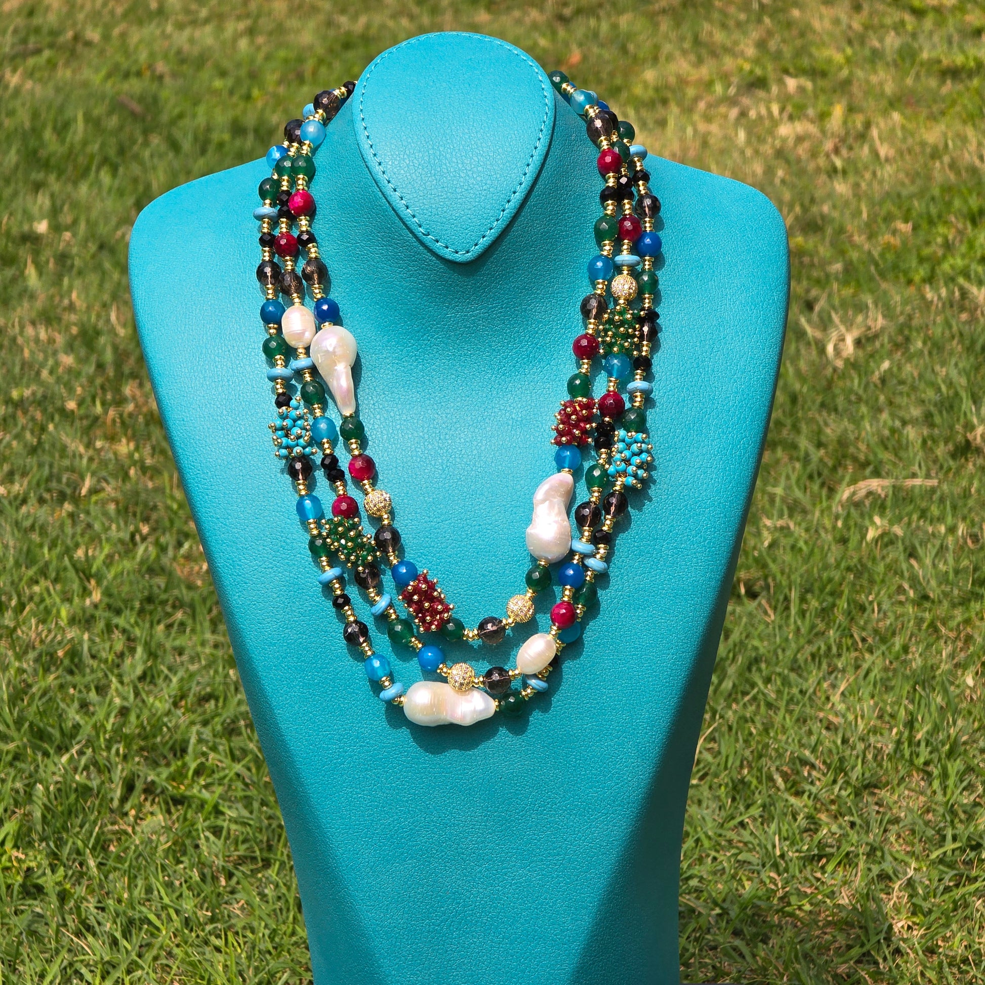 Step into the vibrant spirit of Mexico with this bold yet elegant handcrafted necklace. Designed to capture the essence of bohemian luxury, this exquisite piece is meticulously crafted with an array of natural stones and crystals, creating a stunning fusion of color, texture, and artistry.