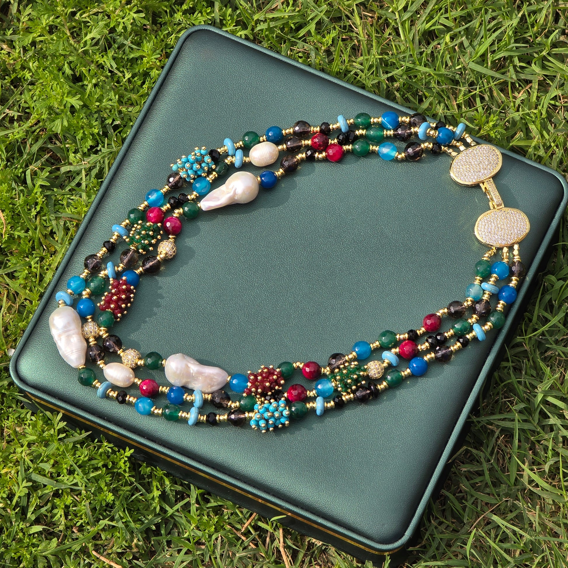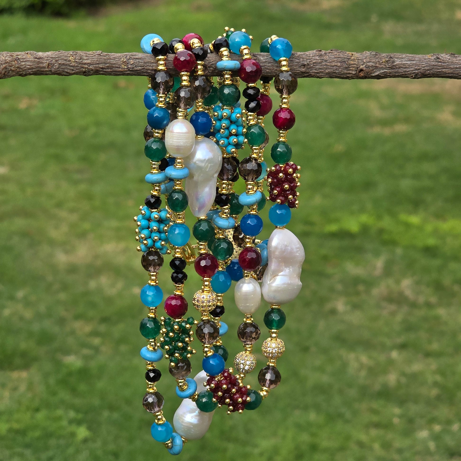 ✨ Grape-Inspired Beaded Details – A playful yet elegant mix of Ruby, Turquoise, and Green Aventurine, woven seamlessly for a rich, organic look.