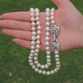 Indulge in timeless sophistication with this exquisite infinite-length necklace, crafted from high-quality, round freshwater pearls that exude natural luster. The stunning silver flower clasp is more than just a closure—it's a statement. Wear it asymmetrically for a touch of modern elegance, showcase it as a focal point, or discreetly tuck it away for a classic, uninterrupted strand of pearls.