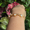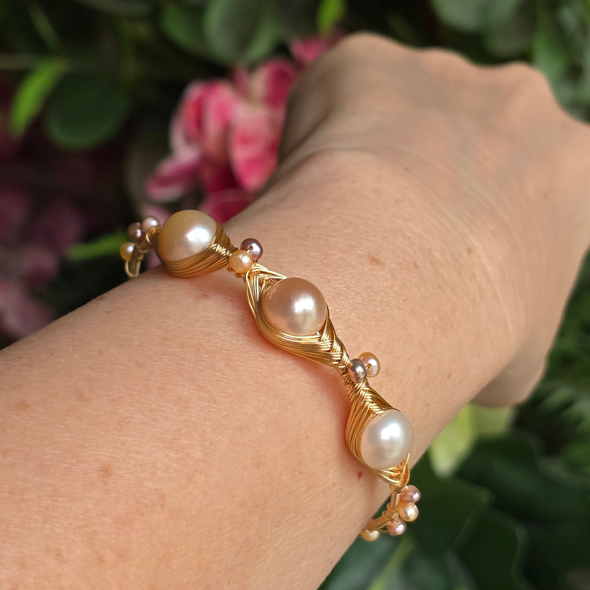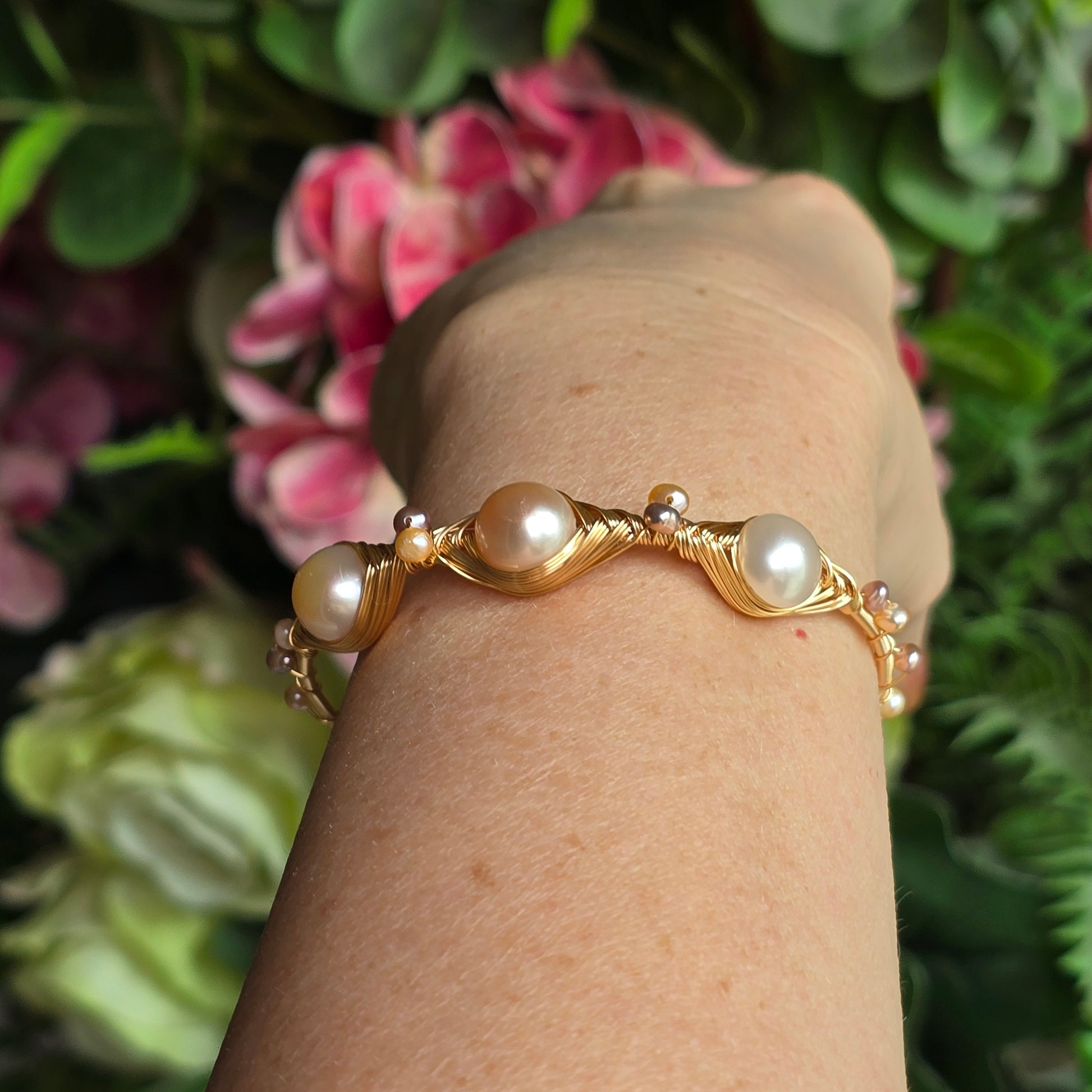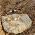 A masterpiece of craftsmanship, this lightweight gold-plated stainless steel bangle is designed to captivate. Featuring three lustrous large freshwater pearls as the centerpiece, it is delicately accented with tiny pearls nestled between, adding a touch of ethereal beauty. At the closure, two smaller pearls complete the design with grace.