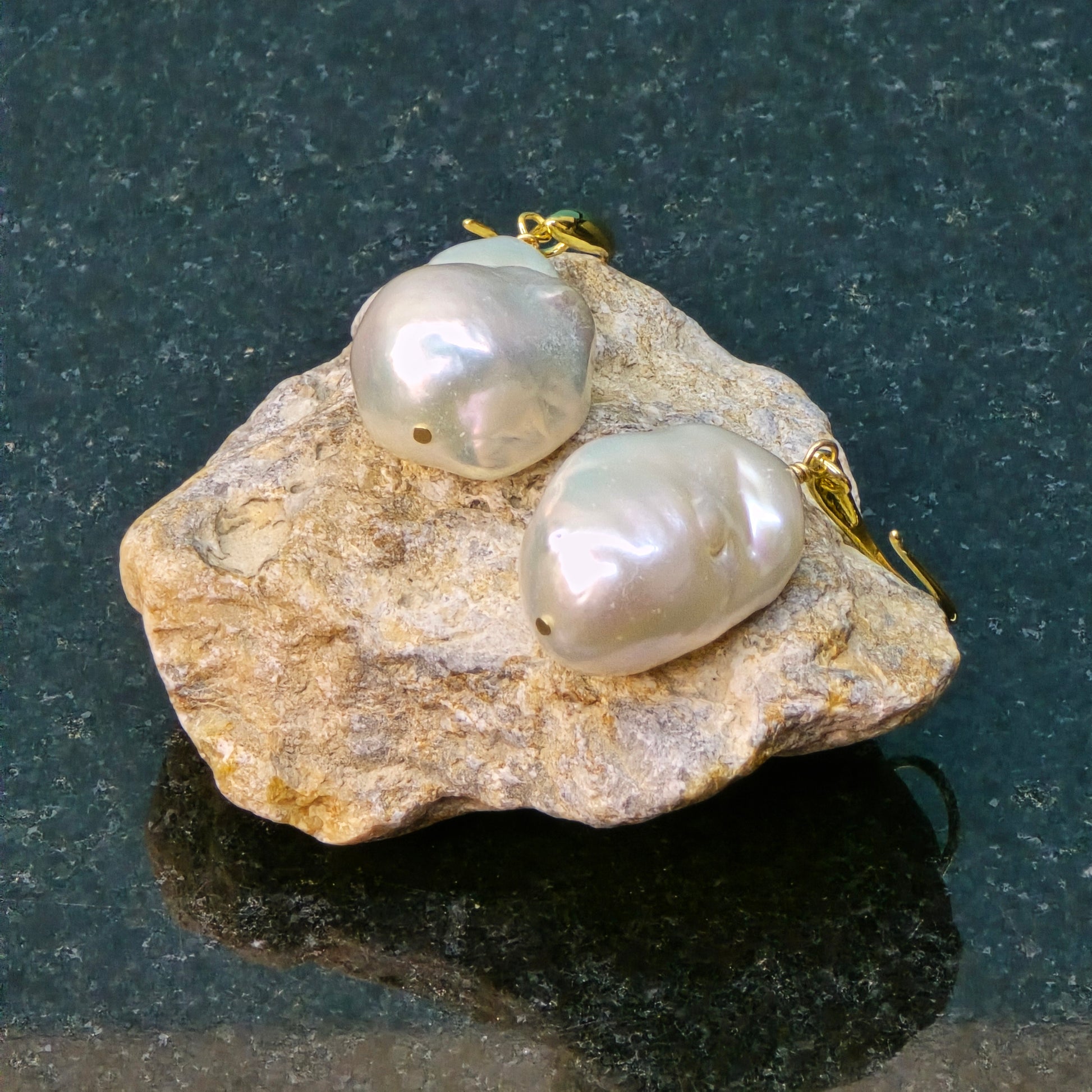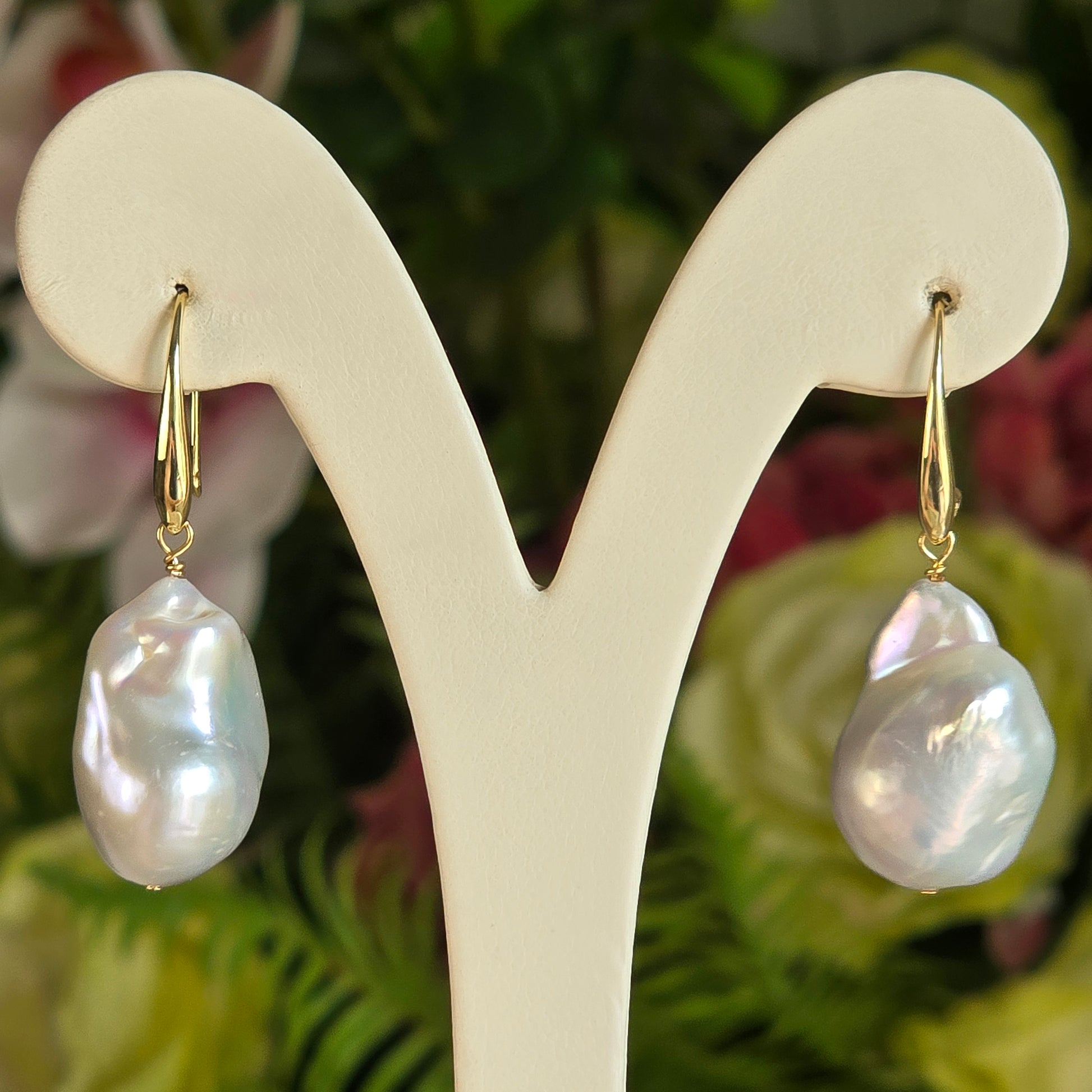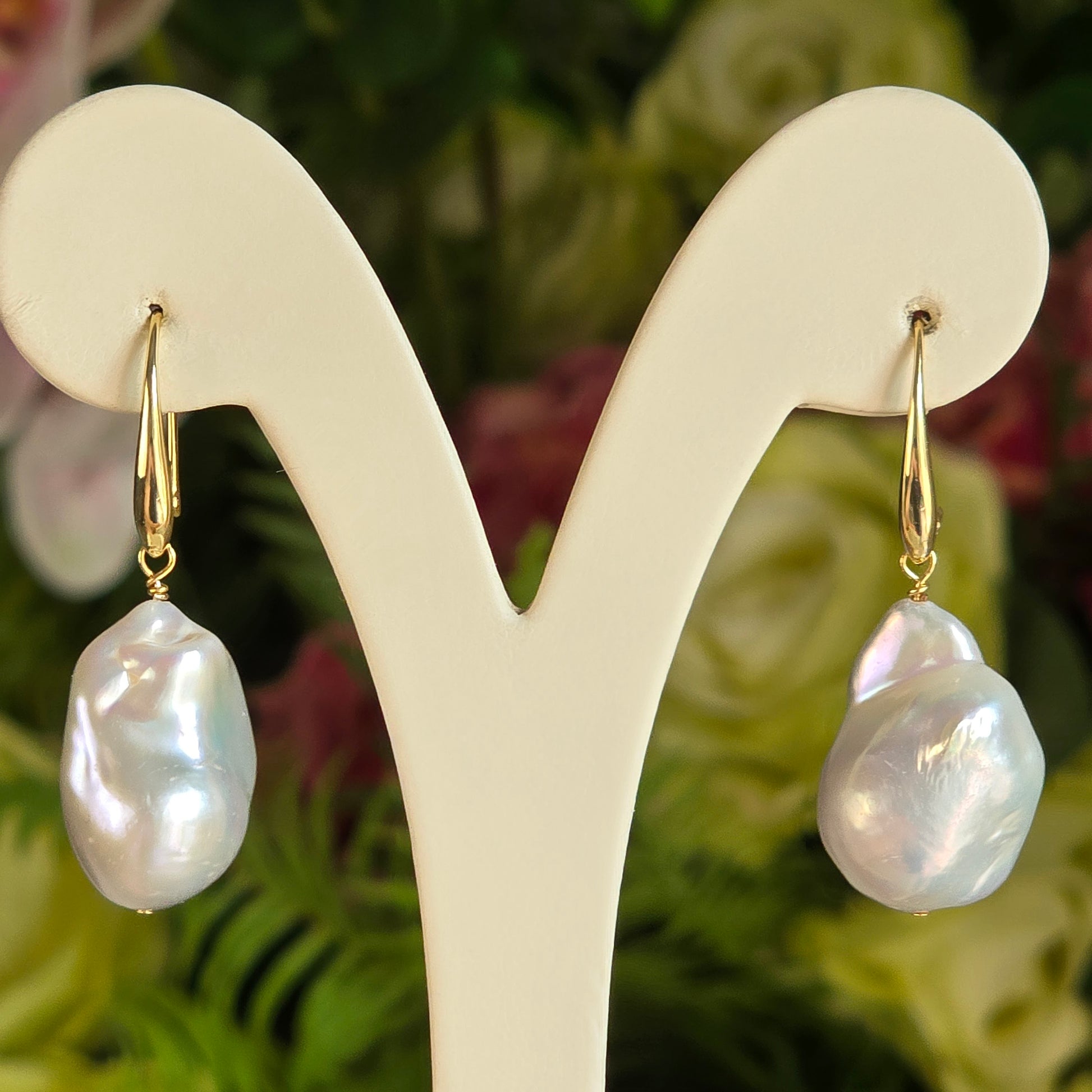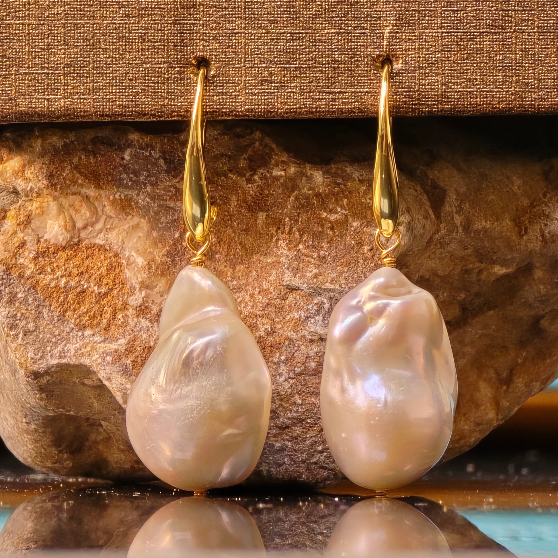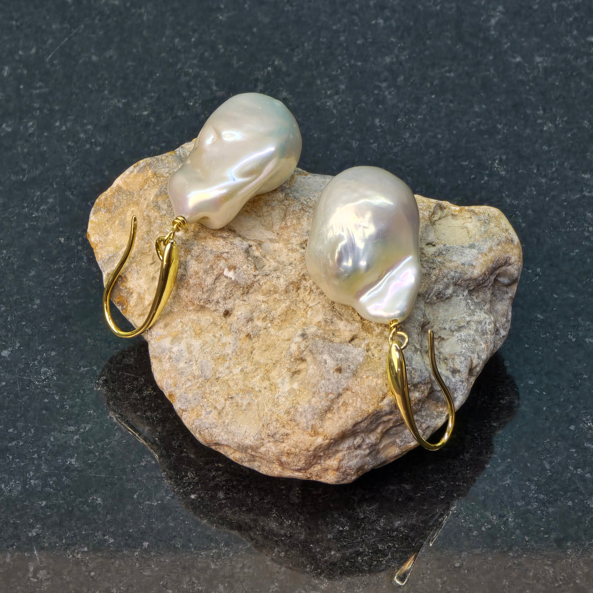 These stunning polished white baroque pearl dangle earrings highlight the organic beauty of each pearl, making every pair truly one of a kind. Finished with non-tarnish gold-plated stainless steel hooks, they offer a warm, timeless glow — perfect for adding subtle elegance to any outfit.