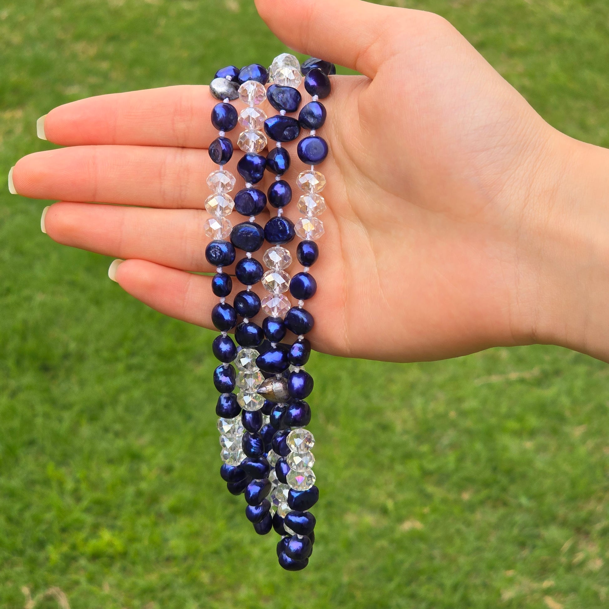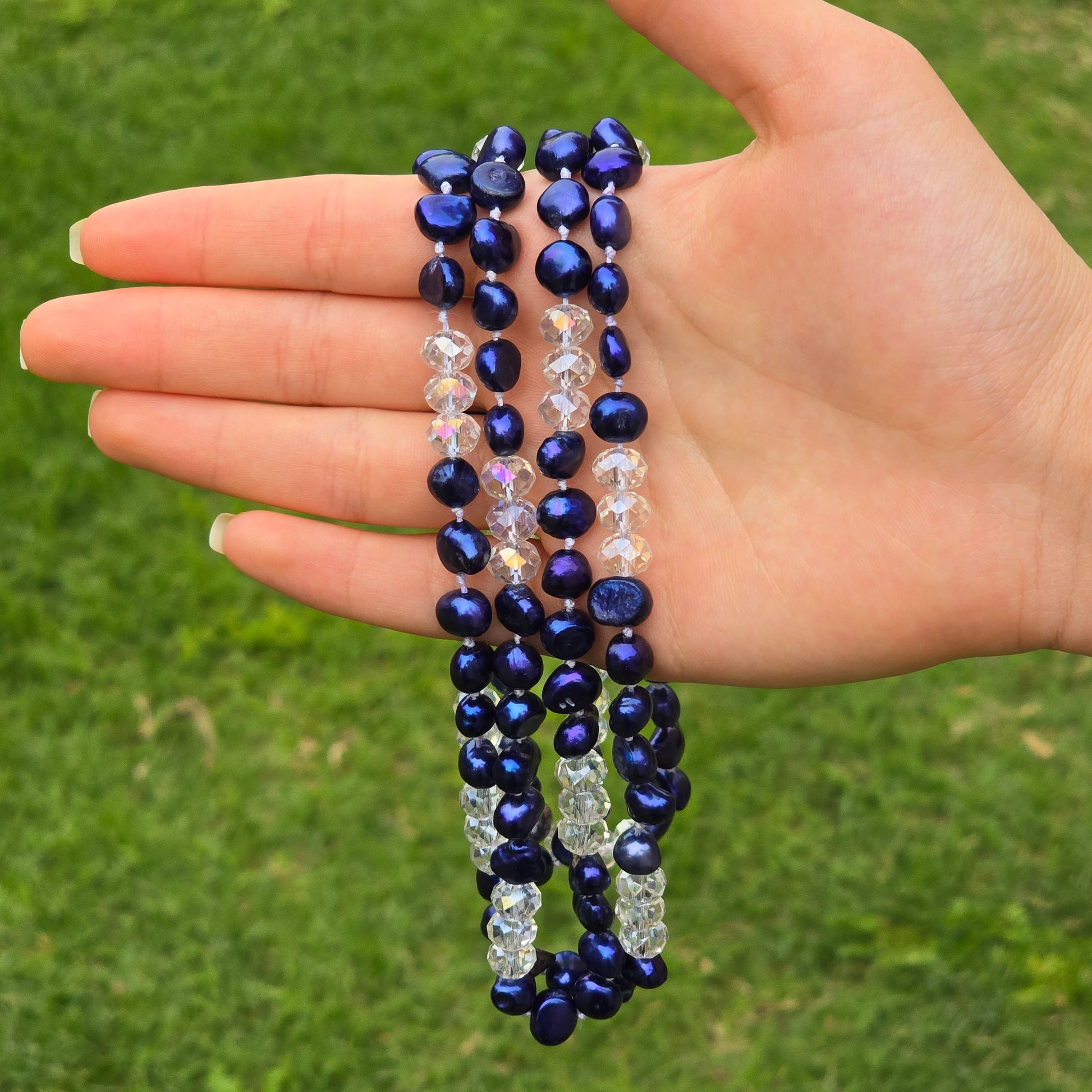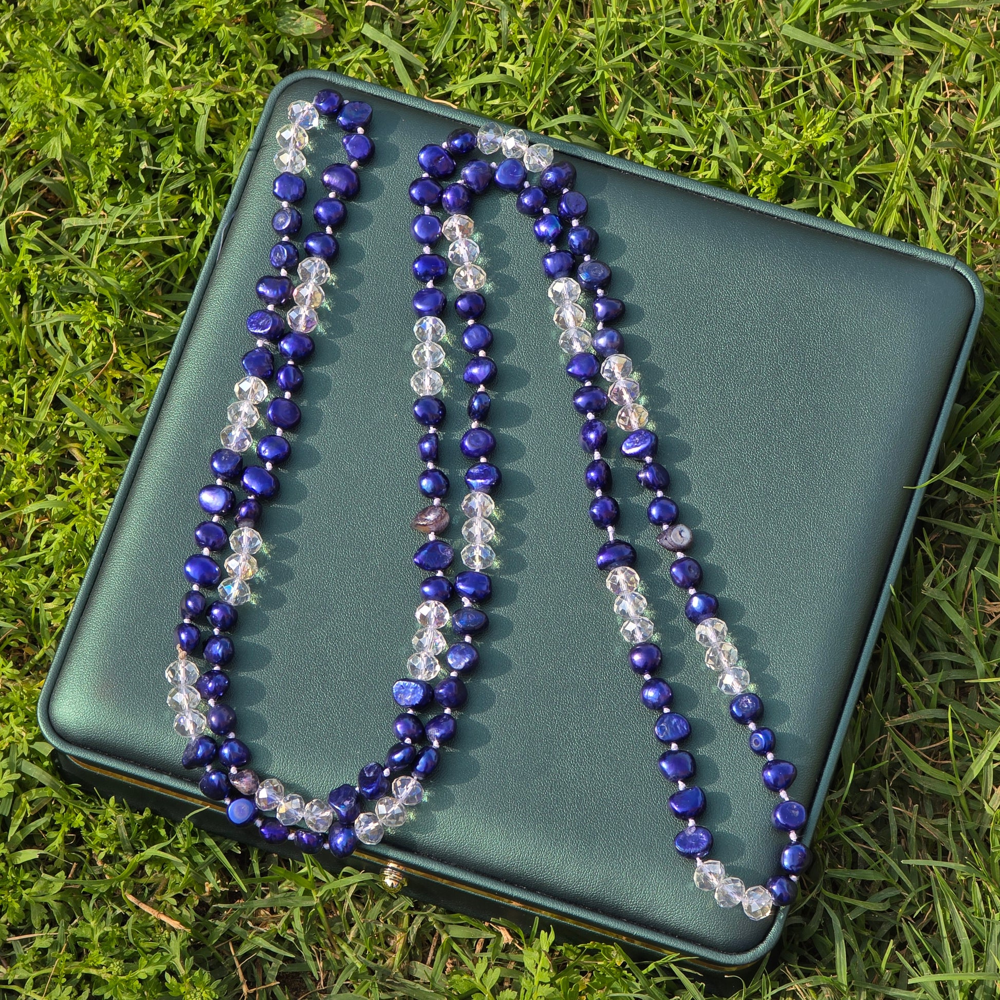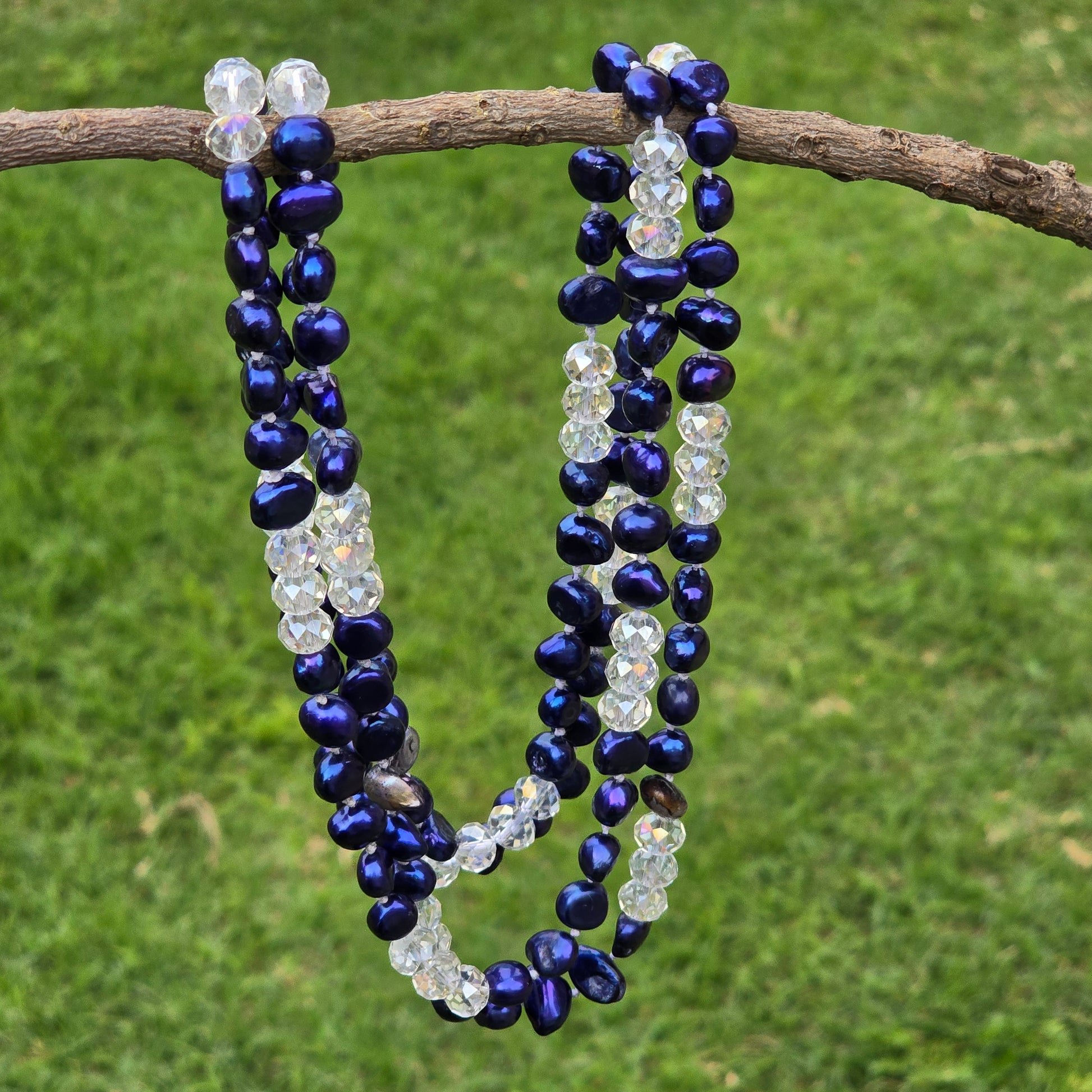 A stunning fusion of unique irregular-shaped indigo blue freshwater pearls and radiant faceted Austrian crystals. This versatile piece effortlessly captures the light, reflecting a brilliant glow that enhances any outfit.