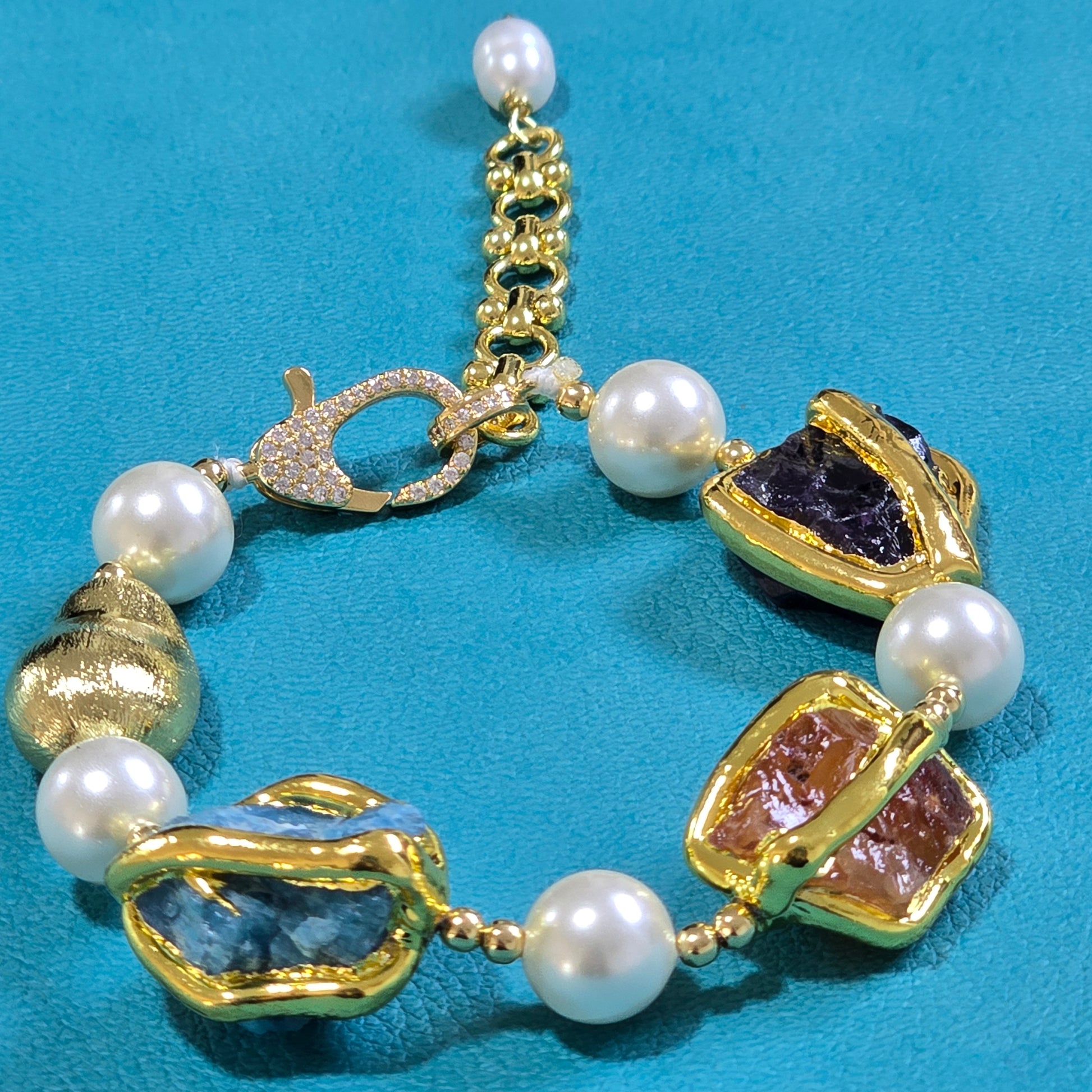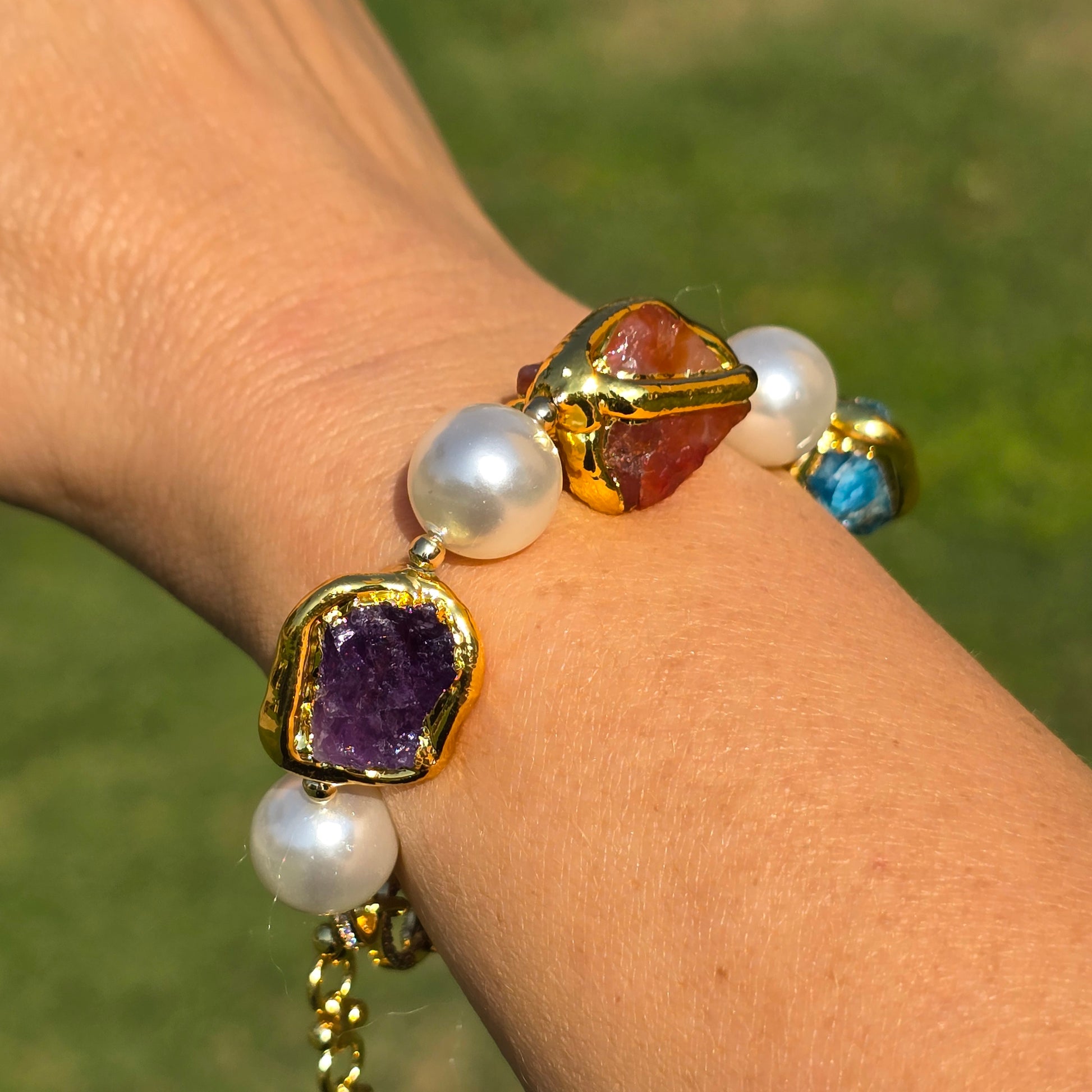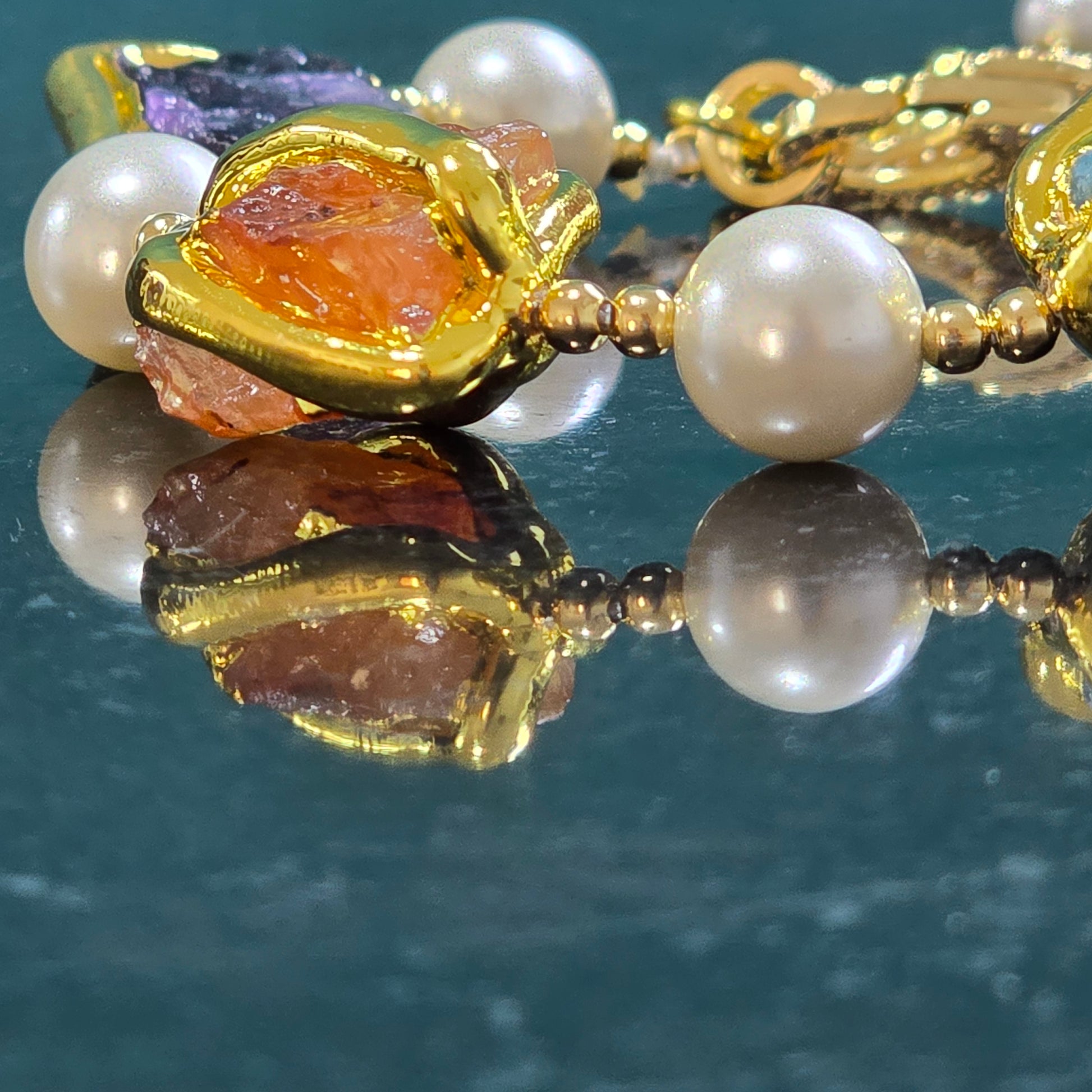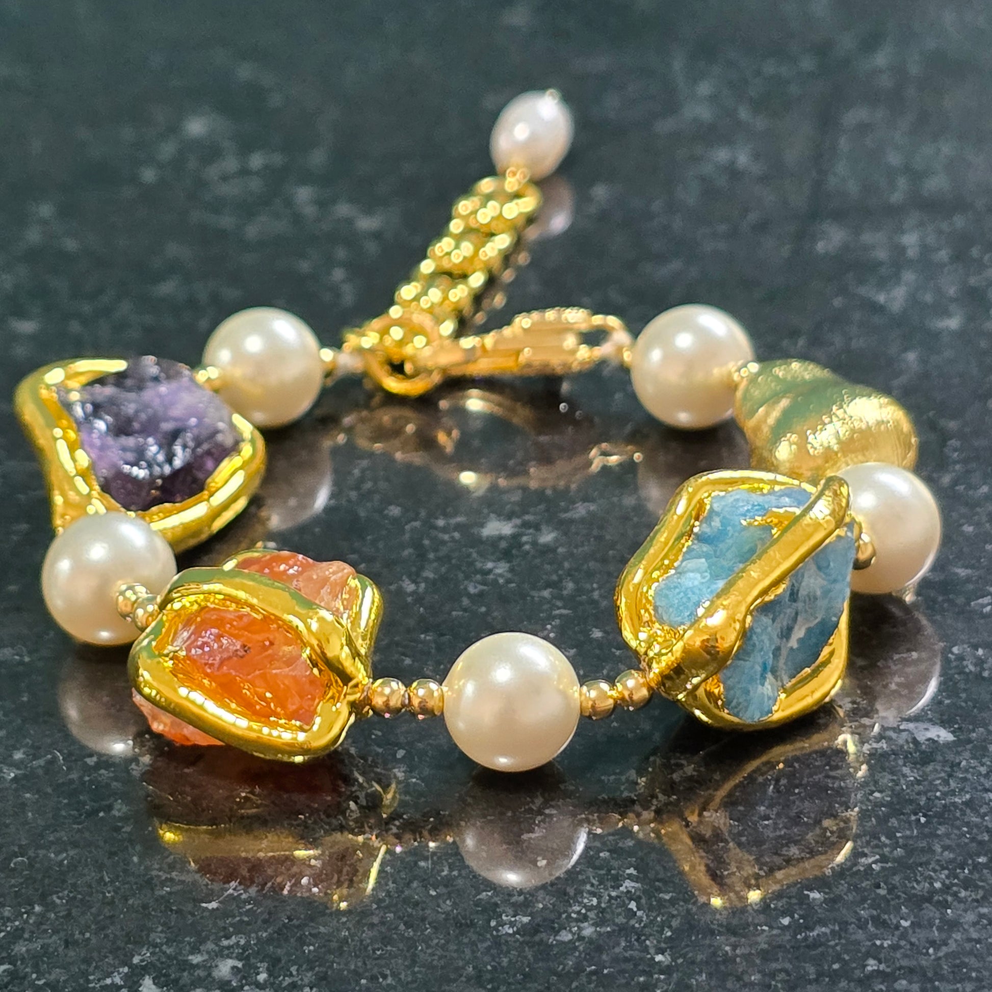 A stunning fusion of refined elegance and natural beauty, this bracelet features high-luster Mallorca shell pearls, perfectly complemented by raw, rock-shaped Amethyst, Carnelian, and Aquamarine. Each vibrant gemstone is framed in gold-plated stainless steel, enhancing its organic charm with a luxurious touch of brilliance.