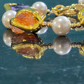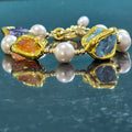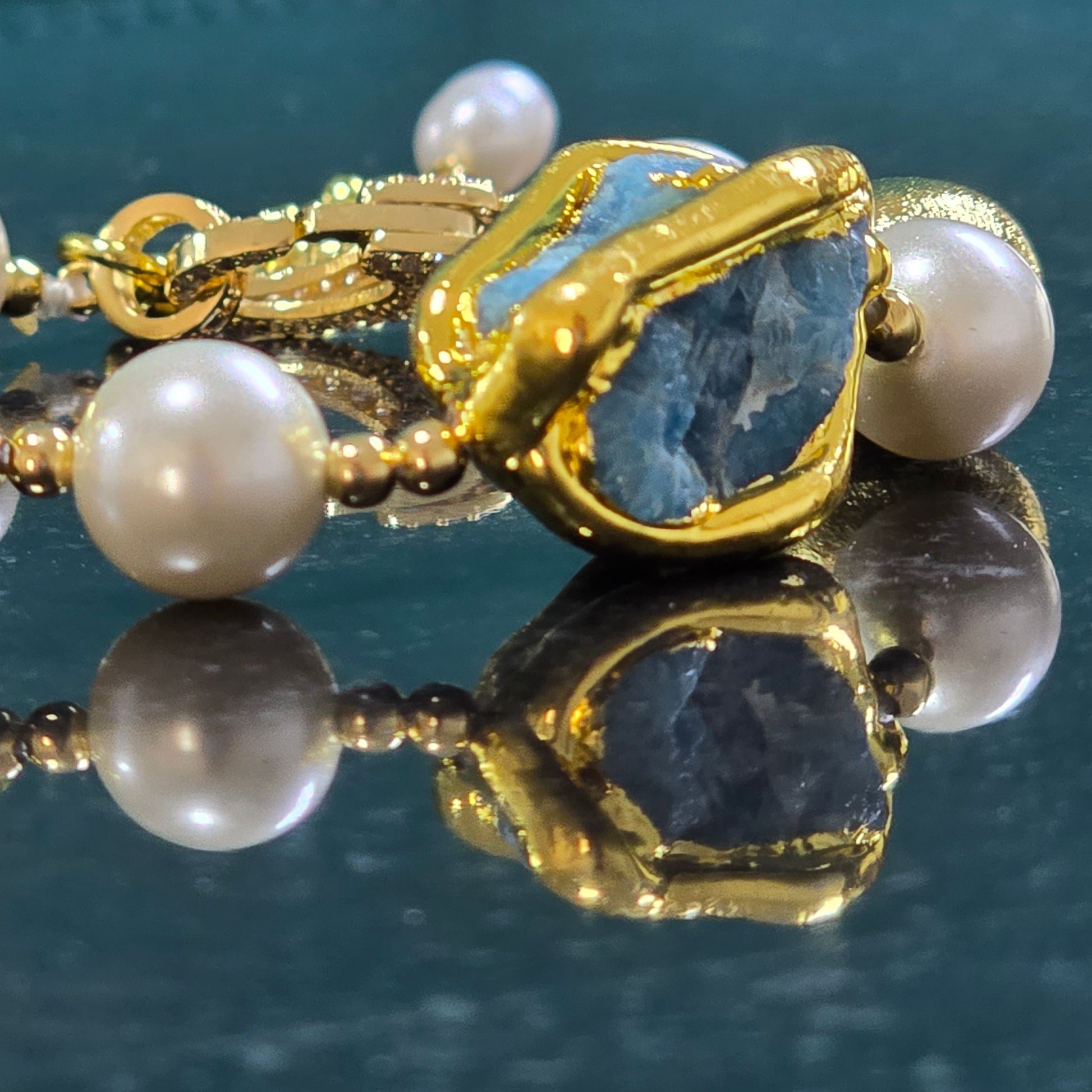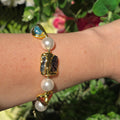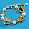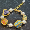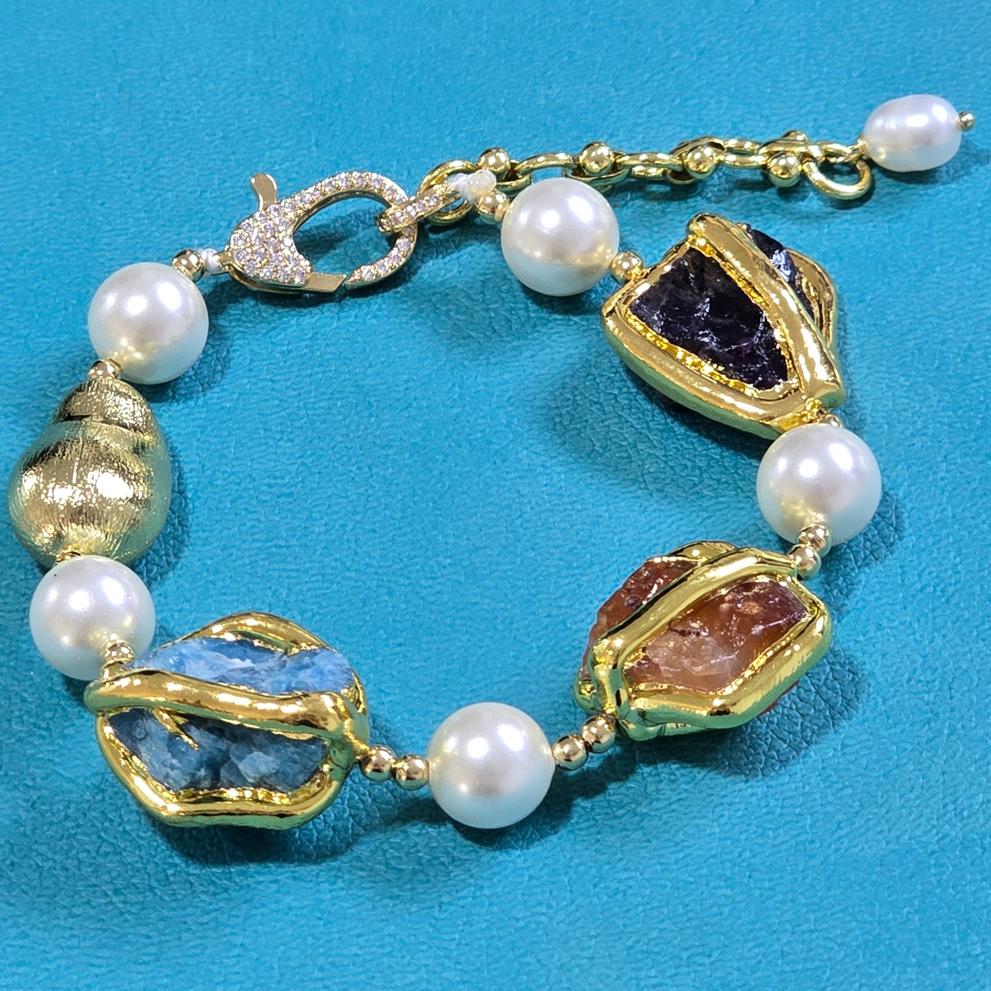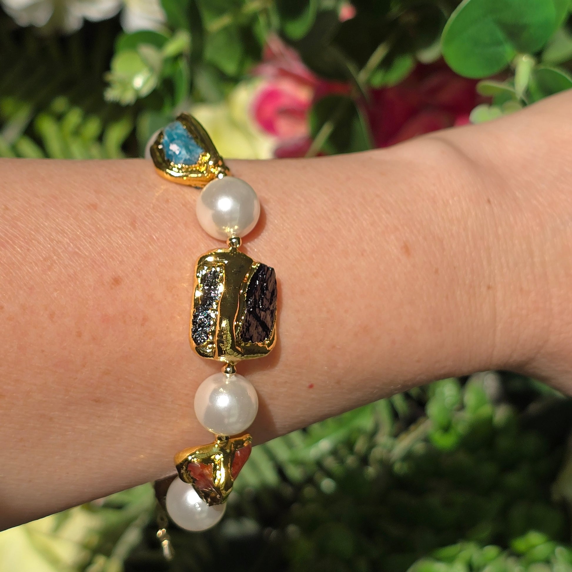 A stunning fusion of refined elegance and natural beauty, this bracelet features high-luster Mallorca shell pearls, perfectly complemented by raw, rock-shaped Amethyst, Carnelian, and Aquamarine. Each vibrant gemstone is framed in gold-plated stainless steel, enhancing its organic charm with a luxurious touch of brilliance.
