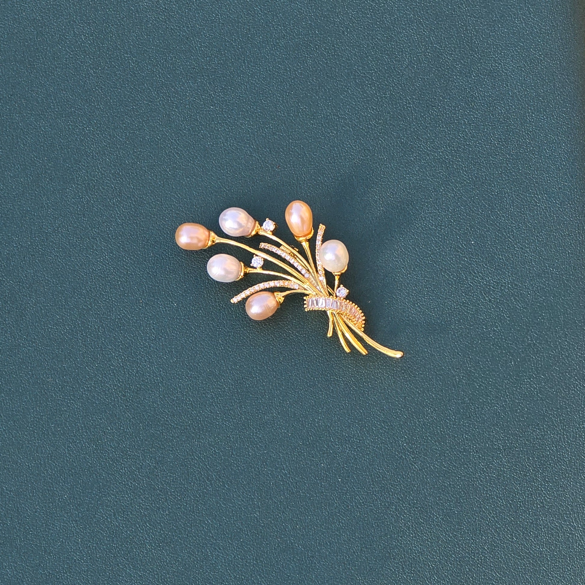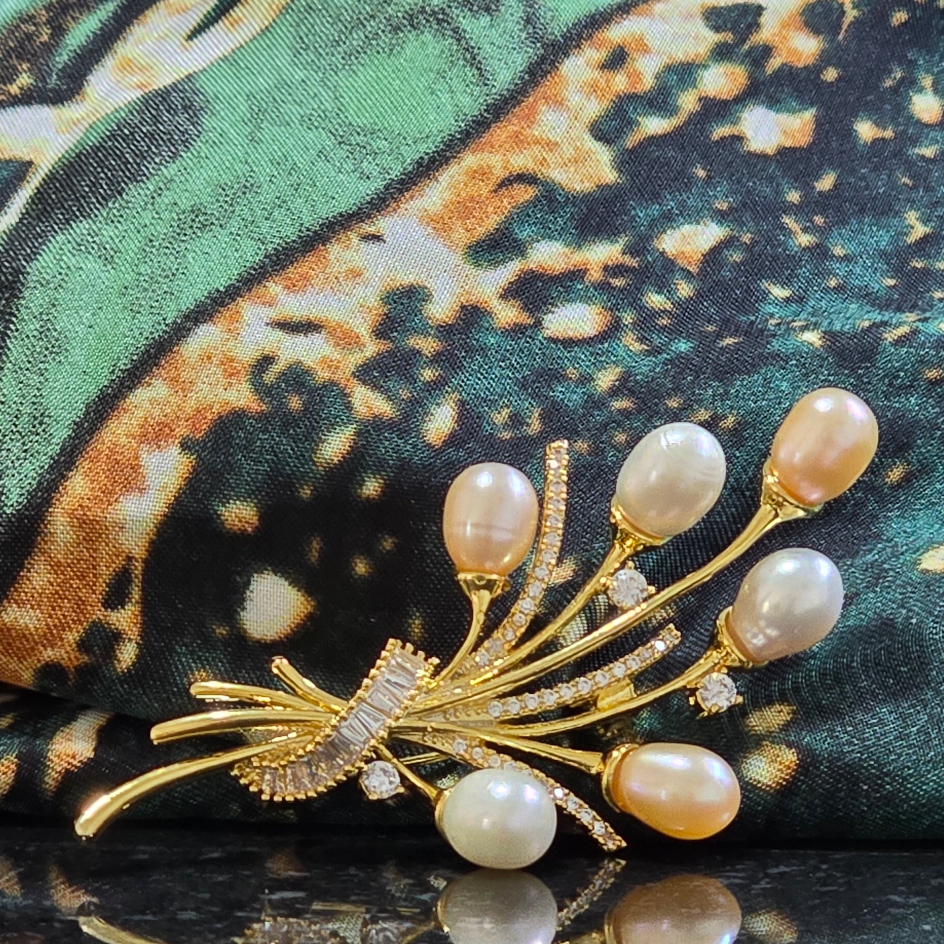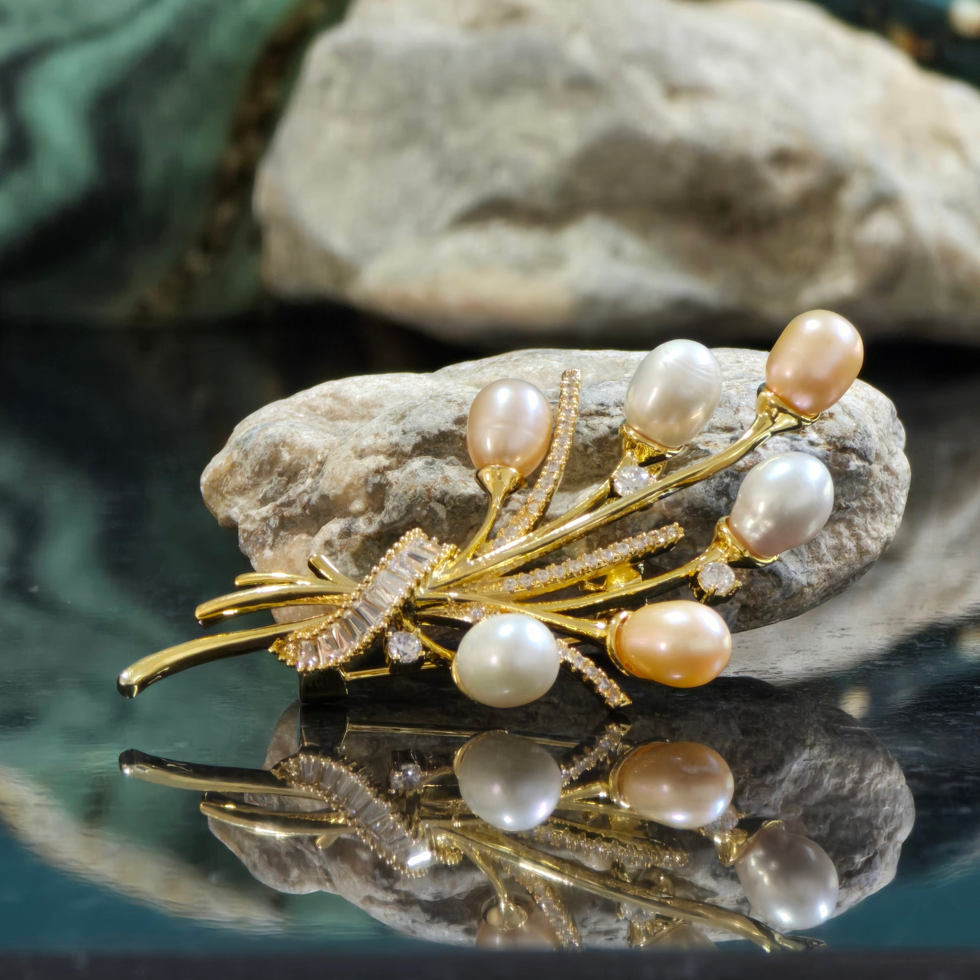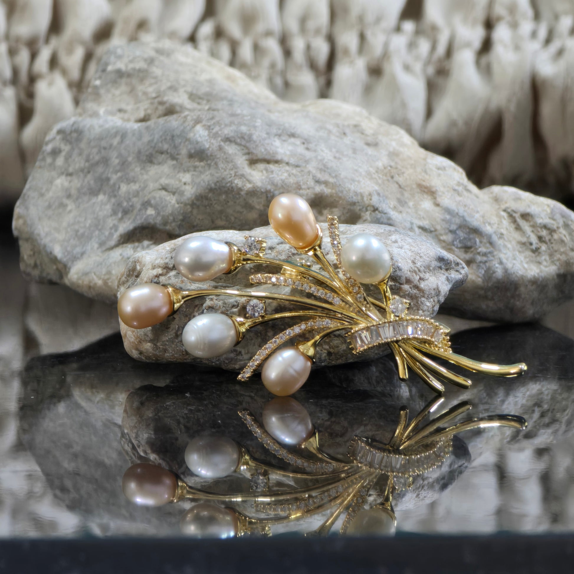 A charming bouquet-shaped brooch crafted in a gold-plated stainless steel frame, featuring six delicate flowers made of white and peach-blossom-pink AAA-quality freshwater pearls. The bouquet is gracefully tied with a shimmering bow made of baguette-cut, AAA-quality white CZ crystals — a perfect blend of softness and sparkle.💛