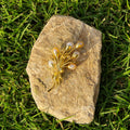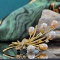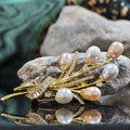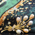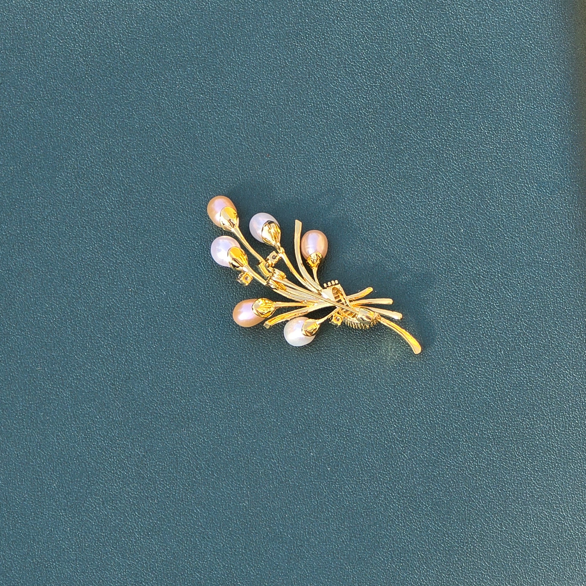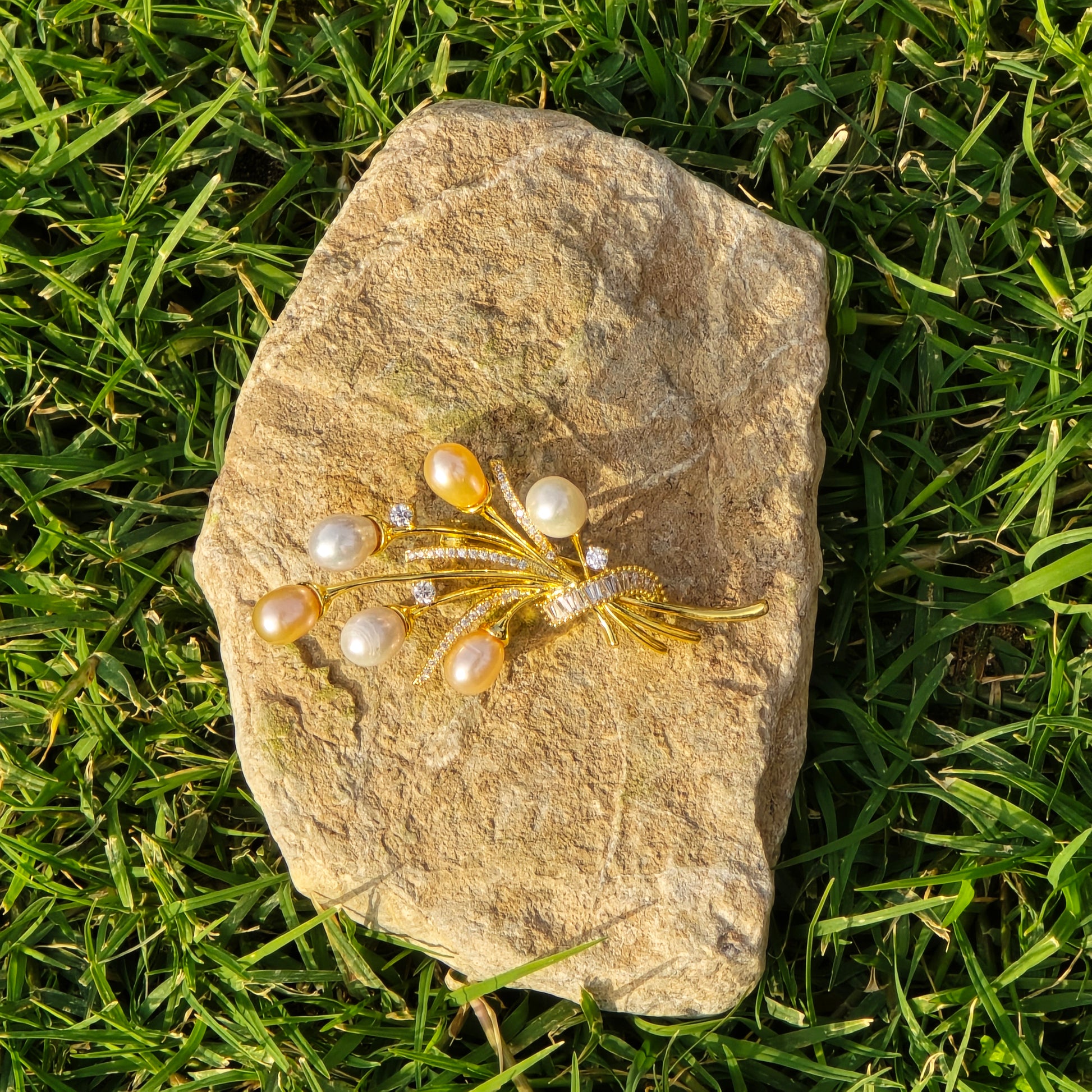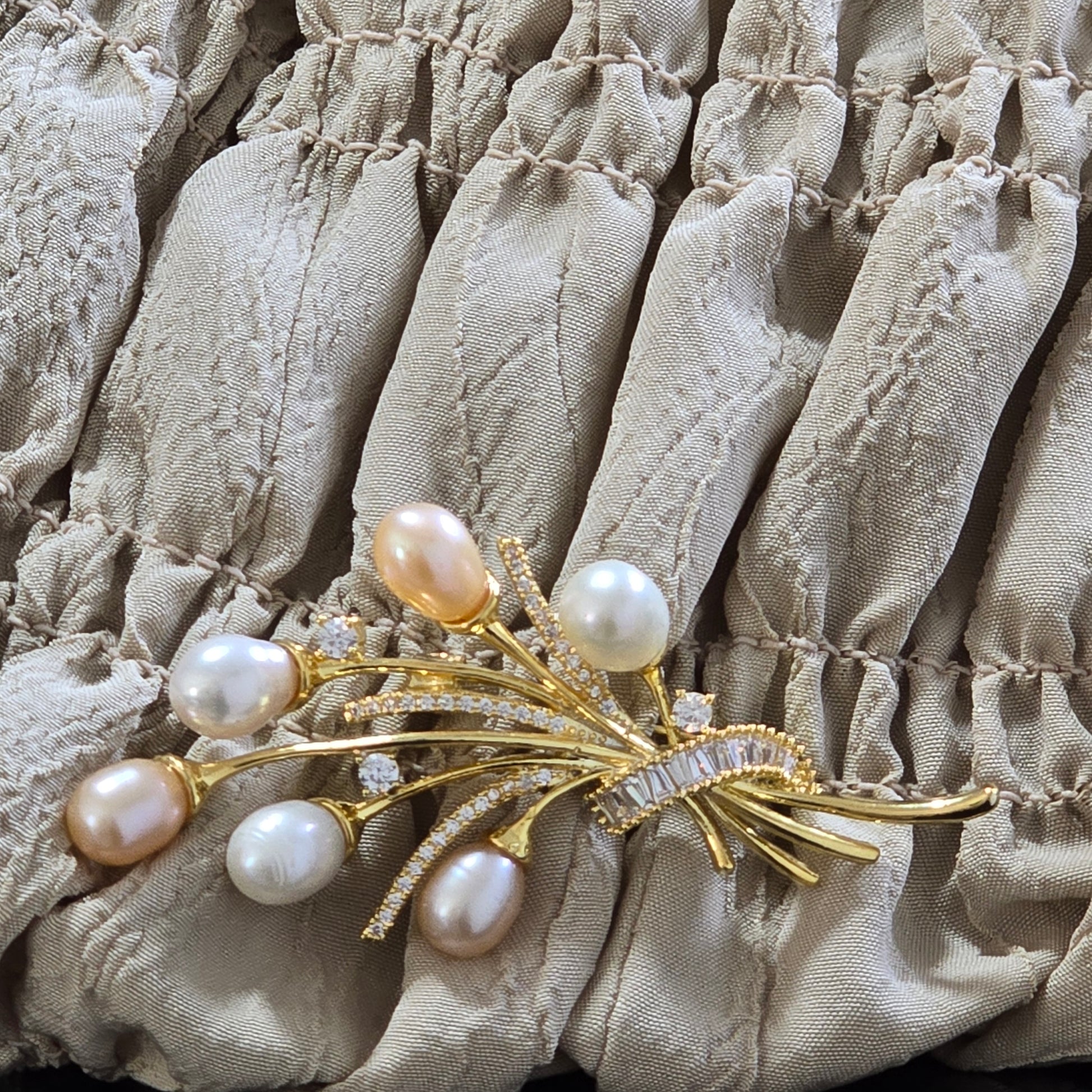 A charming bouquet-shaped brooch crafted in a gold-plated stainless steel frame, featuring six delicate flowers made of white and peach-blossom-pink AAA-quality freshwater pearls. The bouquet is gracefully tied with a shimmering bow made of baguette-cut, AAA-quality white CZ crystals — a perfect blend of softness and sparkle.💛