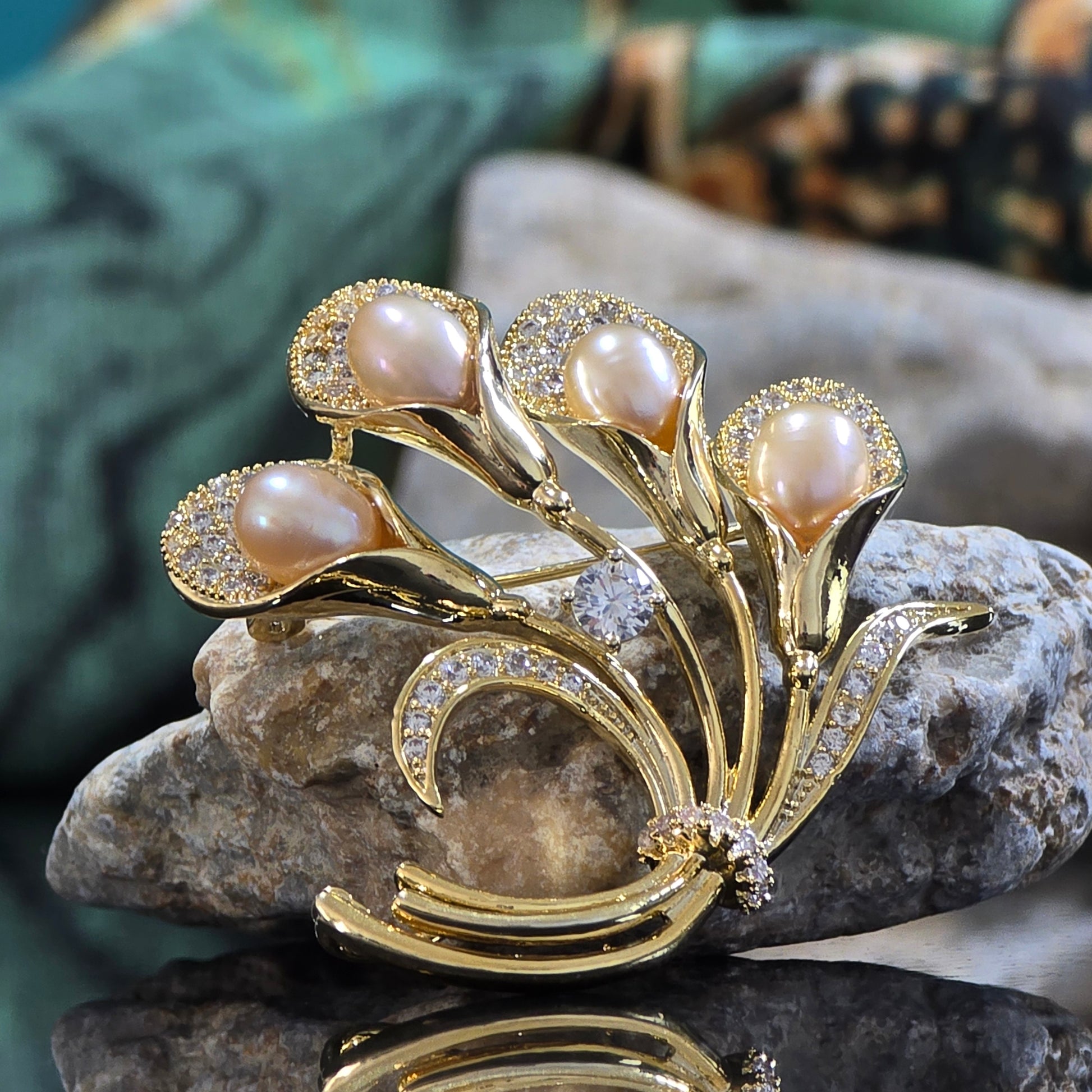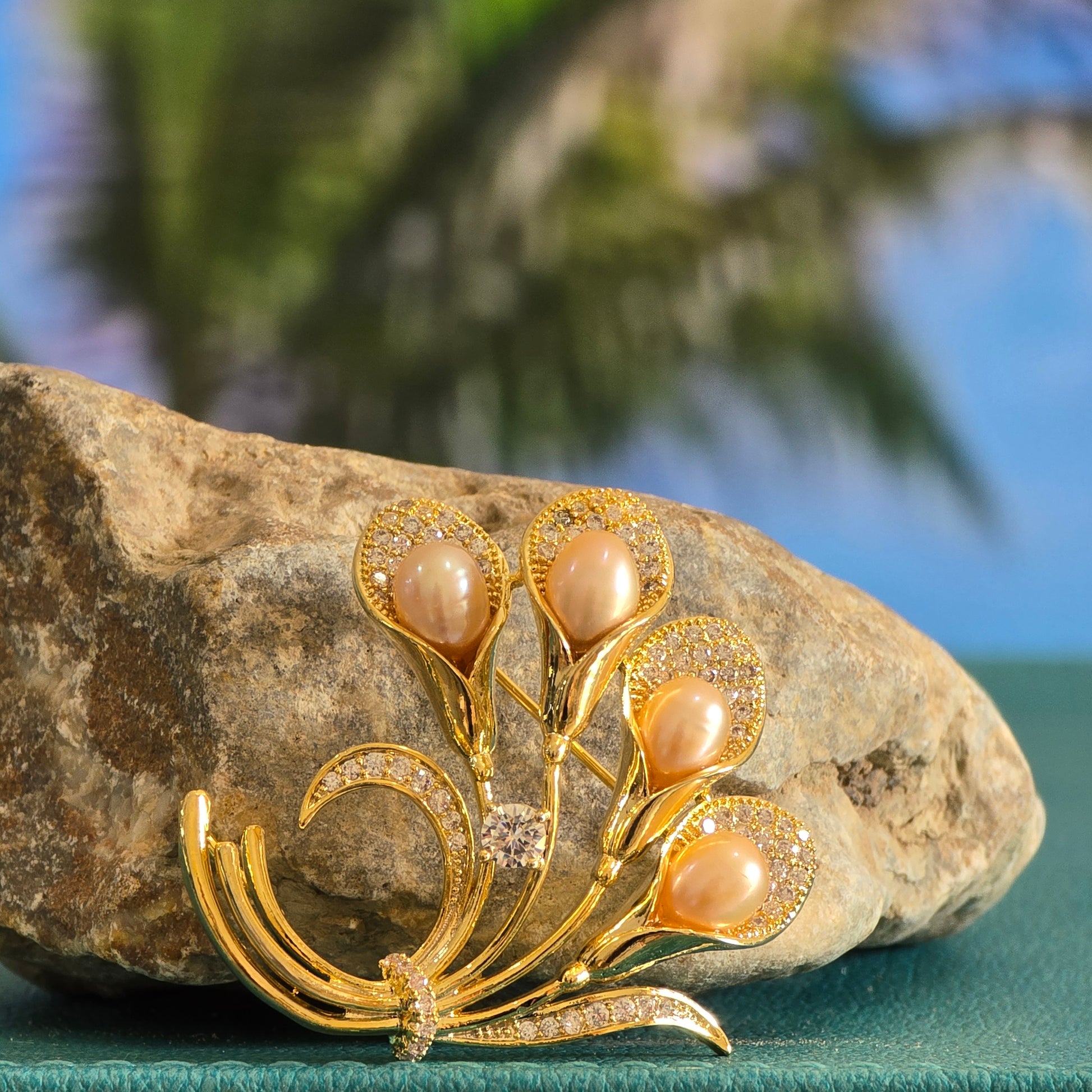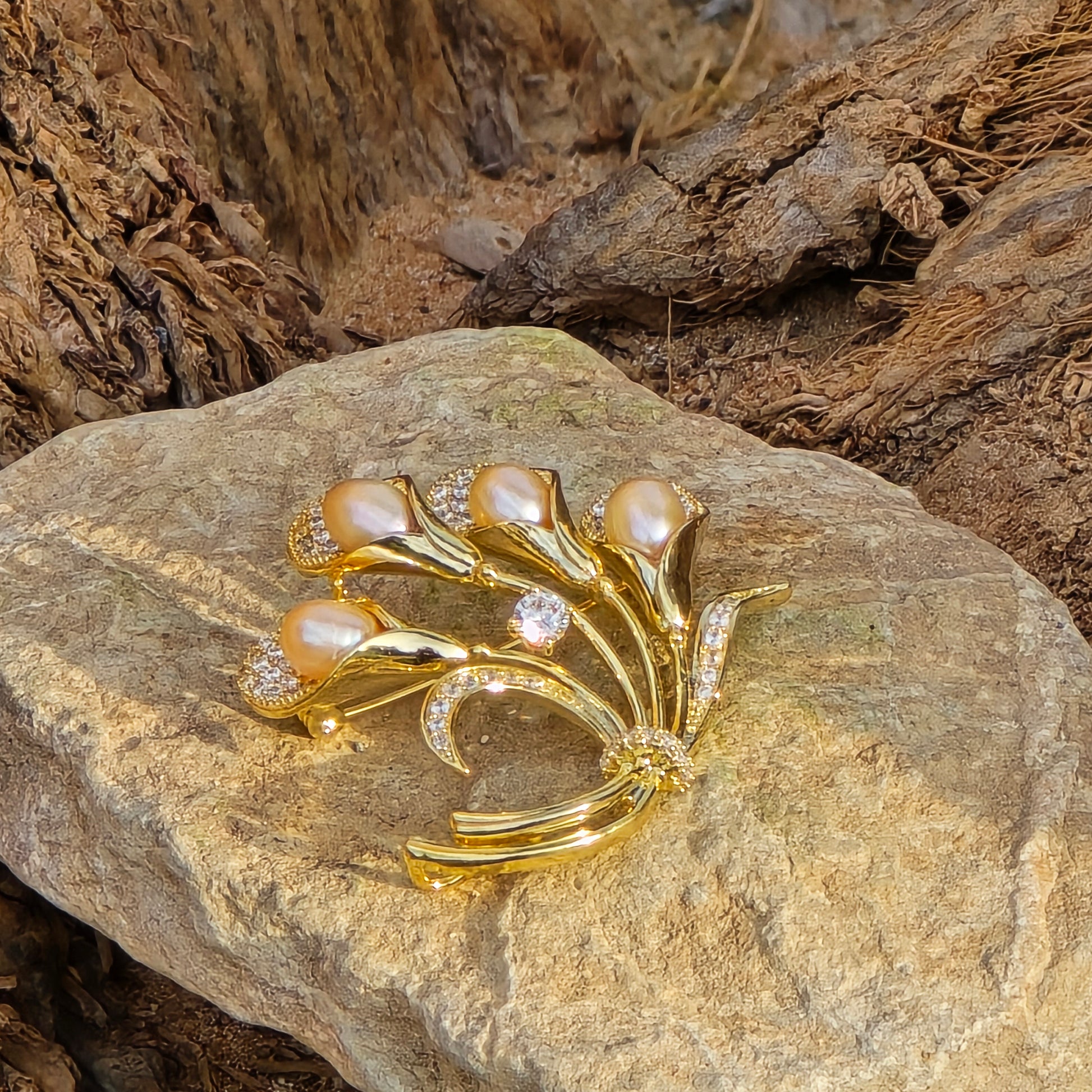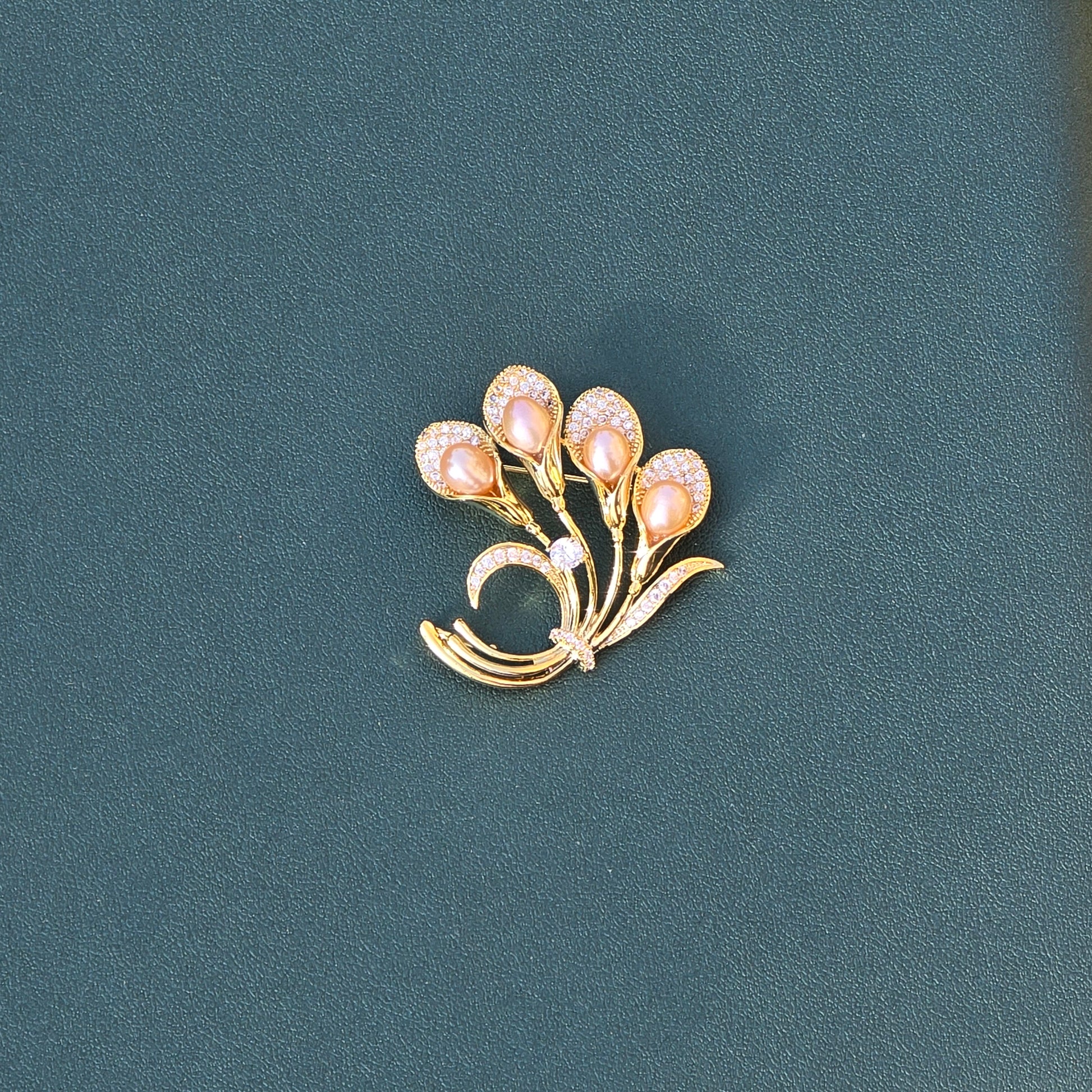 A graceful bouquet-shaped brooch crafted in a gold-plated stainless steel frame, featuring four delicate flowers made of peach-pink AAA-quality freshwater pearls. Each pearl is nestled against shimmering leaf designs inlaid with white CZ crystals, adding a soft sparkle to this timeless, nature-inspired piece.💛