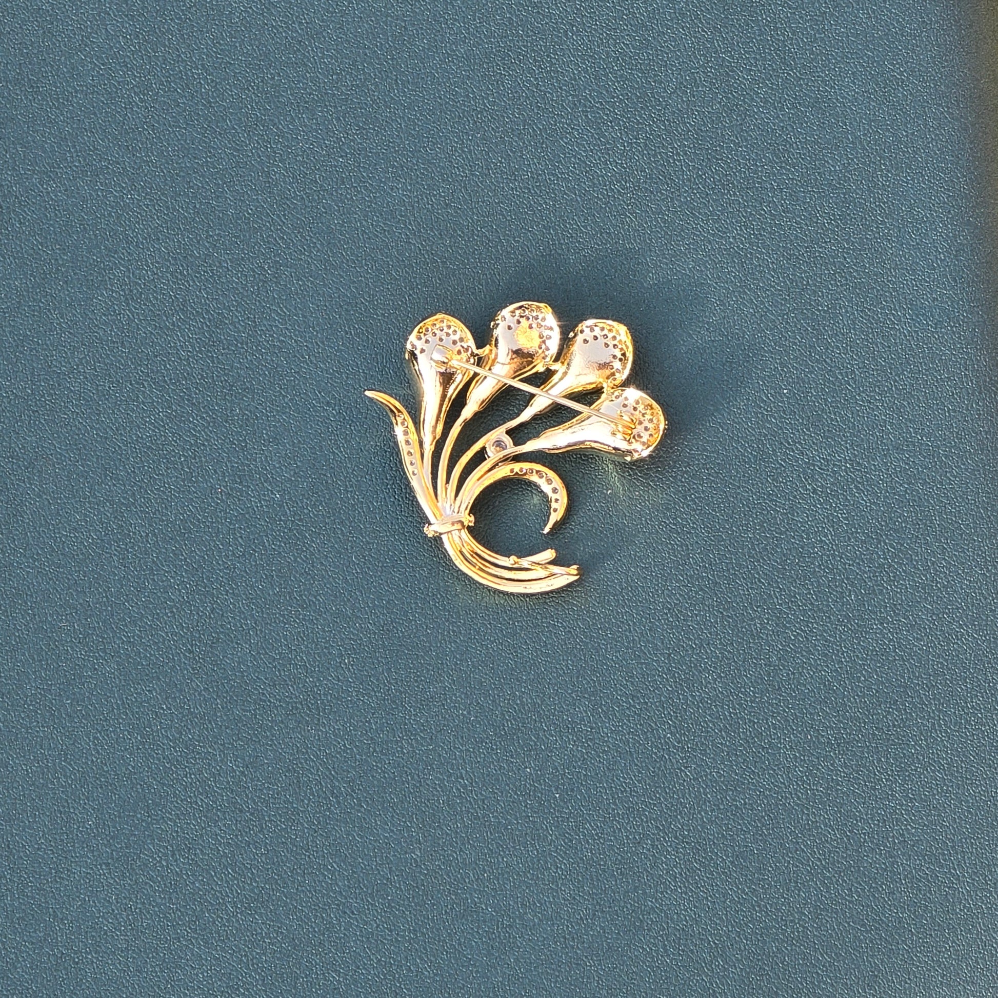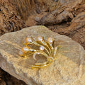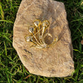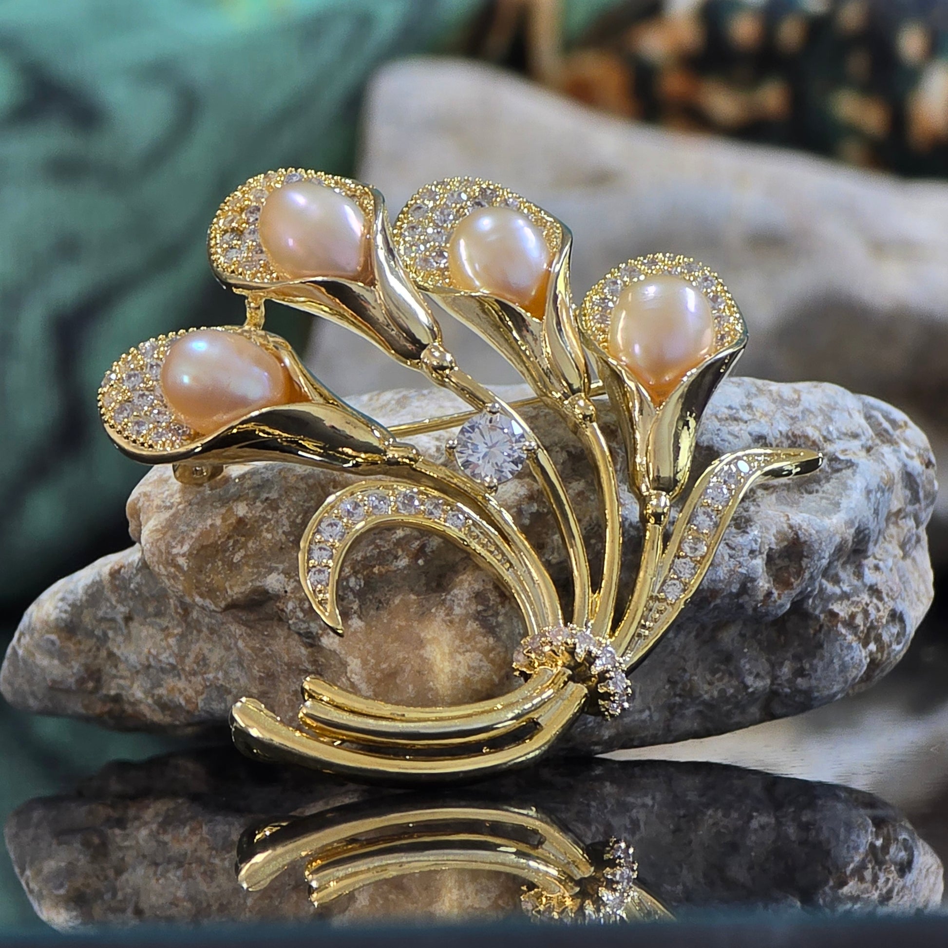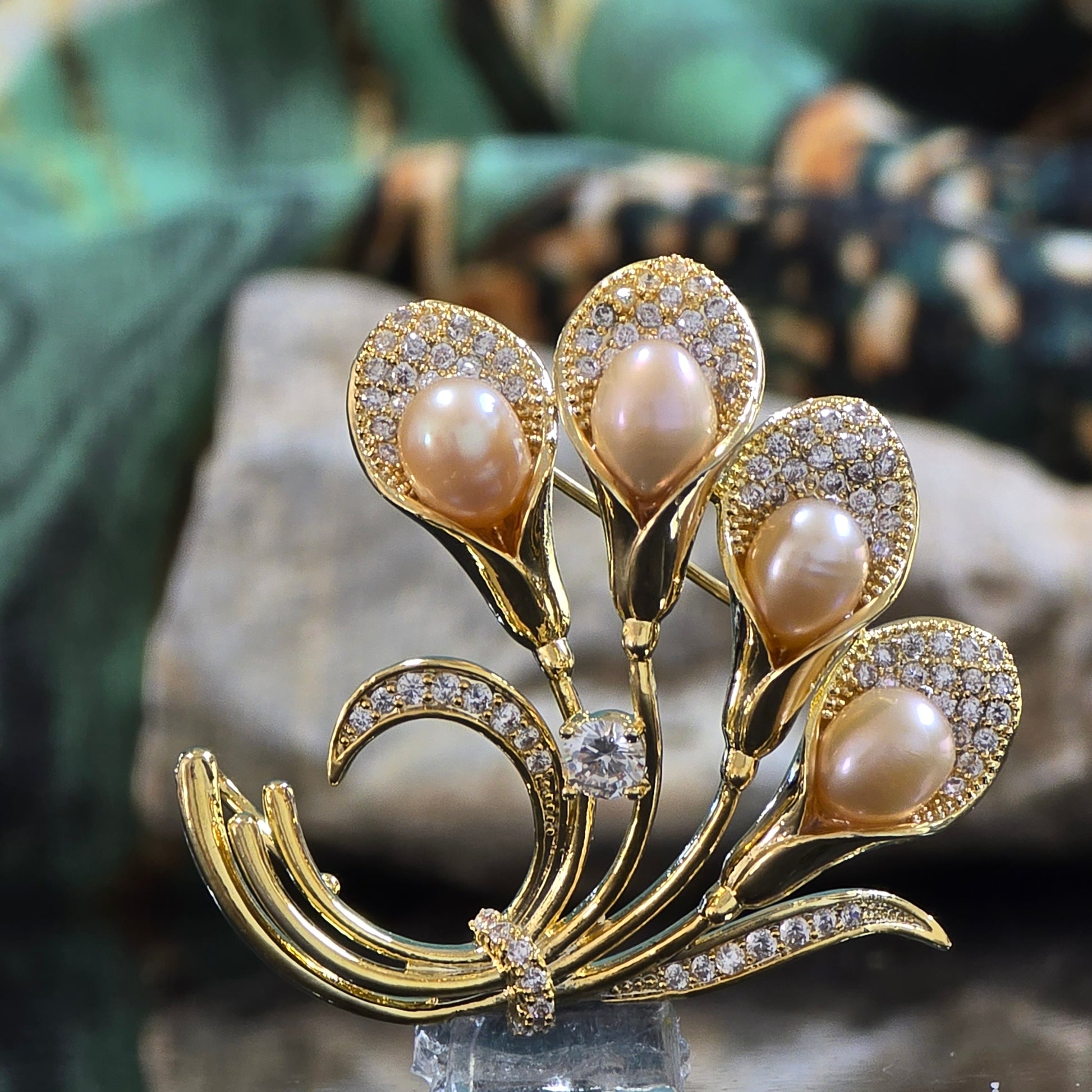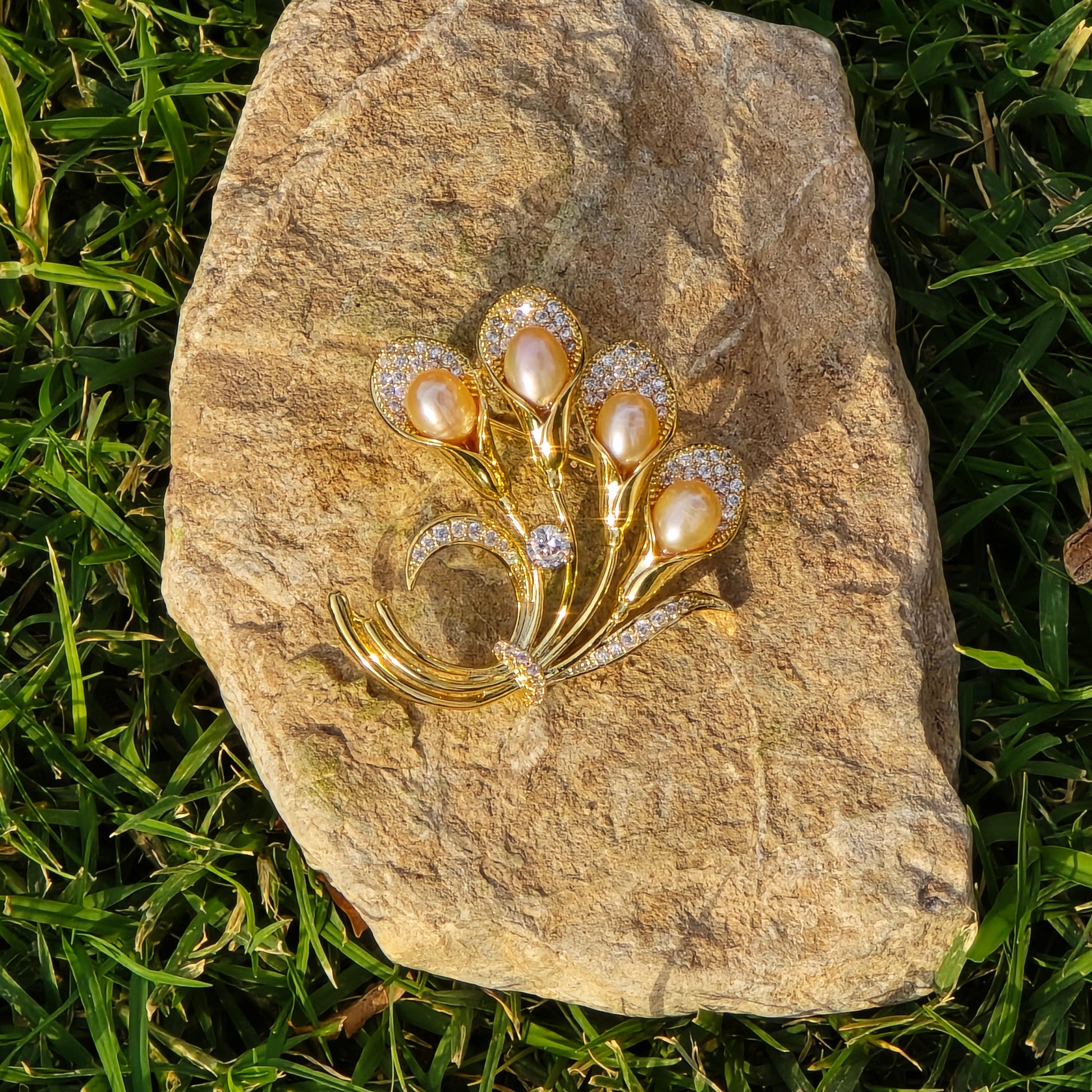 A graceful bouquet-shaped brooch crafted in a gold-plated stainless steel frame, featuring four delicate flowers made of peach-pink AAA-quality freshwater pearls. Each pearl is nestled against shimmering leaf designs inlaid with white CZ crystals, adding a soft sparkle to this timeless, nature-inspired piece.💛