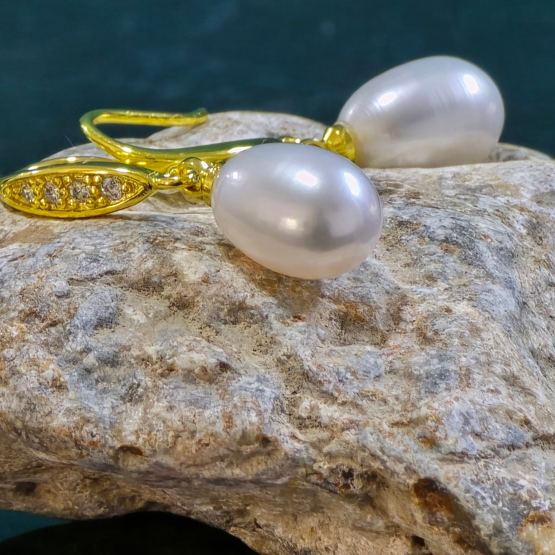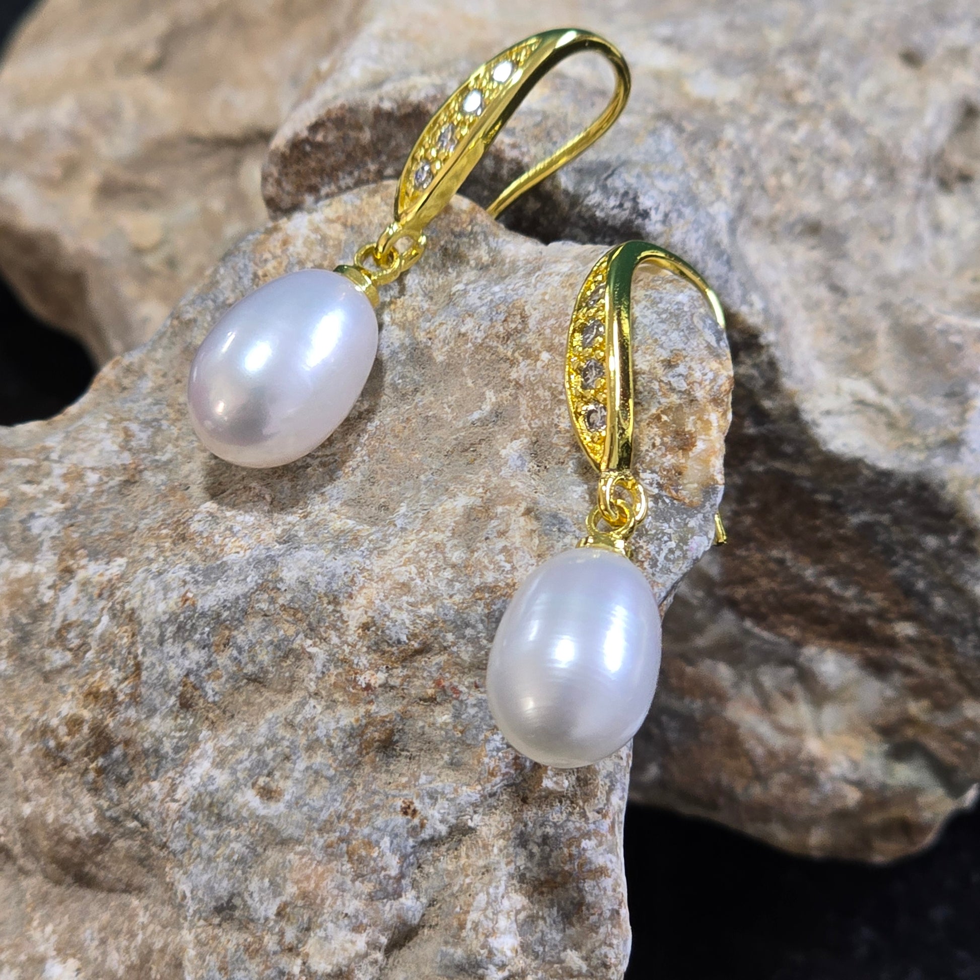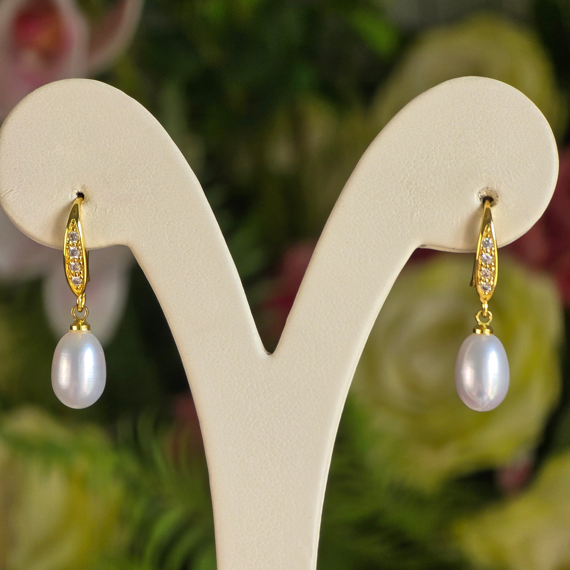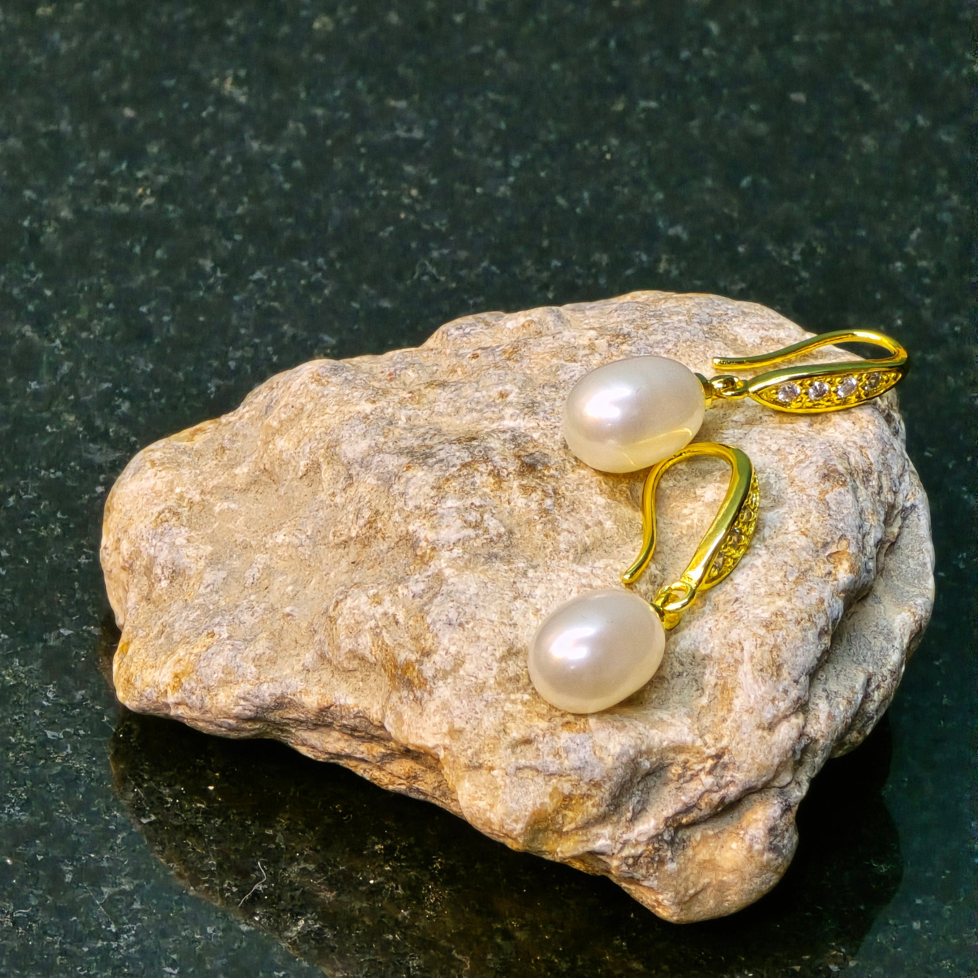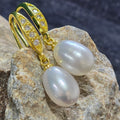 An oval-shaped, high-luster white freshwater pearl gracefully dangles from a gold-plated stainless steel hook, adorned with tiny white CZ crystals for a refined sparkle.💛
