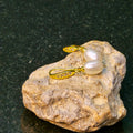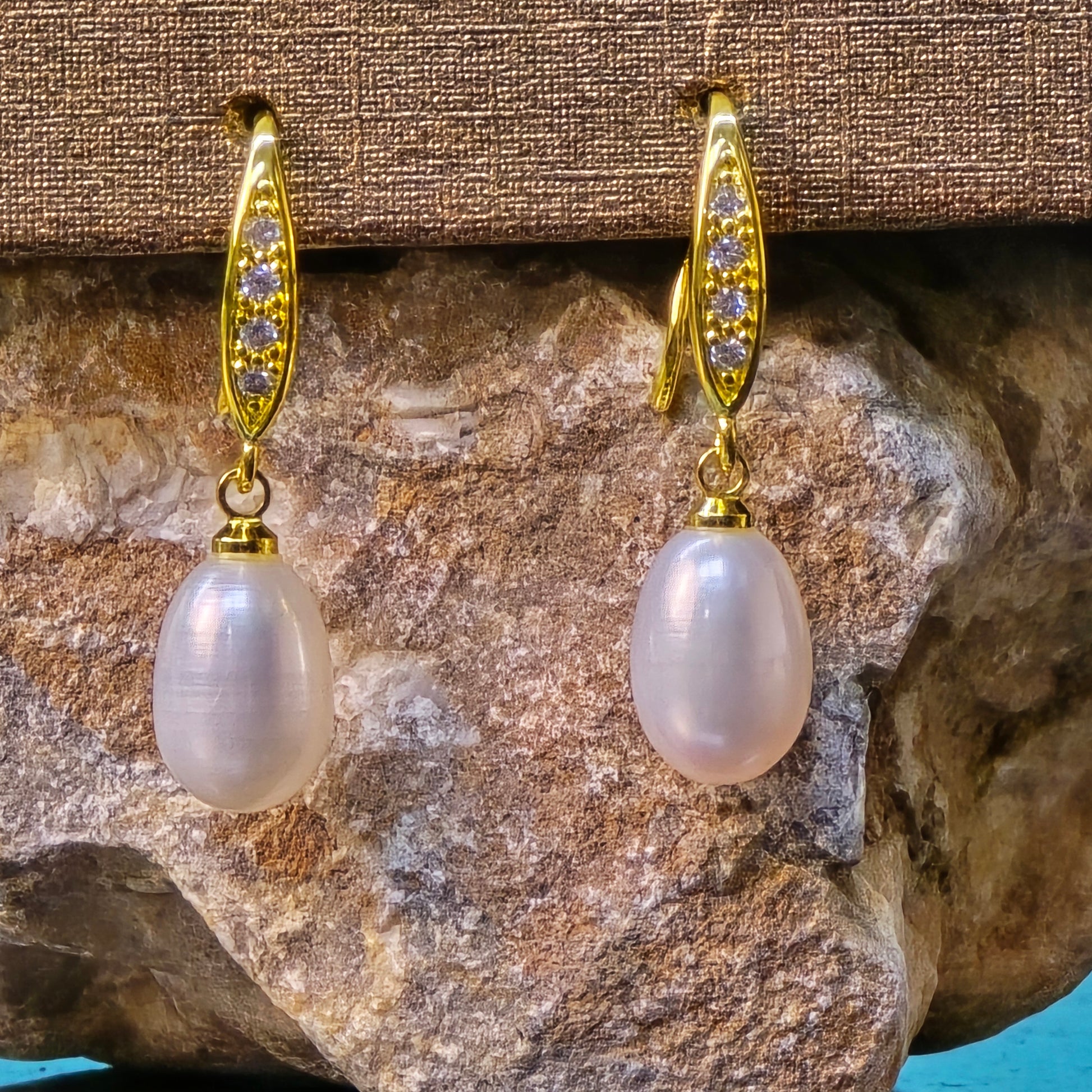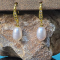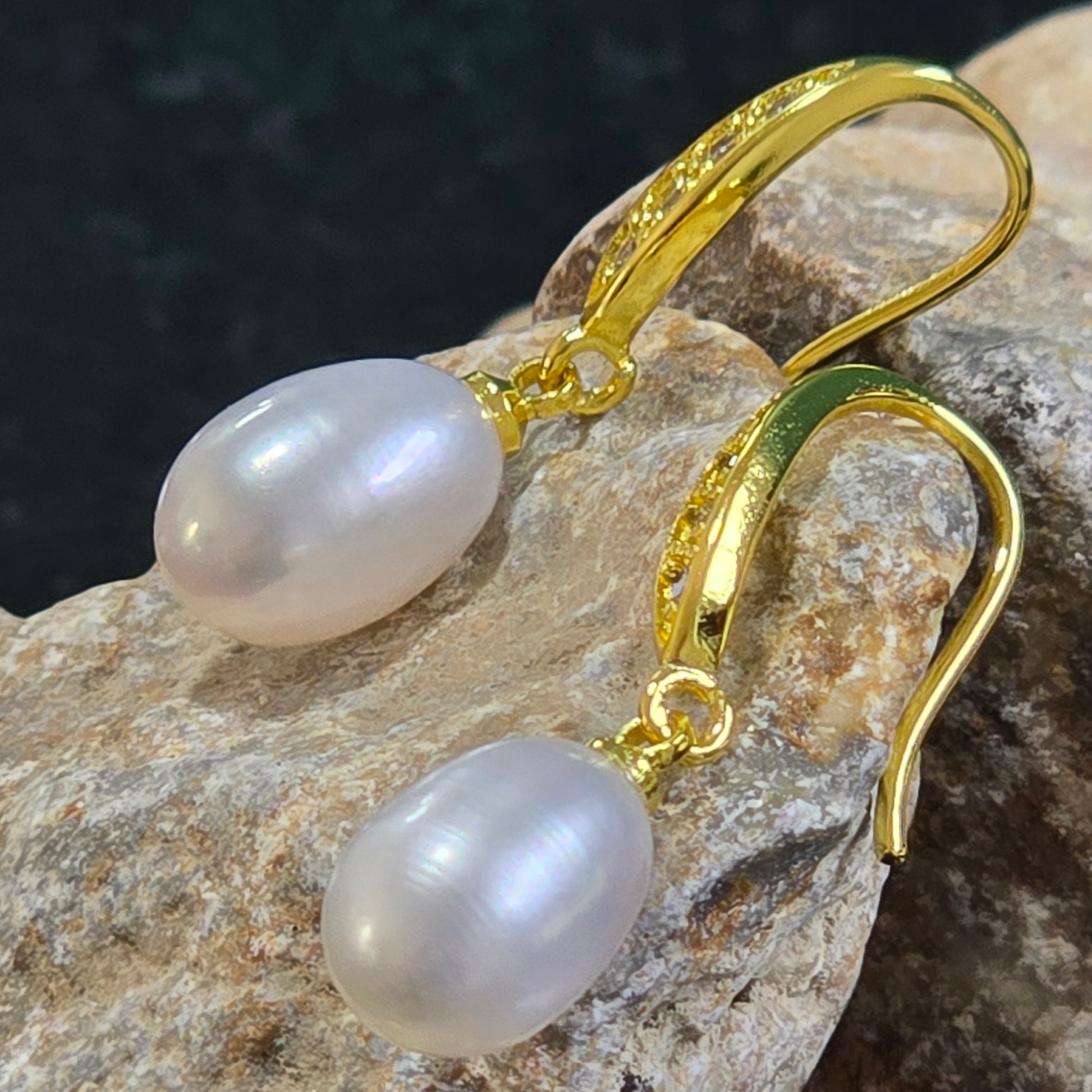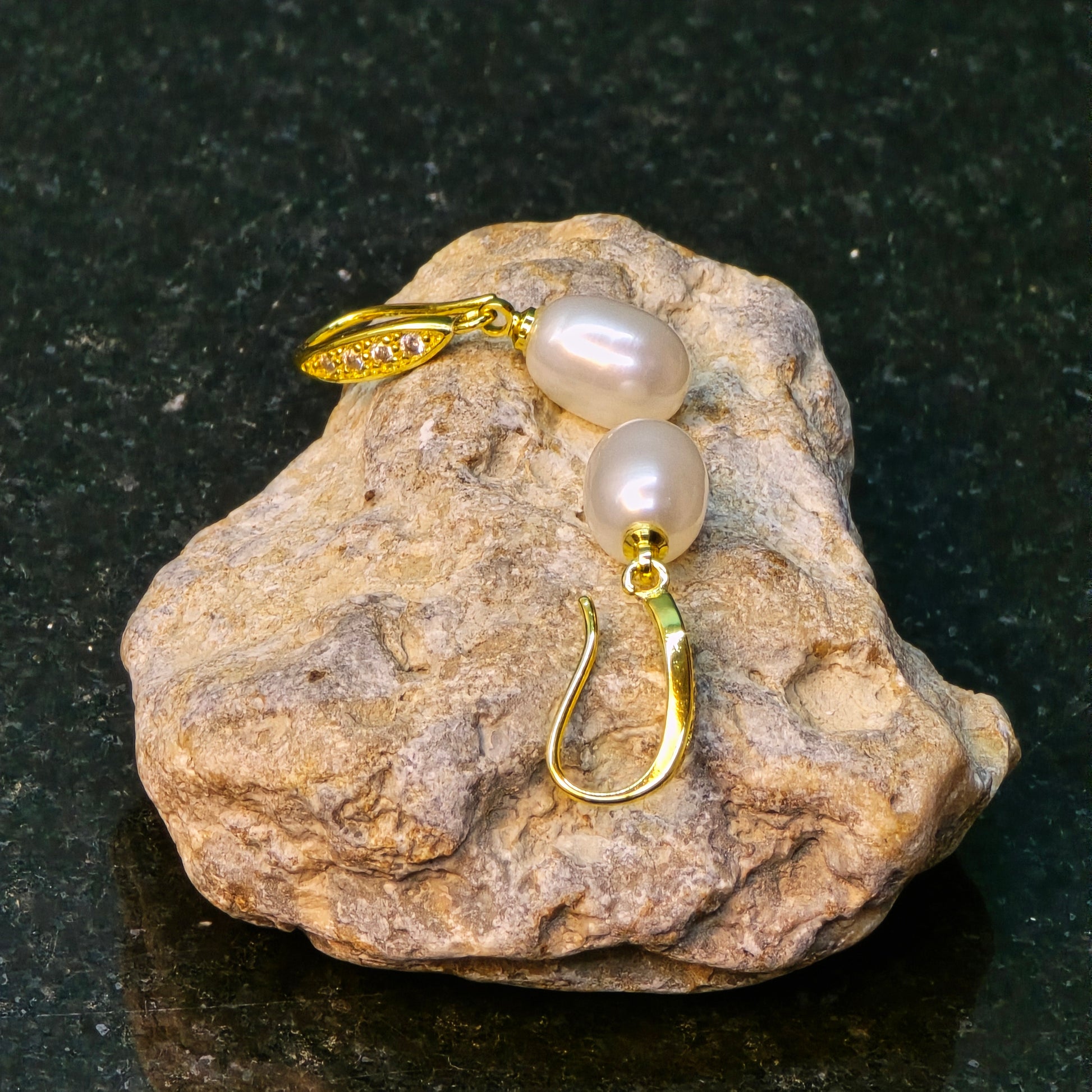 An oval-shaped, high-luster white freshwater pearl gracefully dangles from a gold-plated stainless steel hook, adorned with tiny white CZ crystals for a refined sparkle.💛