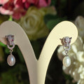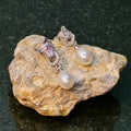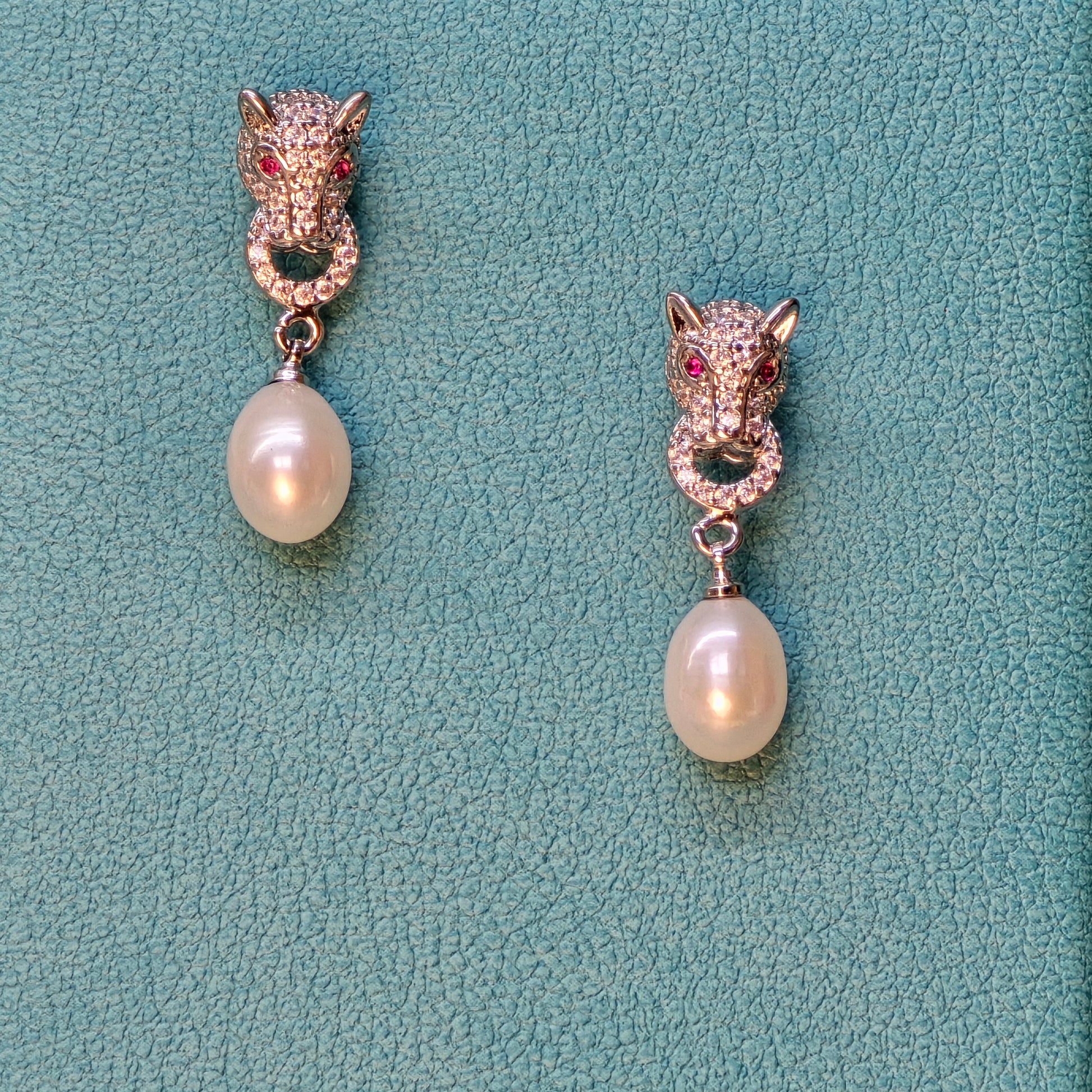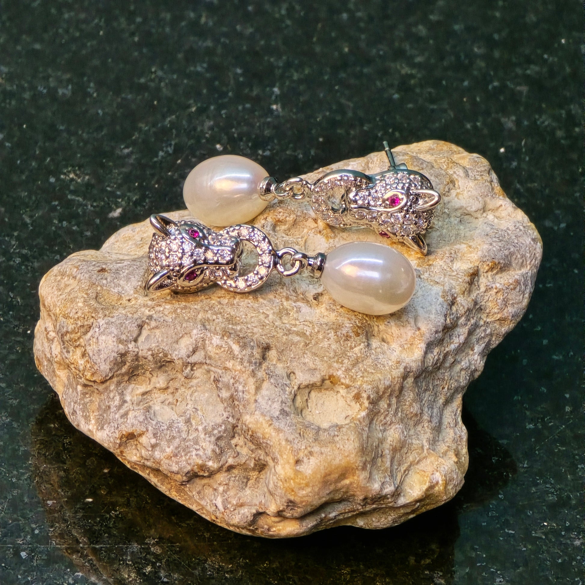 An oval-shaped, high-luster white freshwater pearl dangles from a sleek stainless steel stud, crowned with an elegant leopard head design adorned with tiny pavé CZ crystals for a bold yet refined statement.💛