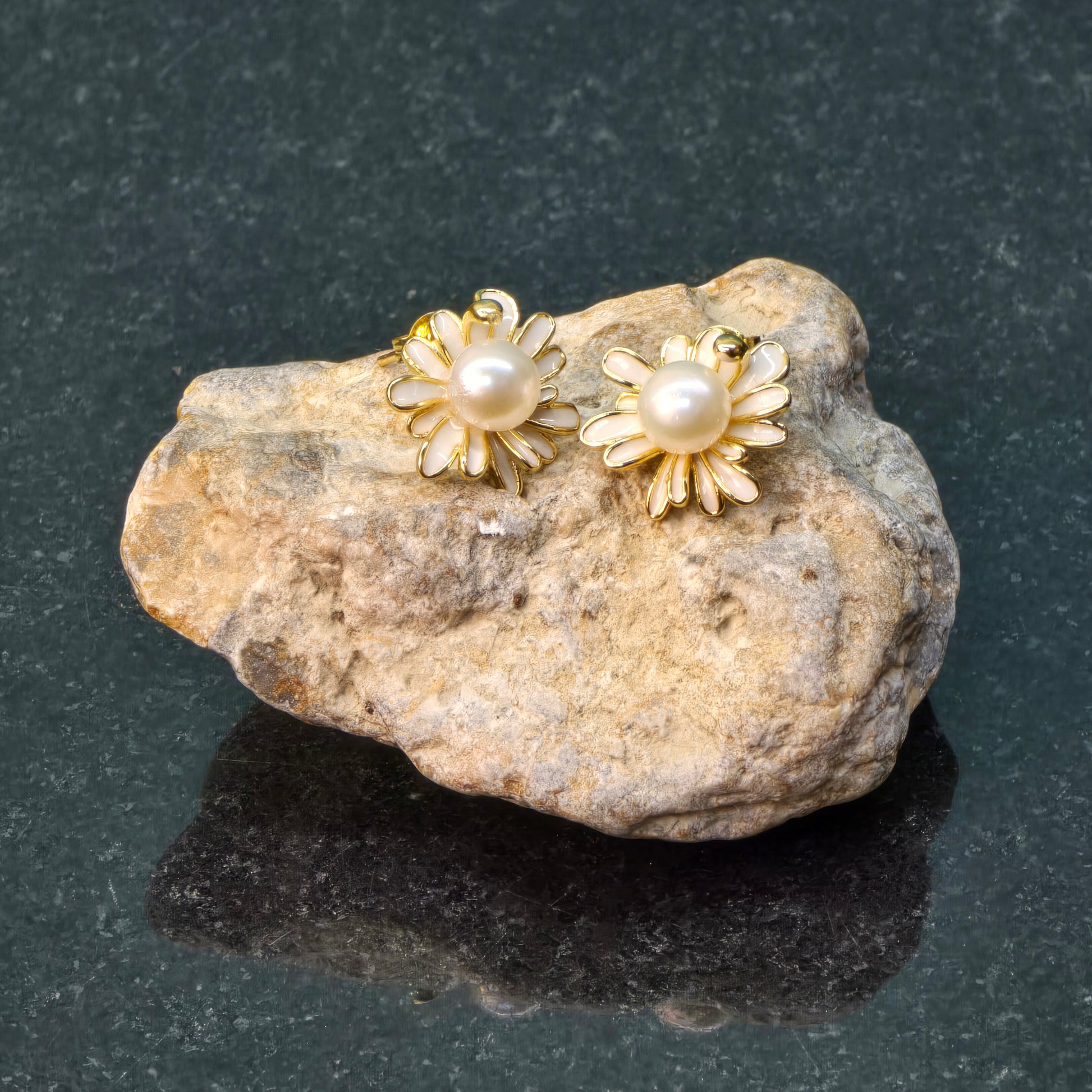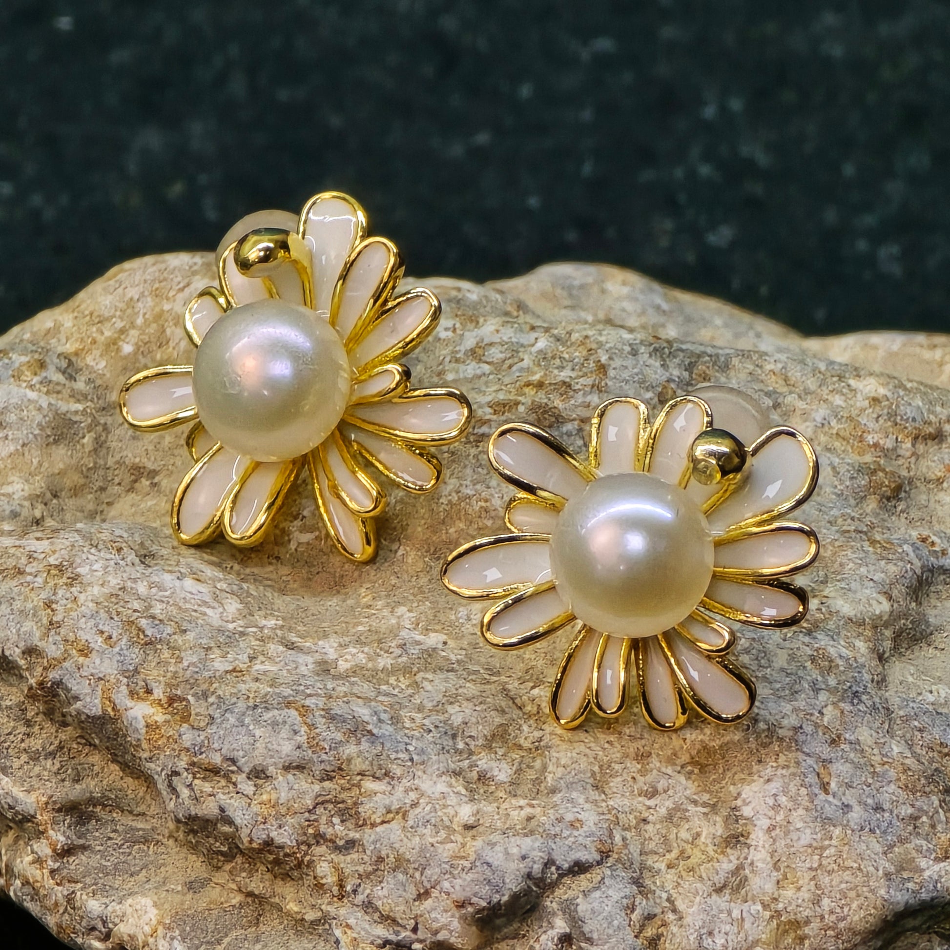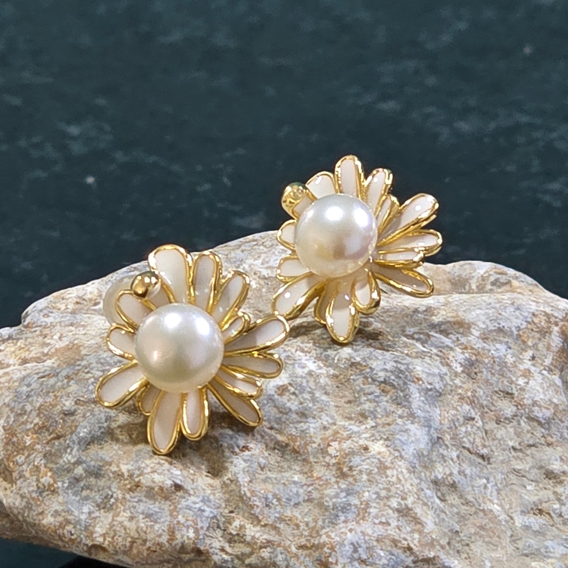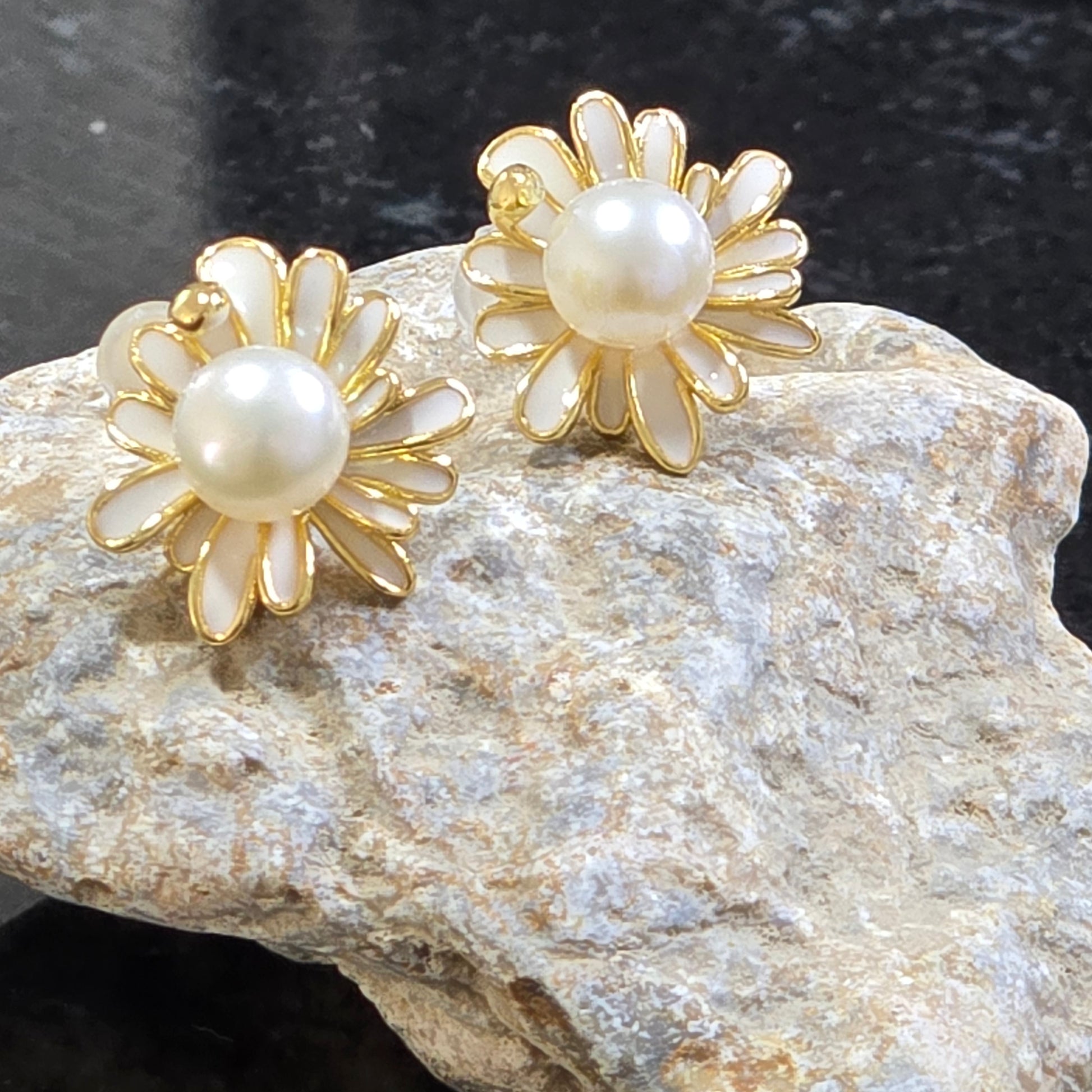 A high-luster white freshwater pearl blooms at the center of a daisy-shaped white enamel flower, set in gold-plated stainless steel for a fresh, elegant touch.