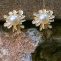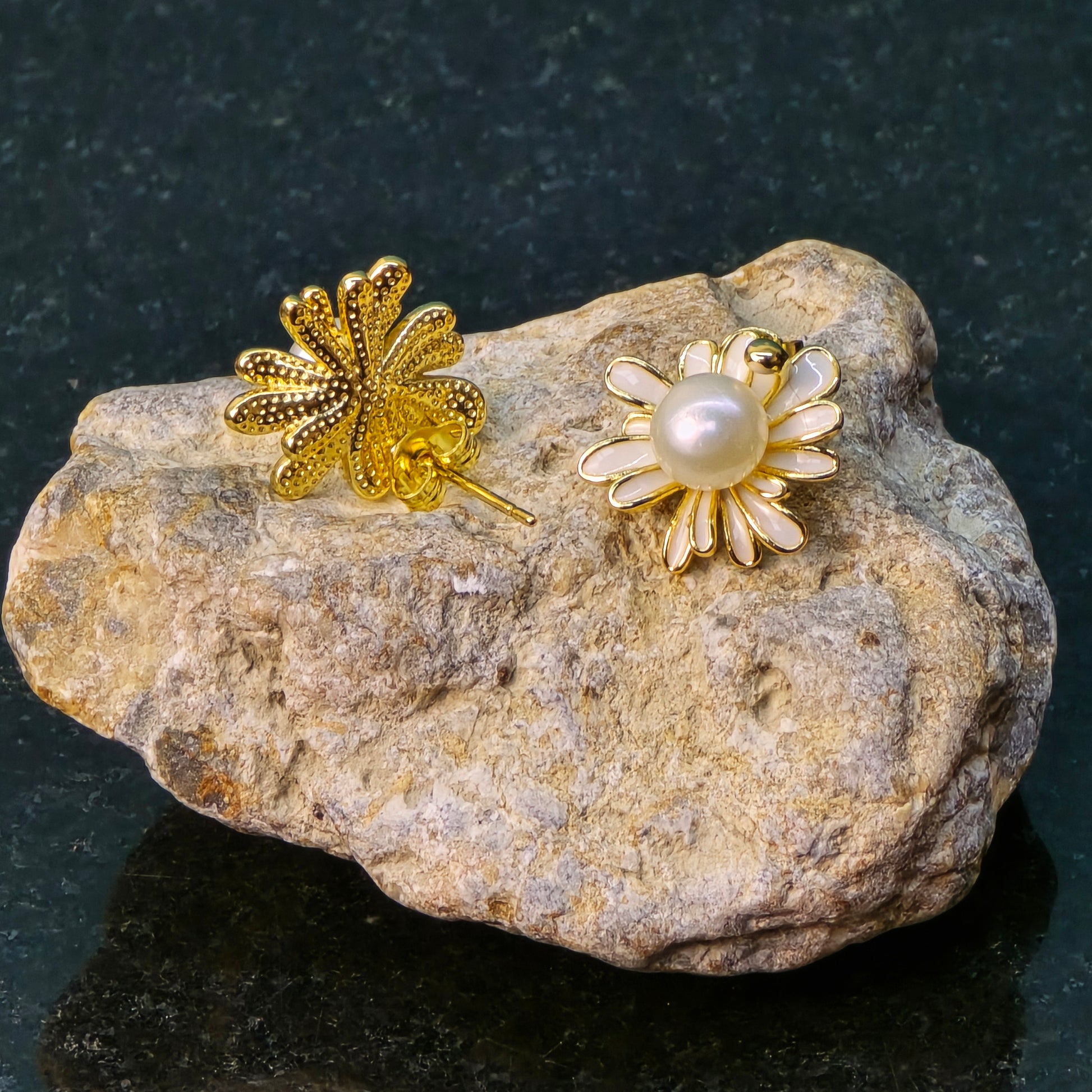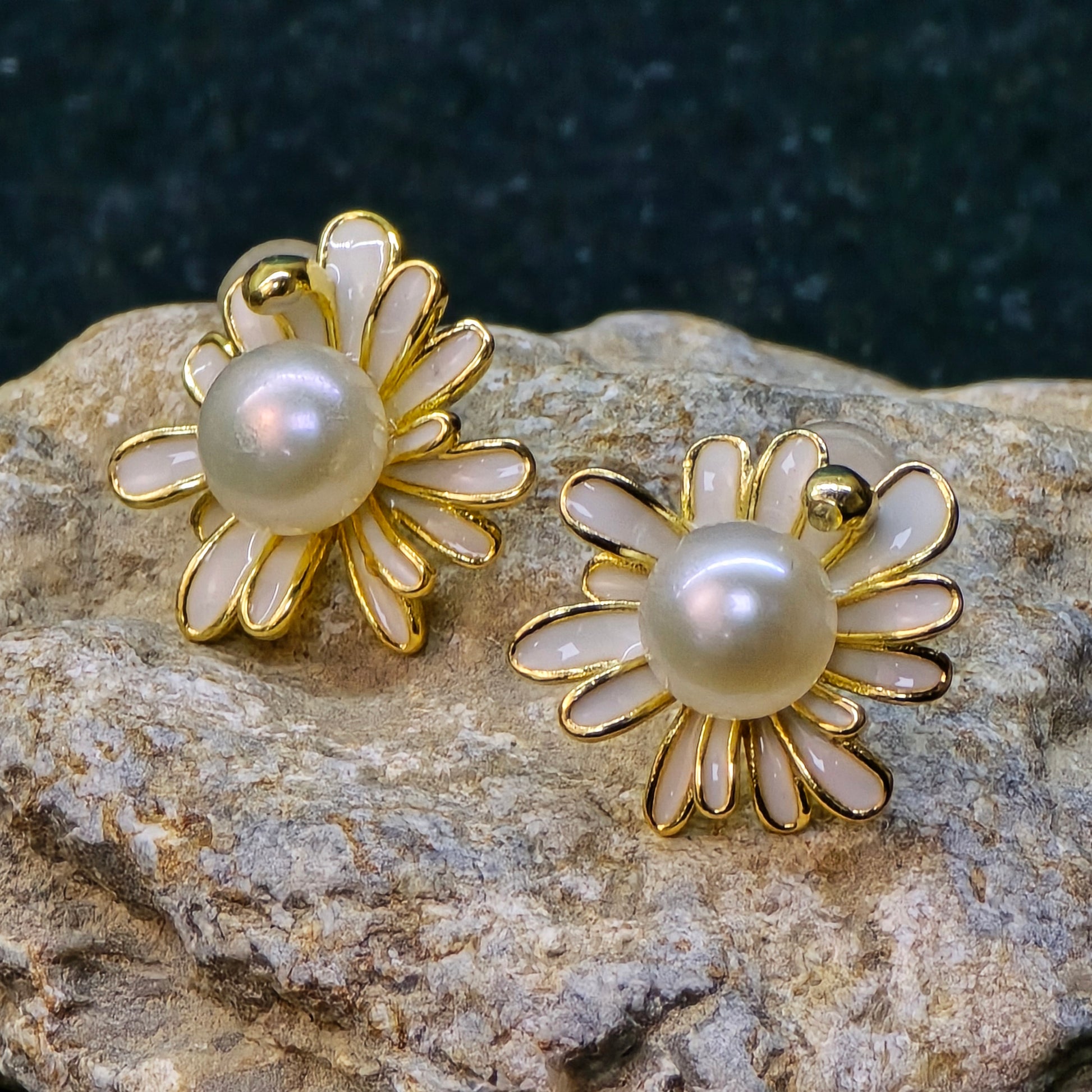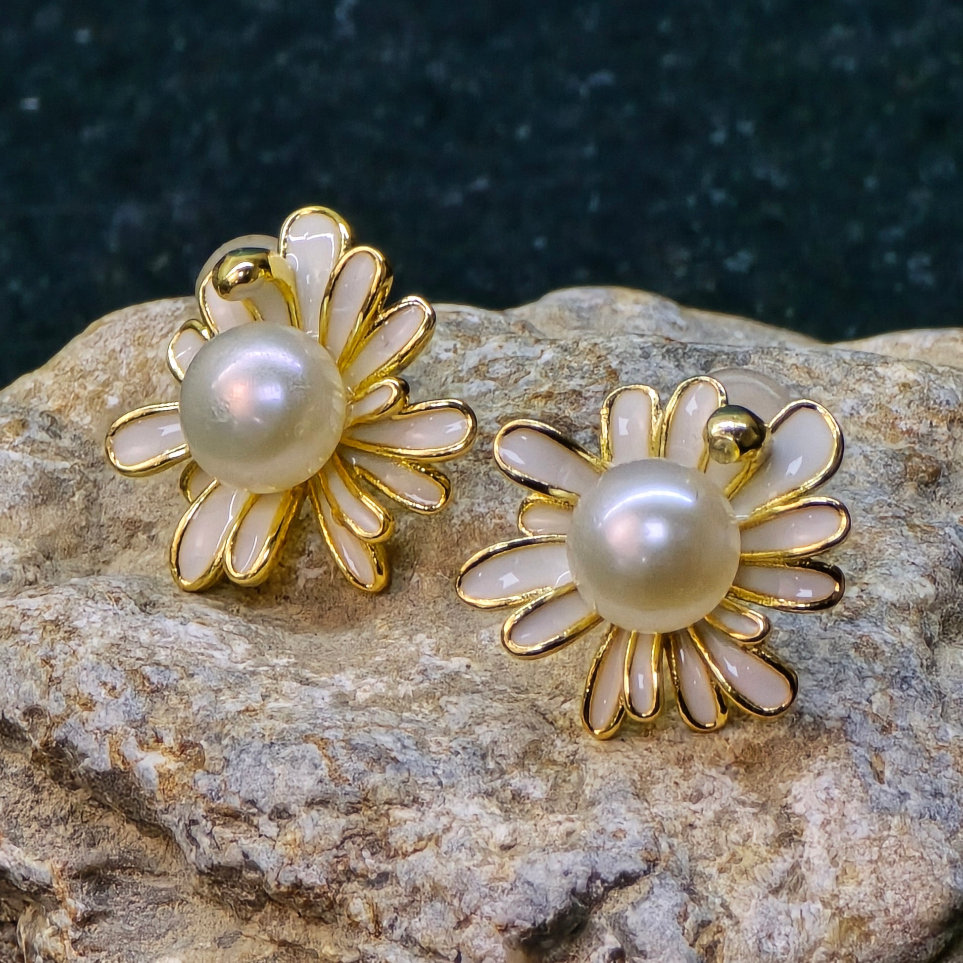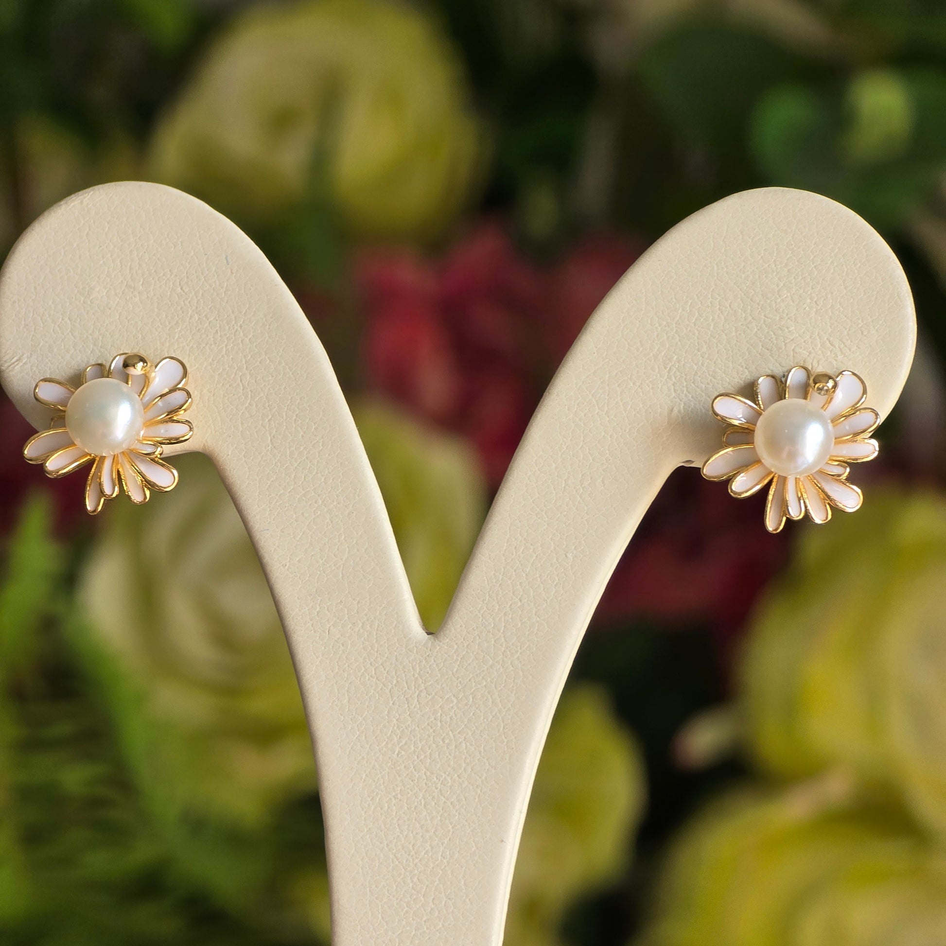 A high-luster white freshwater pearl blooms at the center of a daisy-shaped white enamel flower, set in gold-plated stainless steel for a fresh, elegant touch.