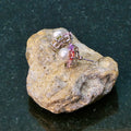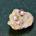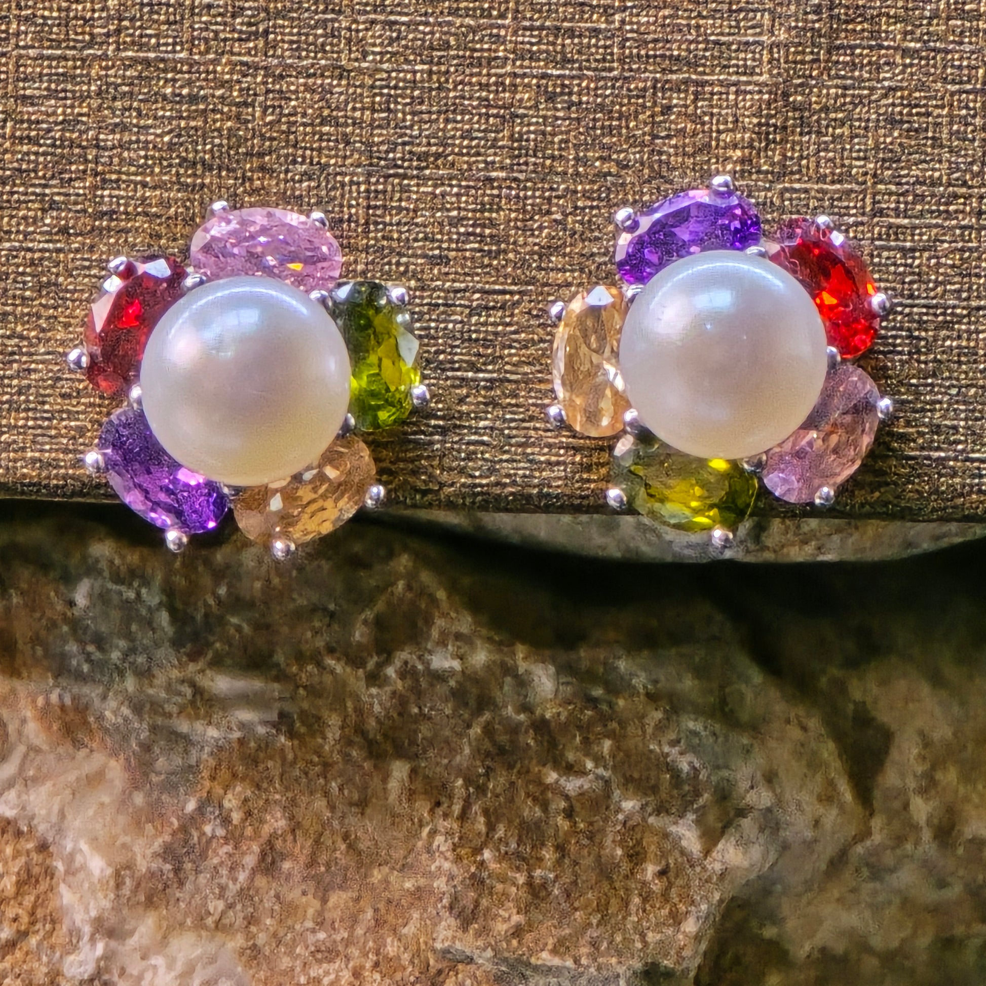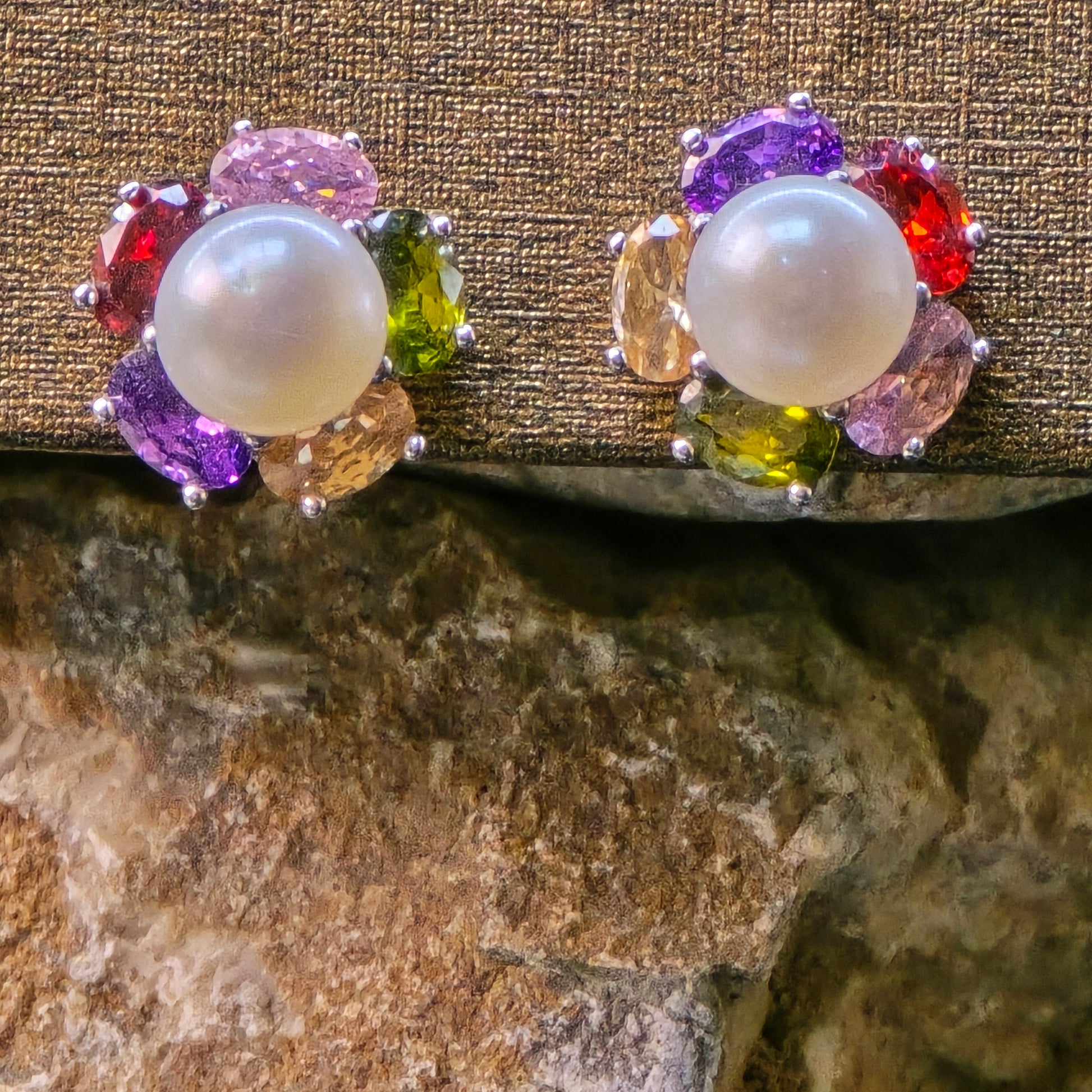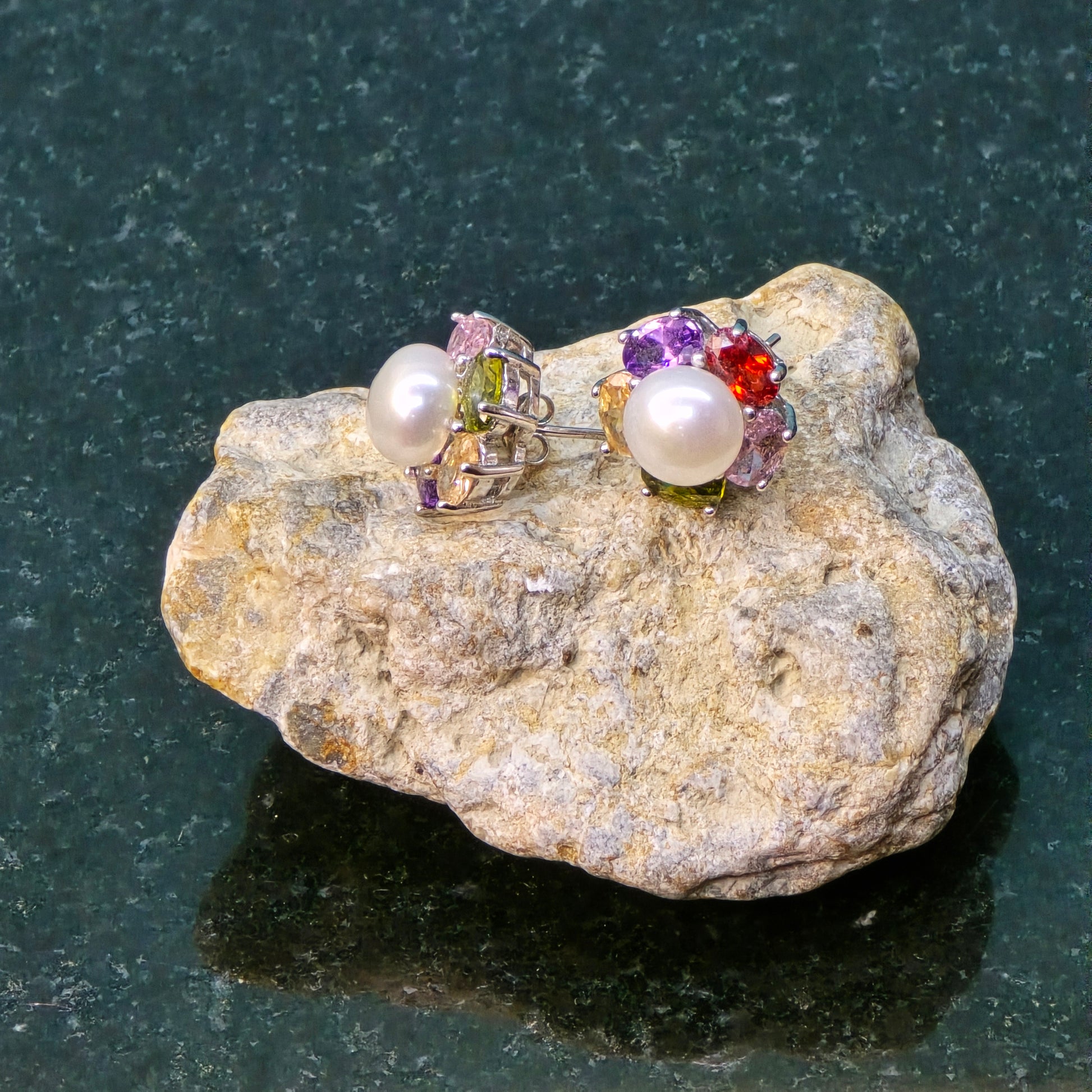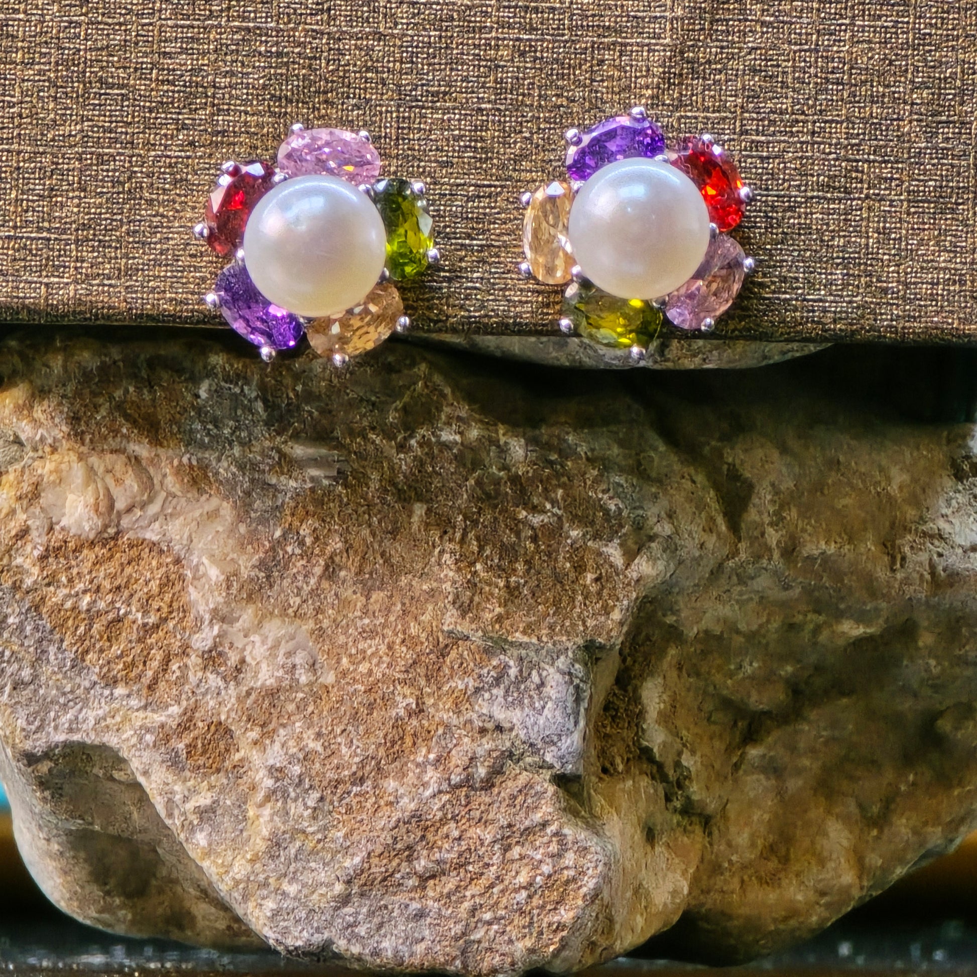A captivating floral design featuring a high-luster white freshwater pearl a,t the center, surrounded by sparkling green, pink, purple, and red CZ crystals all set in durable stainless steel.